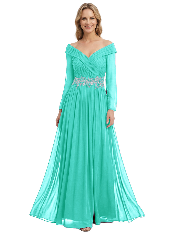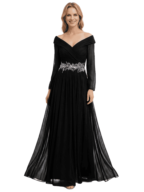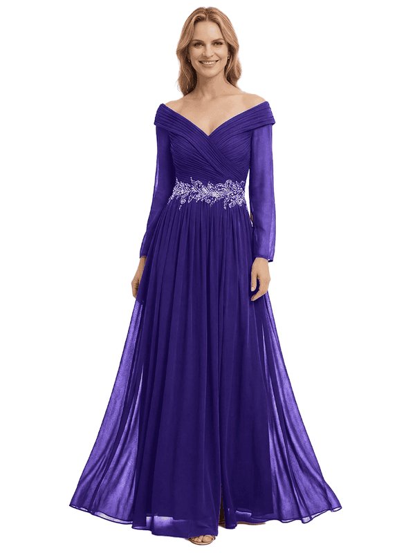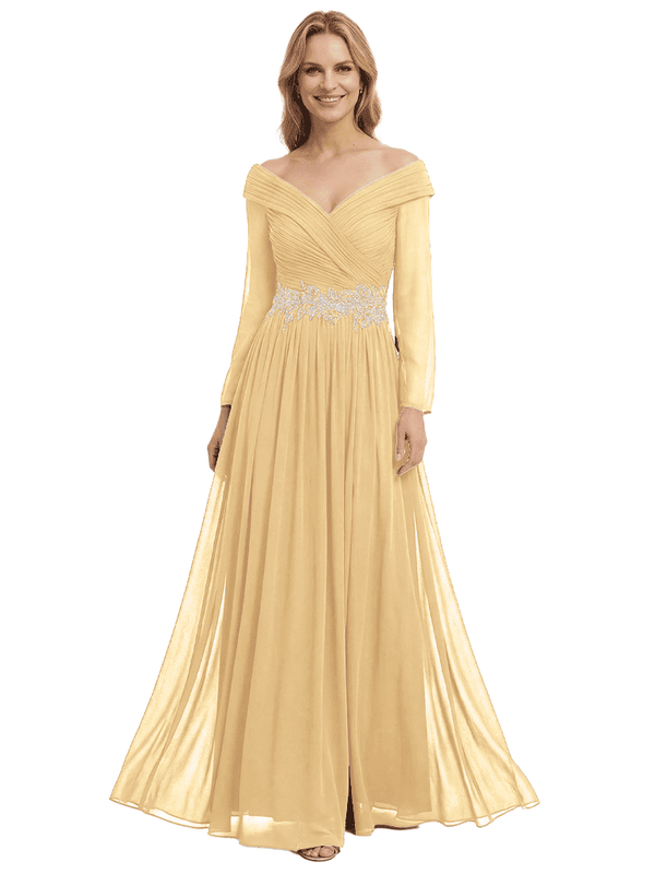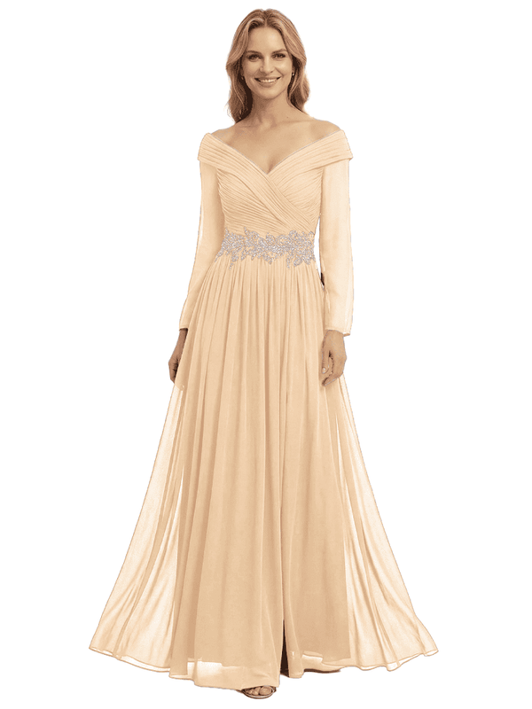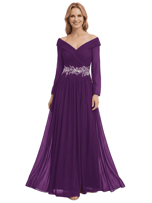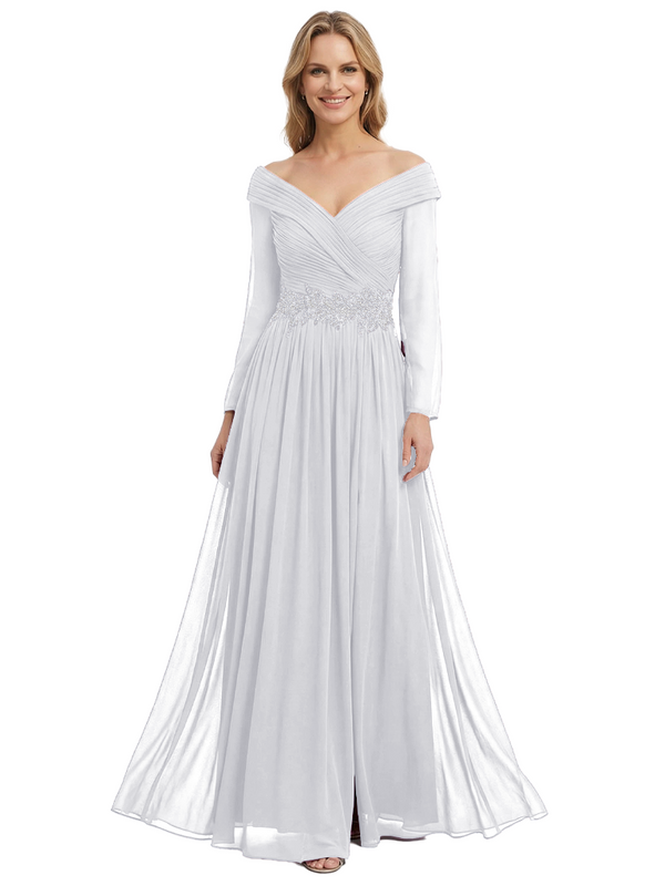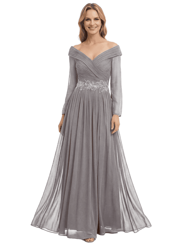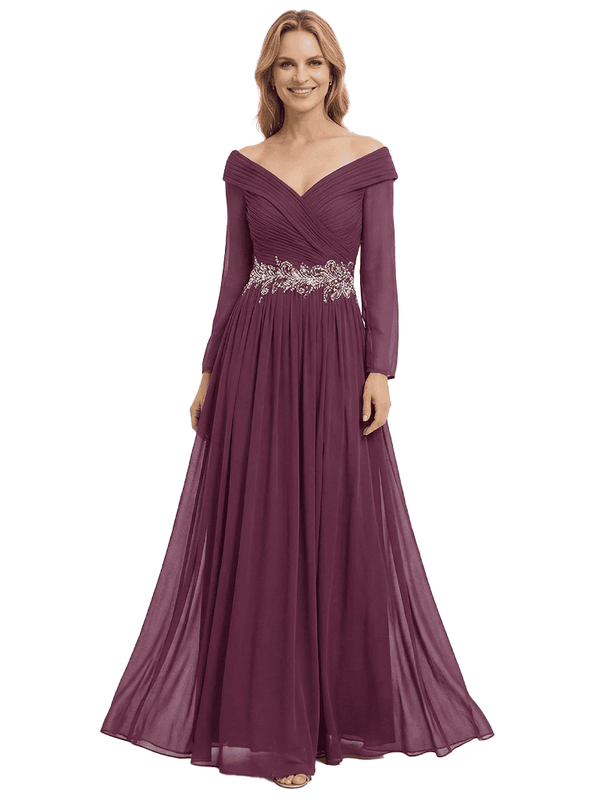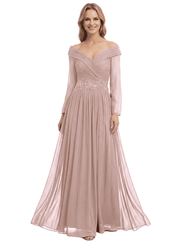 Chicsew V-Neck Long Sleeves Mother Of The Bride Dress Ruched Chiffon A-Line Gown - ChicSew