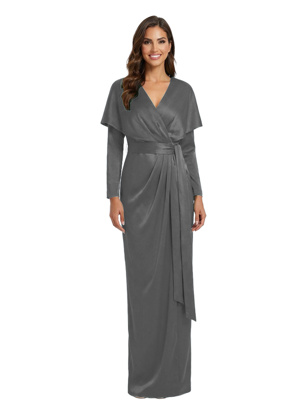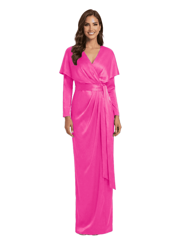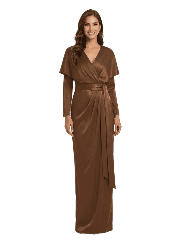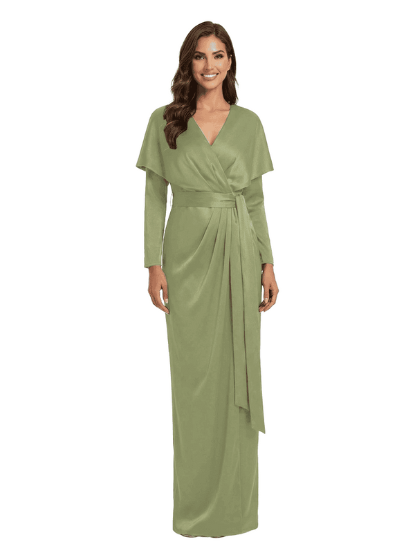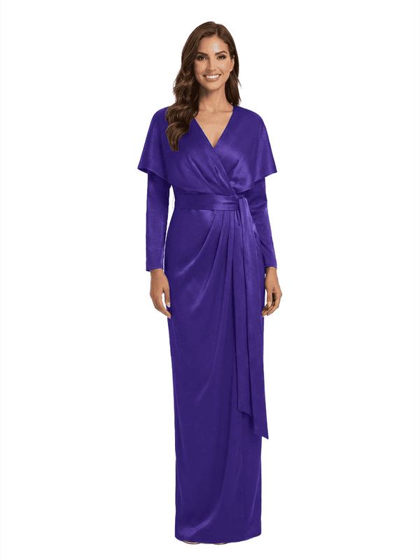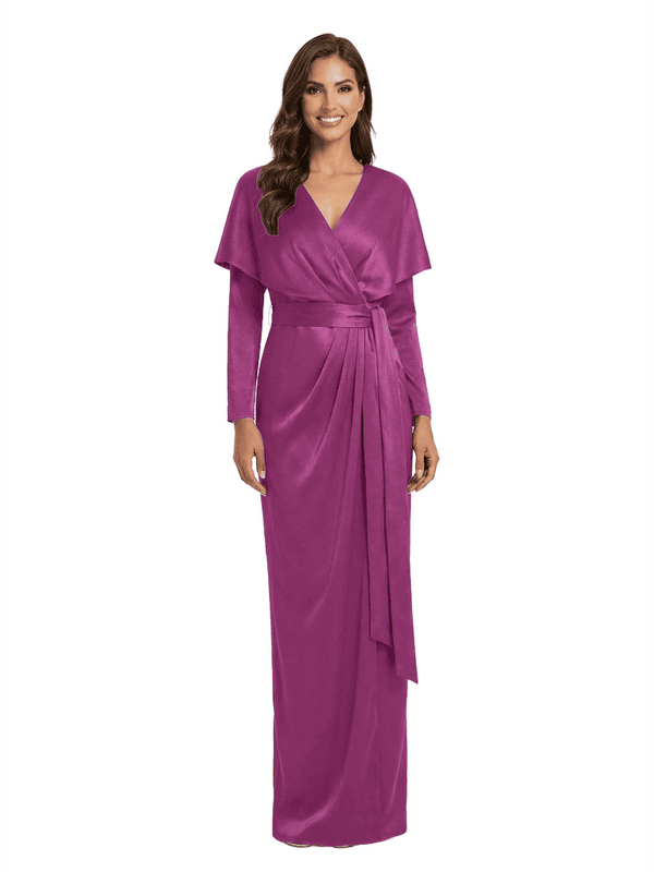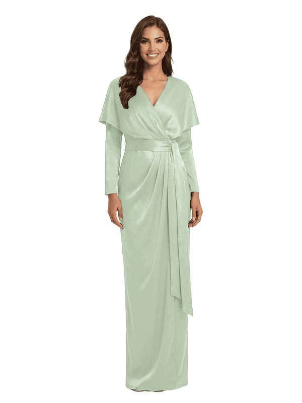 Chicsew Mother of The Bride Dresses V-Neck Long Sleeve Satin Capelet Maxi Gown Classy Belted Formal Wedding Event Attire