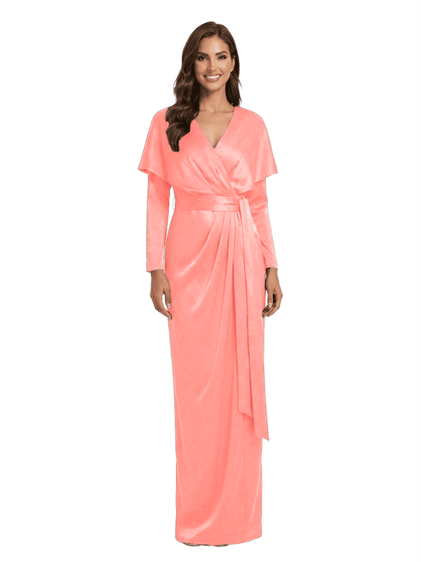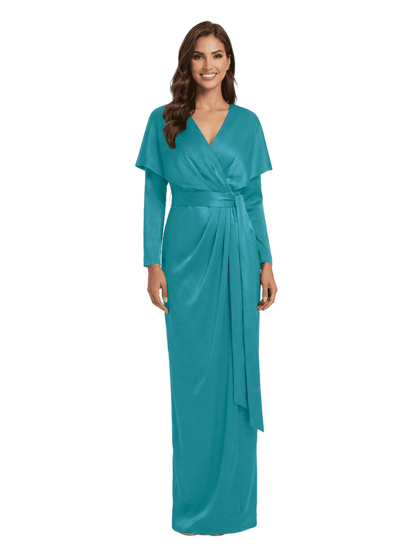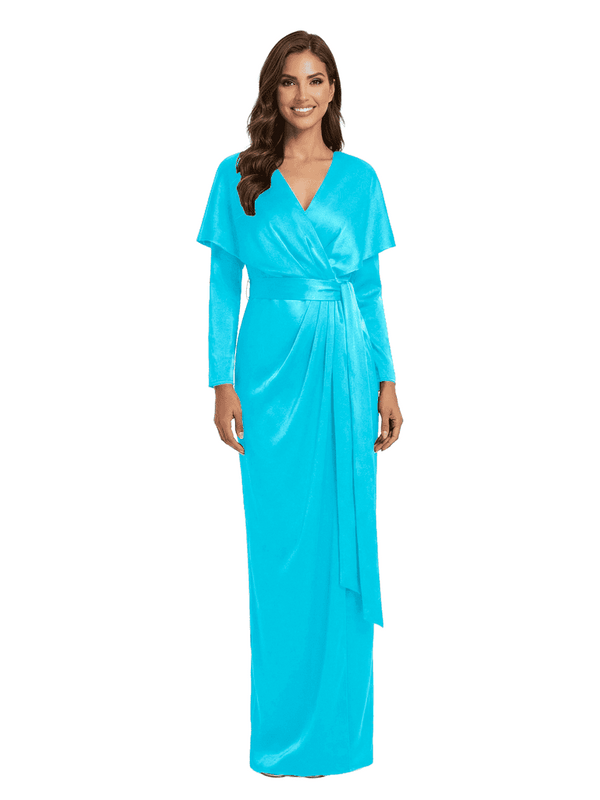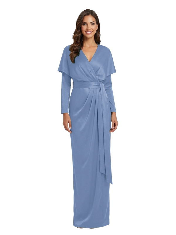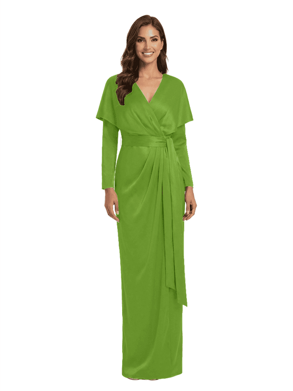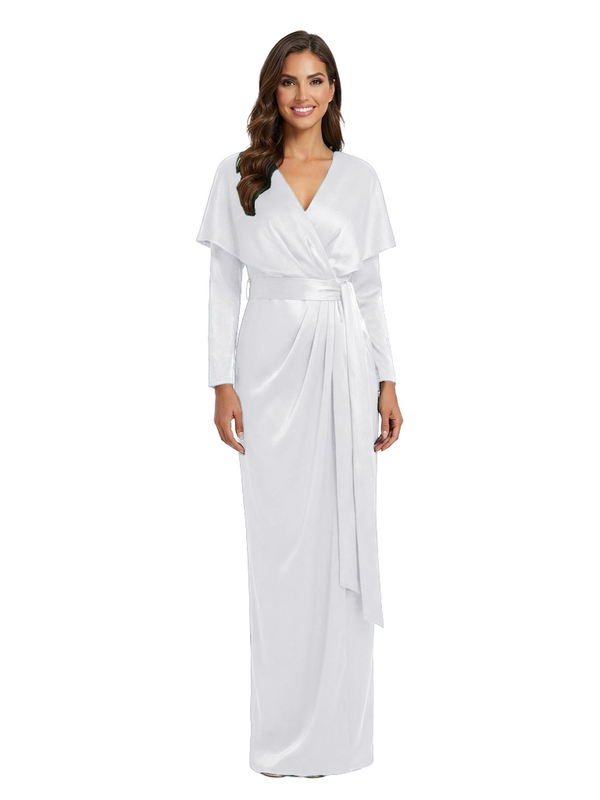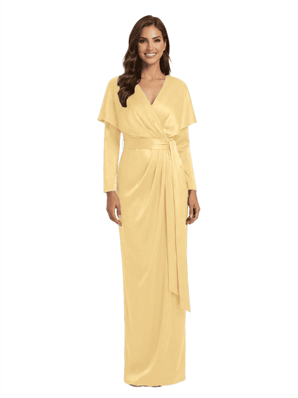 Chicsew Mother of The Bride Dresses V-Neck Long Sleeve Satin Capelet Maxi Gown Classy Belted Formal Wedding Event Attire