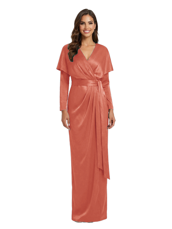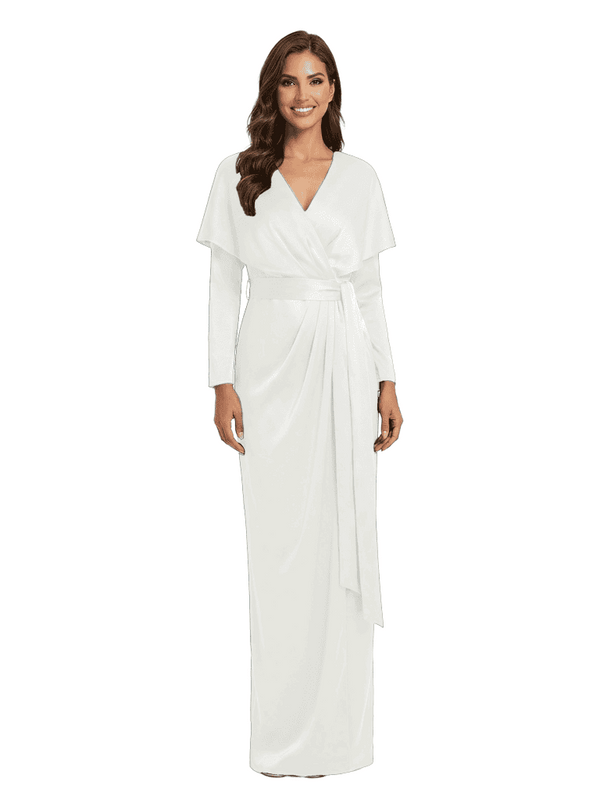 Chicsew Mother of The Bride Dresses V-Neck Long Sleeve Satin Capelet Maxi Gown Classy Belted Formal Wedding Event Attire - ChicSew