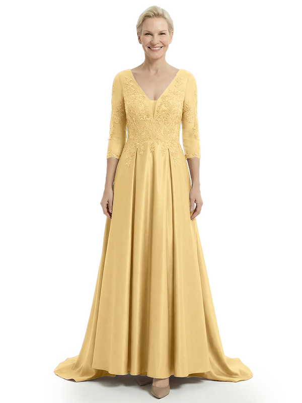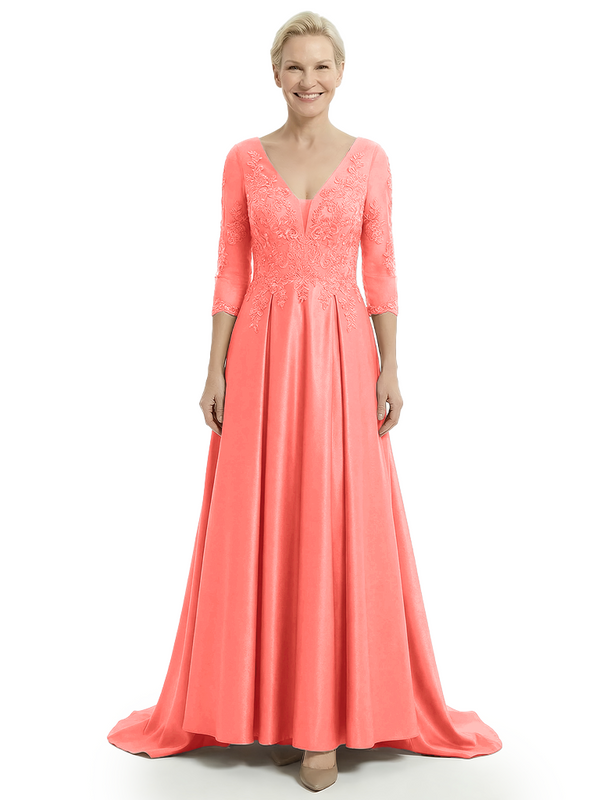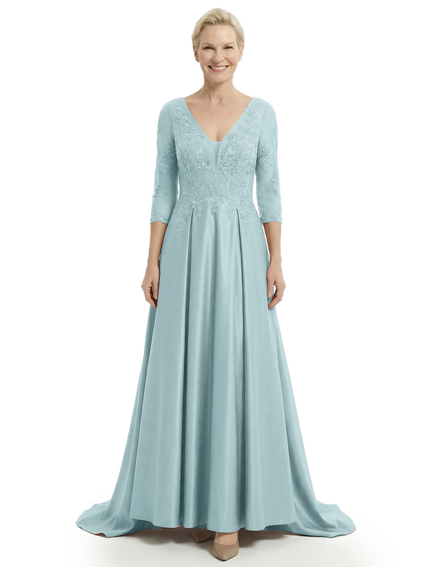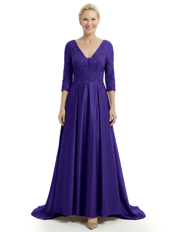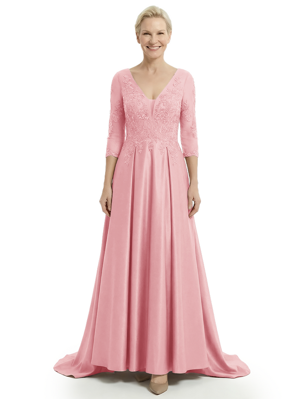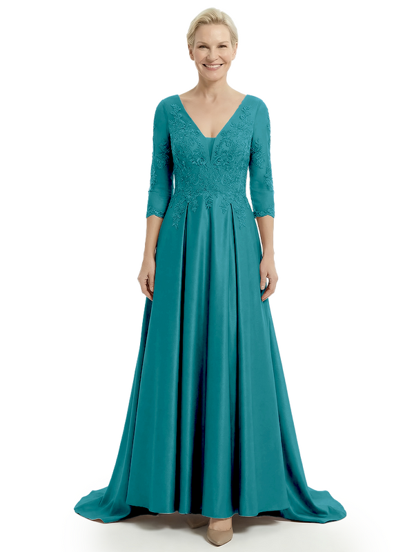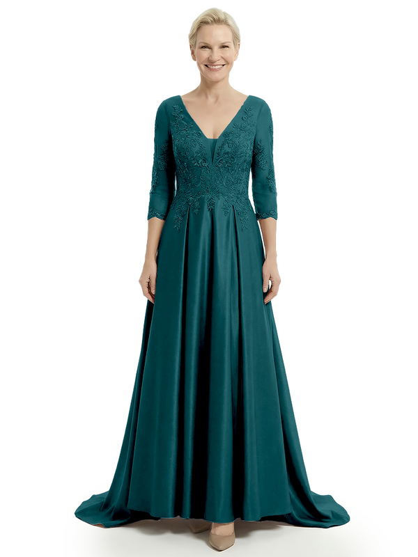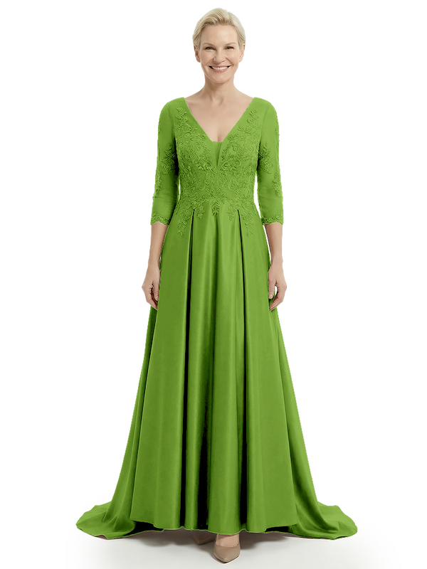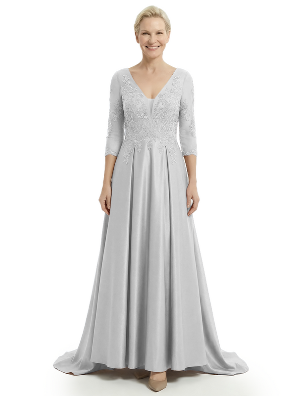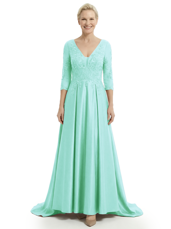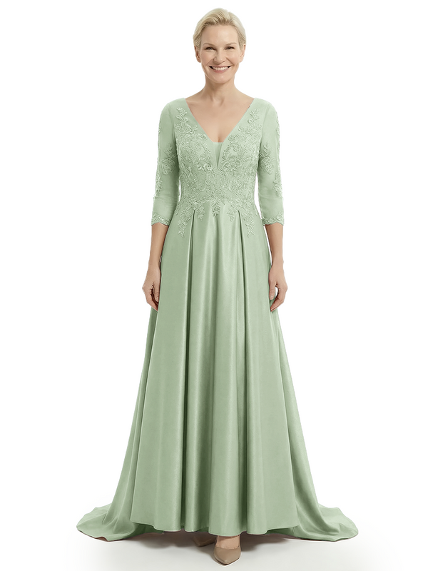 Unique Applique Mother Of The Groom Dress V-Neck 3/4 Sleeves Satin A-Line Gown - ChicSew