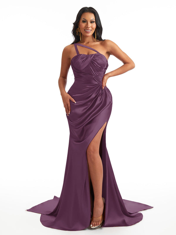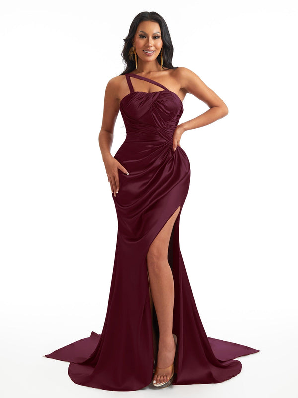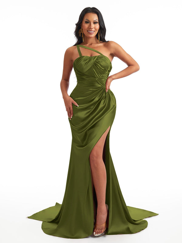 Sexy One Shoulder Ruched Side Slit Mermaid Soft Satin Long Bridesmaid Dresses Online - ChicSew