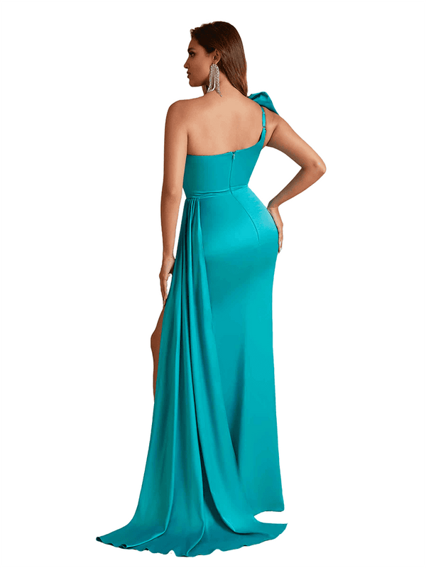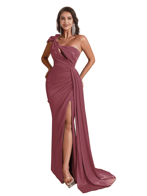 Sexy One Shoulder Bow Knot Side Split Mermaid Silky Satin Long Bridesmaid Dresses