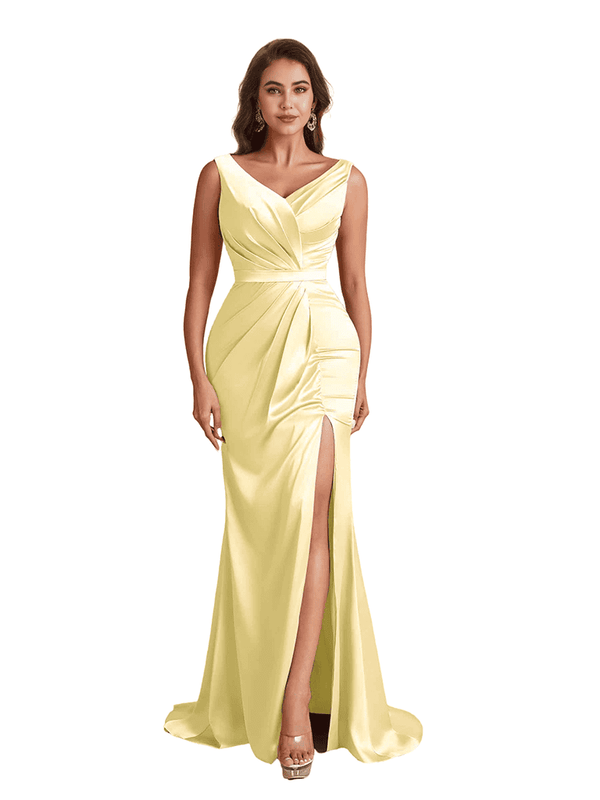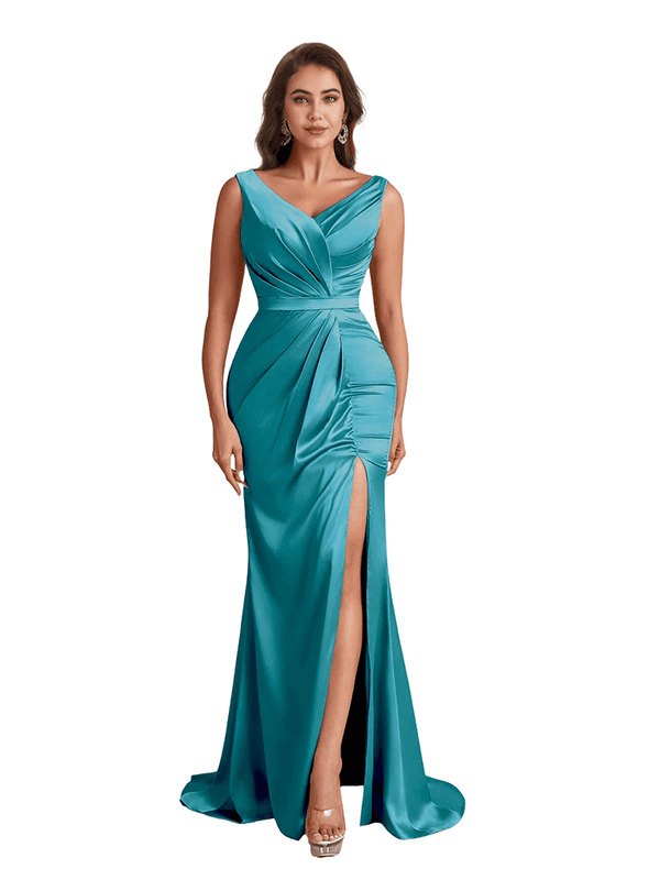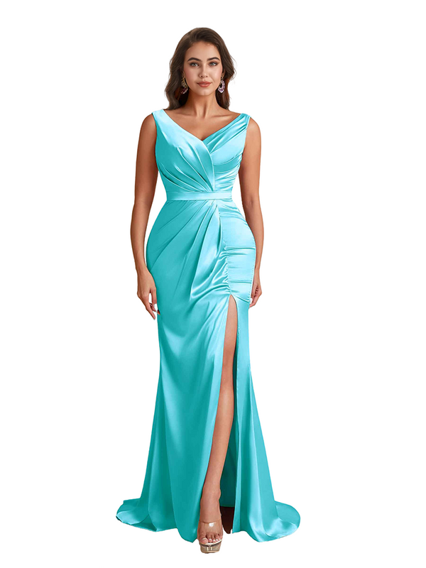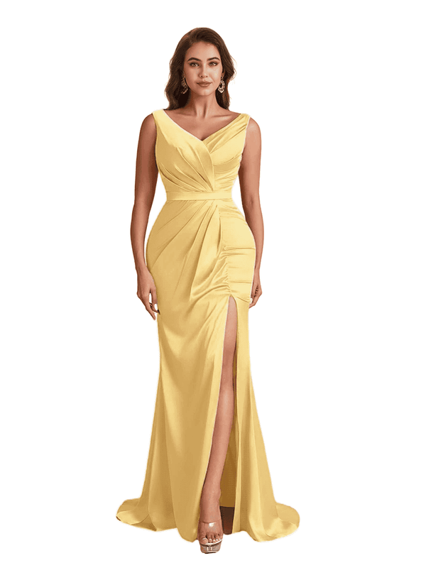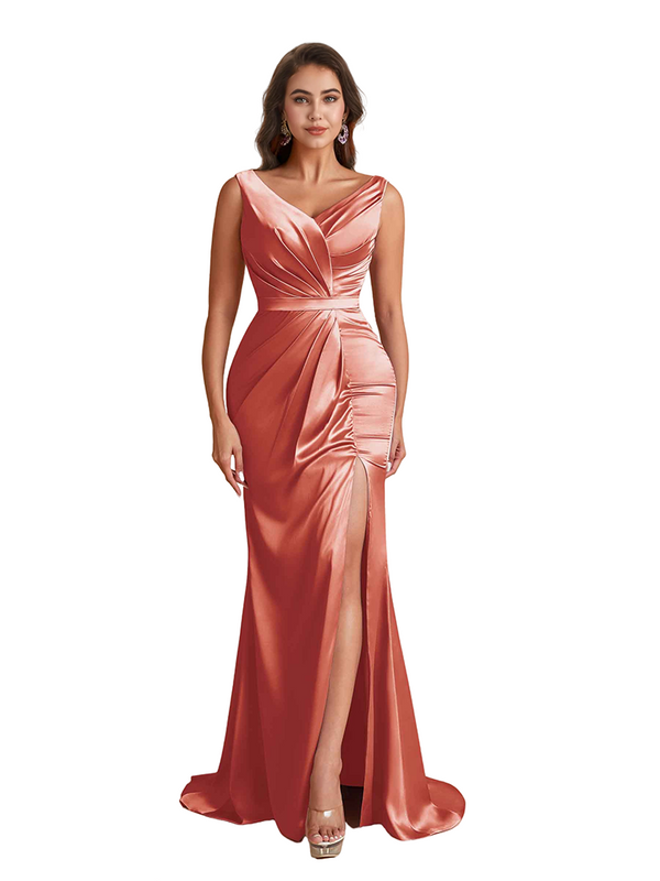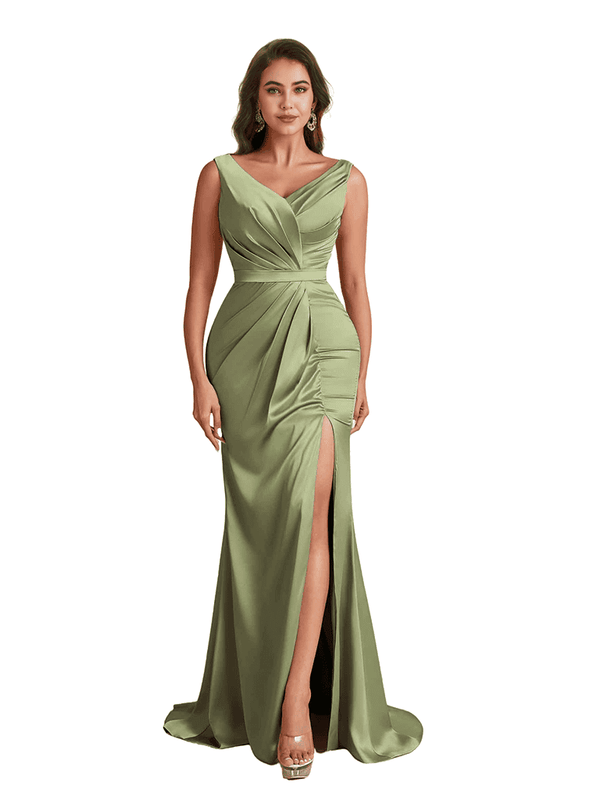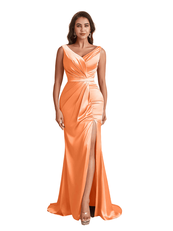 Elegant V-Neck Mermaid Silky Satin Unique Long Bridesmaid Dresses Side Slit