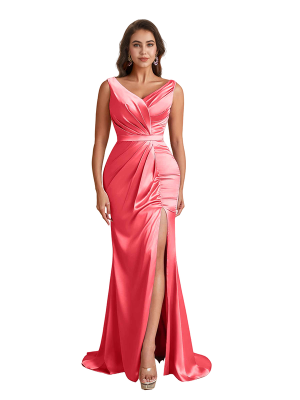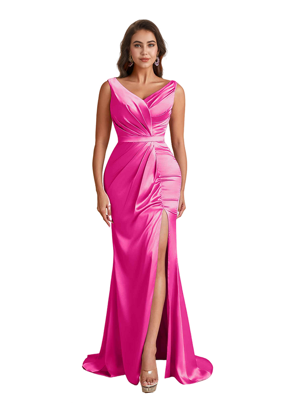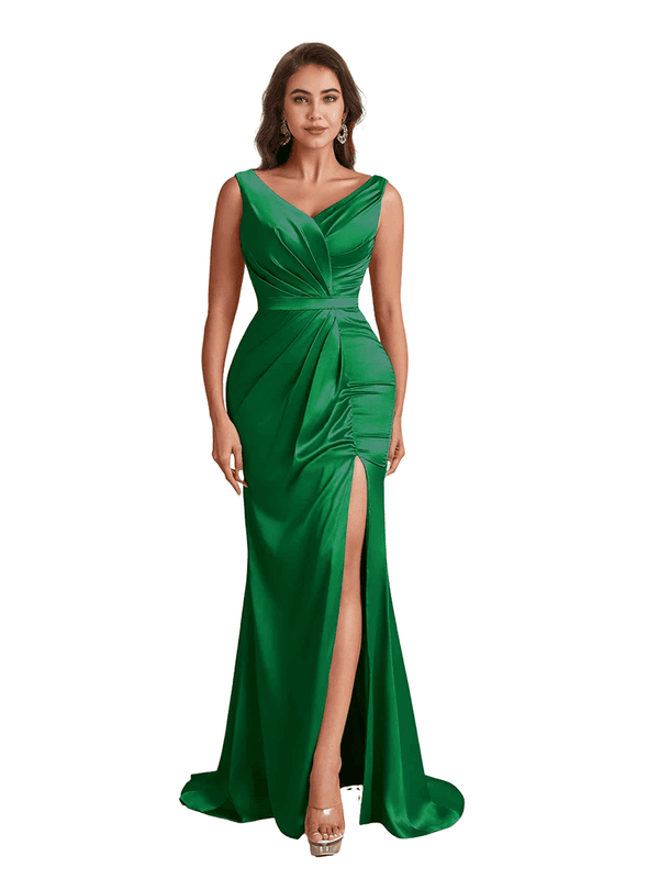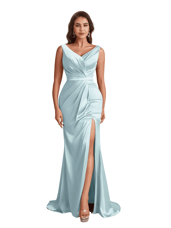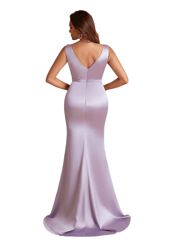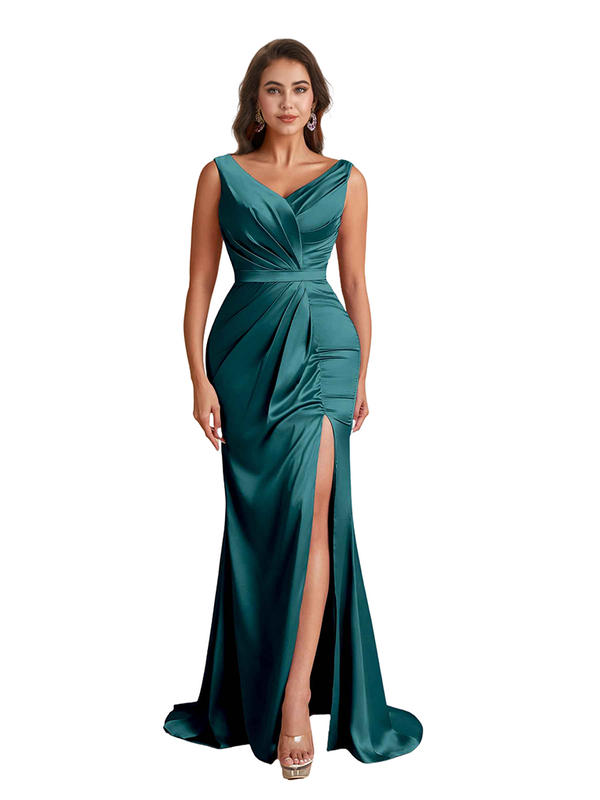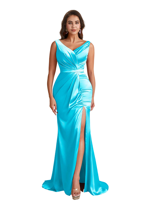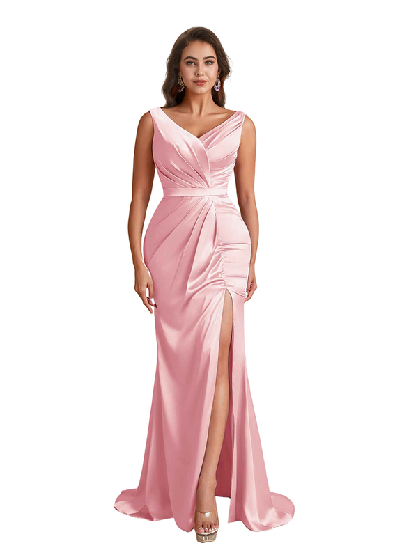 Elegant V-Neck Mermaid Silky Satin Unique Long Bridesmaid Dresses Side Slit