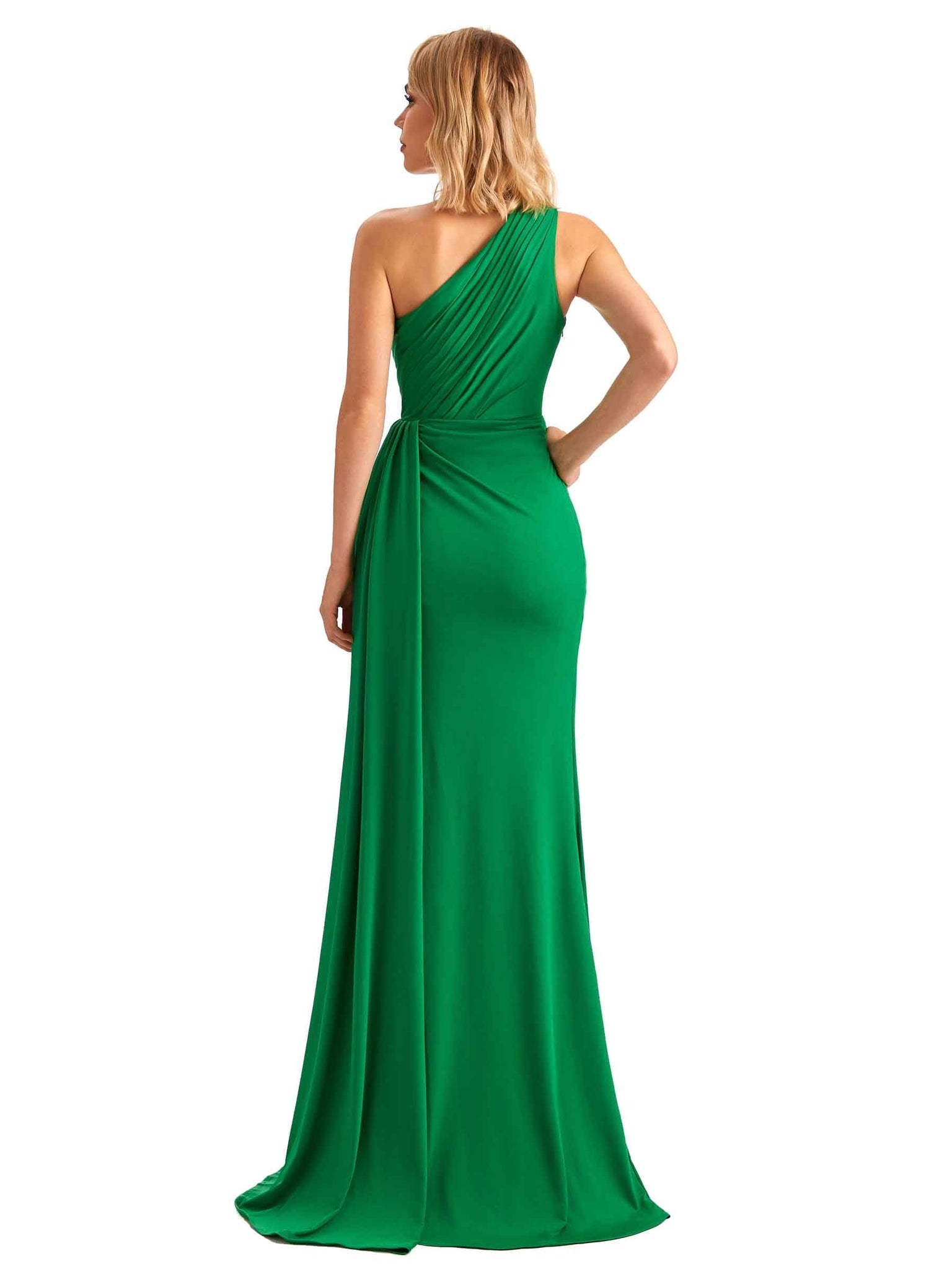 Elegant Side Slit Mermaid One-Shoulder Pleats Stretchy Jersey Long Formal Bridesmaid Dresses - ChicSew