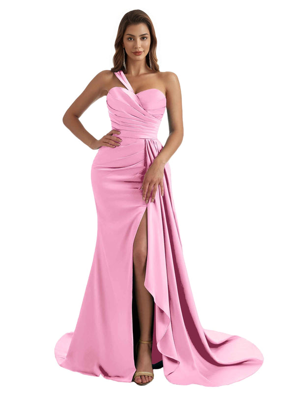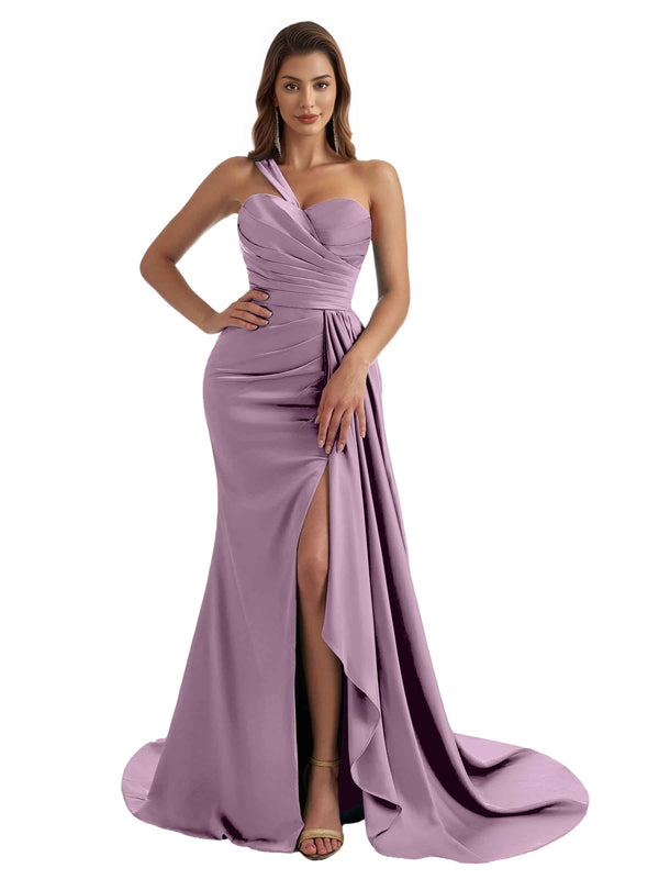 Elegant One Shoulder Side Split Mermaid Ruched Satin Pretty Long Bridesmaid Dresses - ChicSew