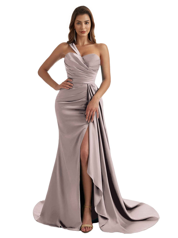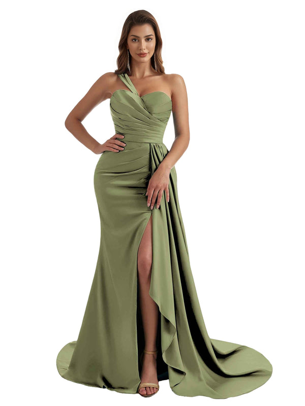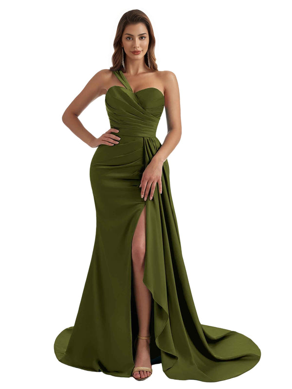Elegant One Shoulder Mermaid Ruched Satin Chic Long Bridesmaid Dresses Slit Online