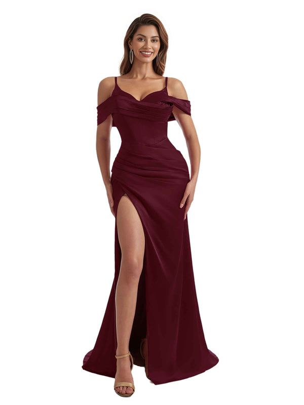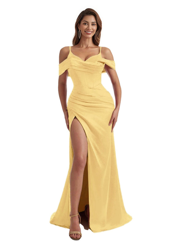 Gorgeous Cold Shoulder Mermaid Pleated Silky Satin Side Slit Long Bridesmaid Dresses