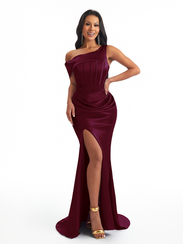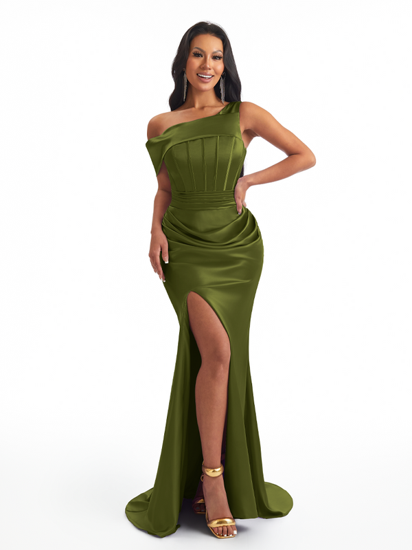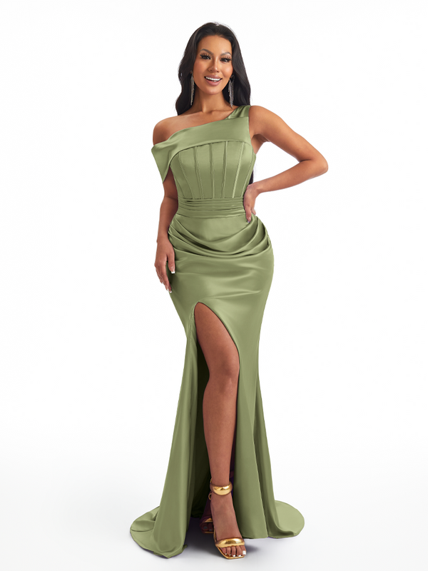 Women's Sexy One Shoulder Mermaid Silky Satin Wedding Party Maxi Dress Slit