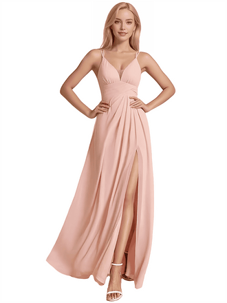 Chiffon Spaghetti Strap V-neck Long Bridesmaid Gowns Online UK