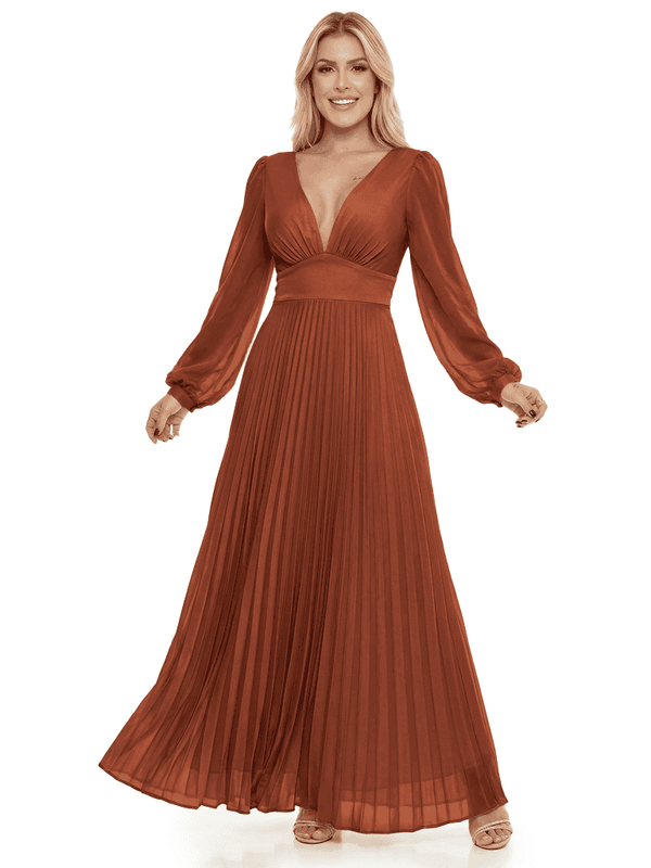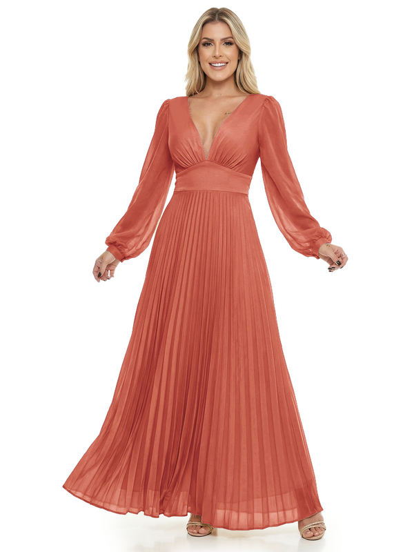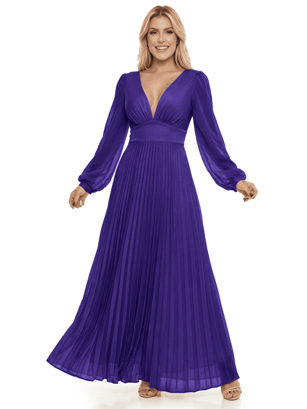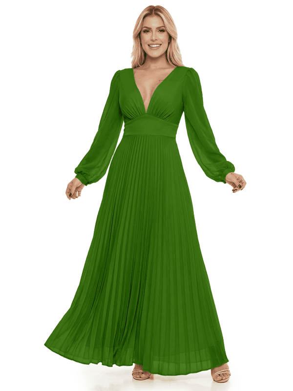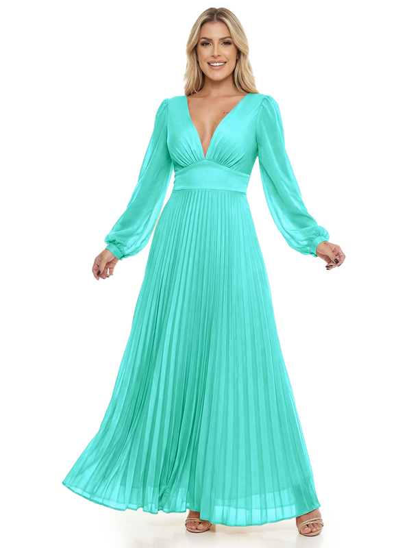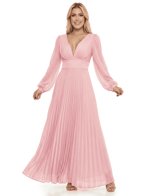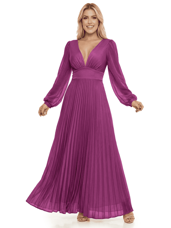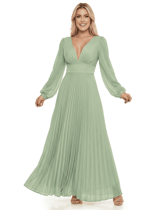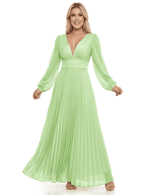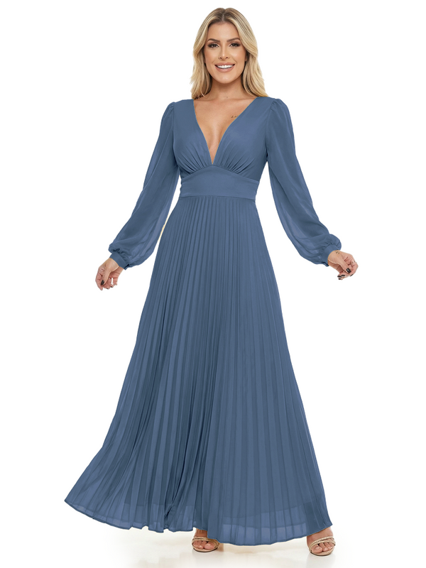 Chicsew Fancy Long Sleeves V-Neck Pleated Chiffon Empire Waist Mother Of The Bride Dress