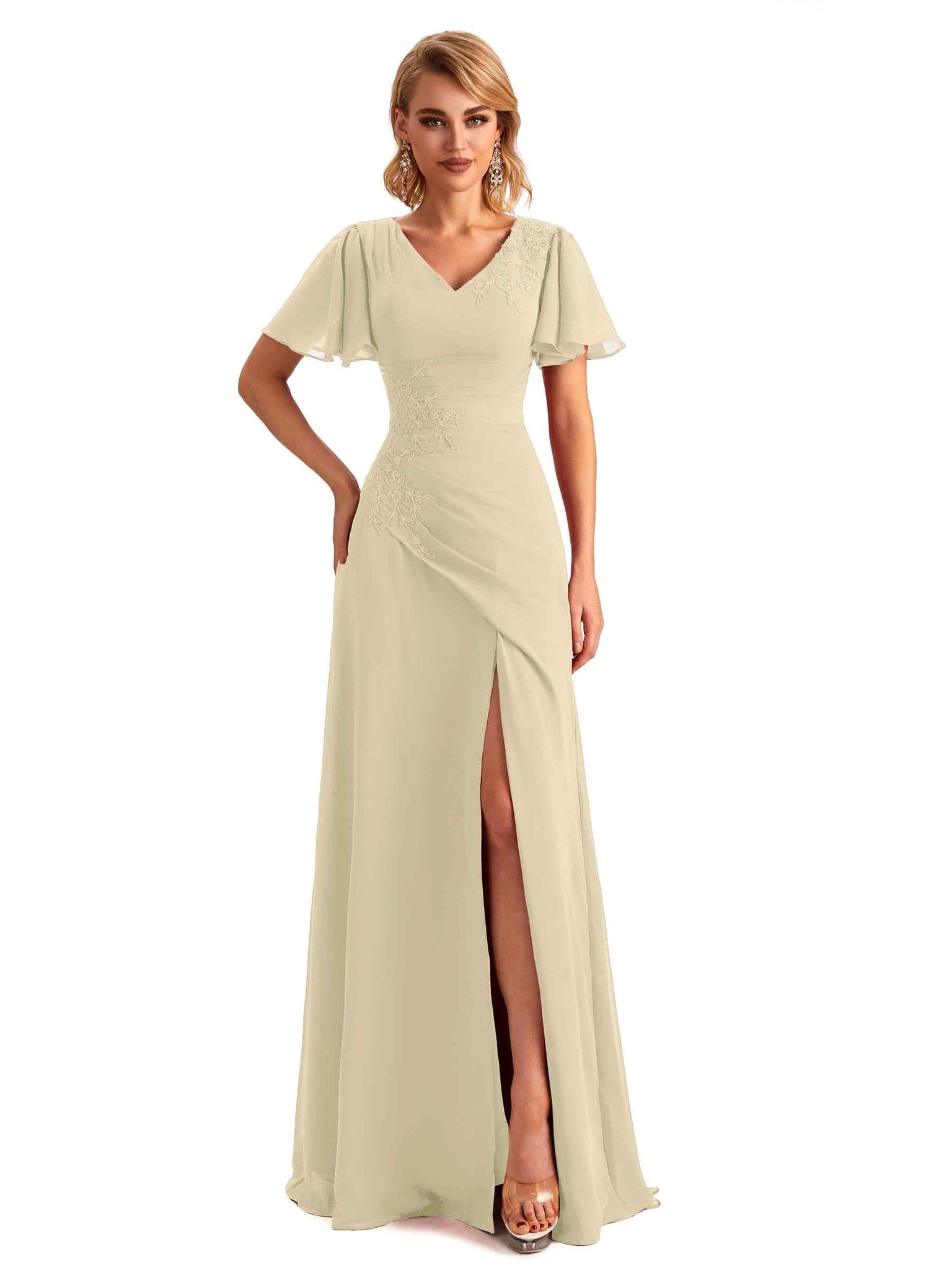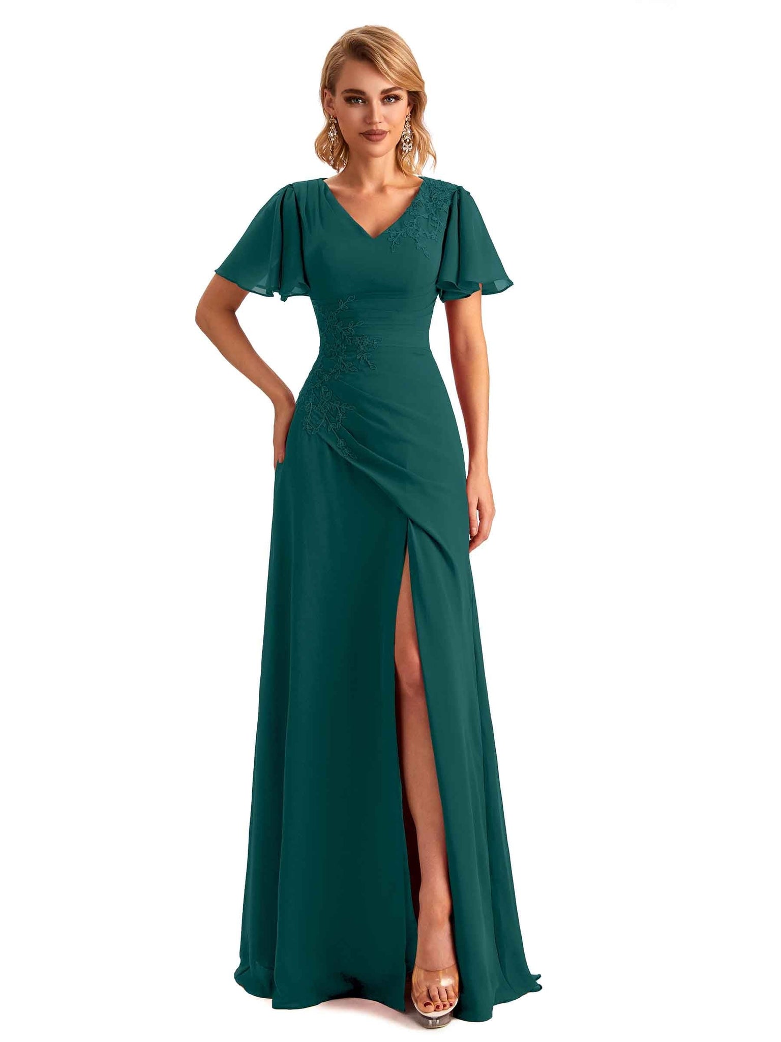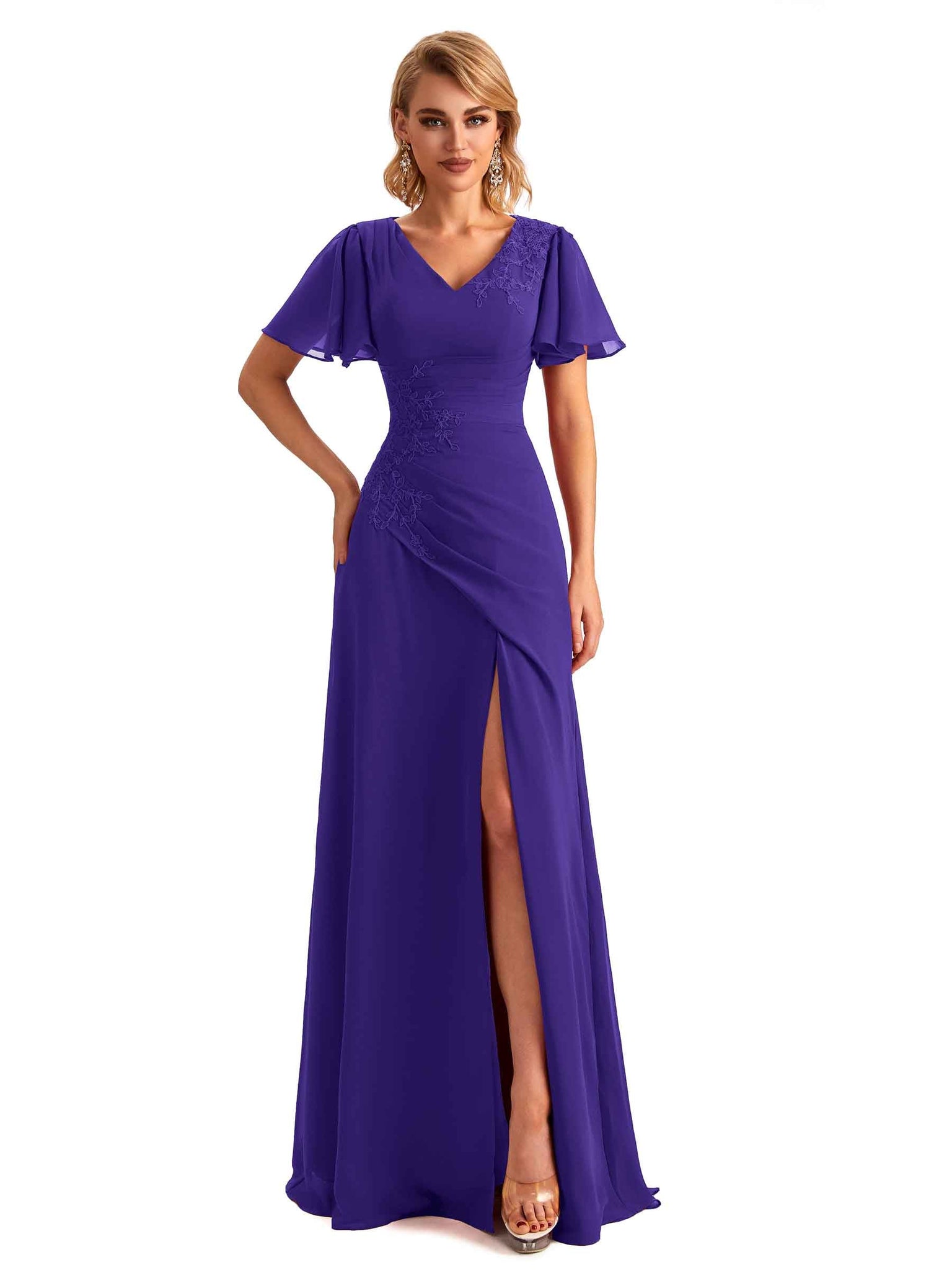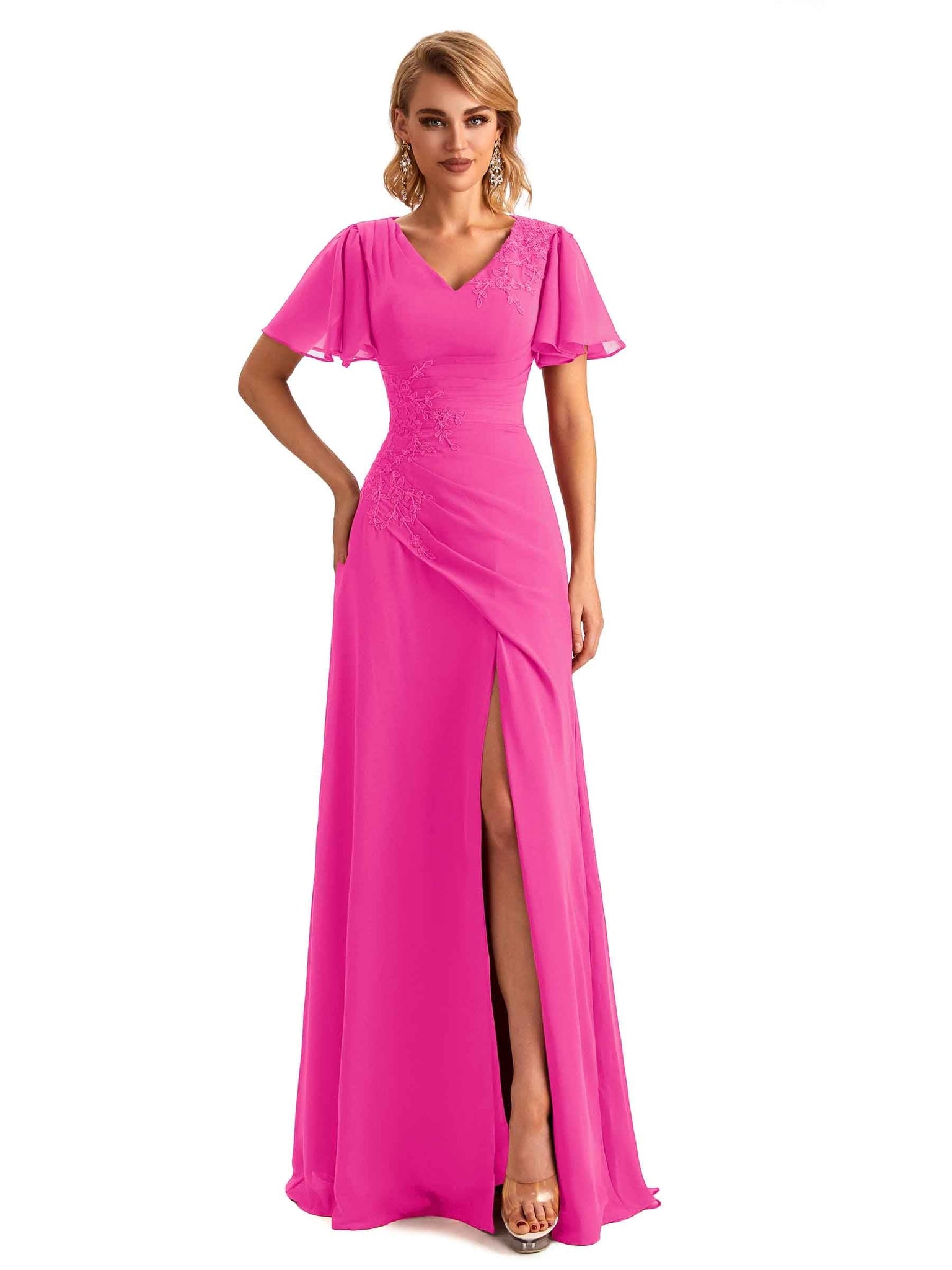 Elegant Chiffon Short Sleeves Side Slit Sheath Applique Long Mother of the Brides Dresses - ChicSew