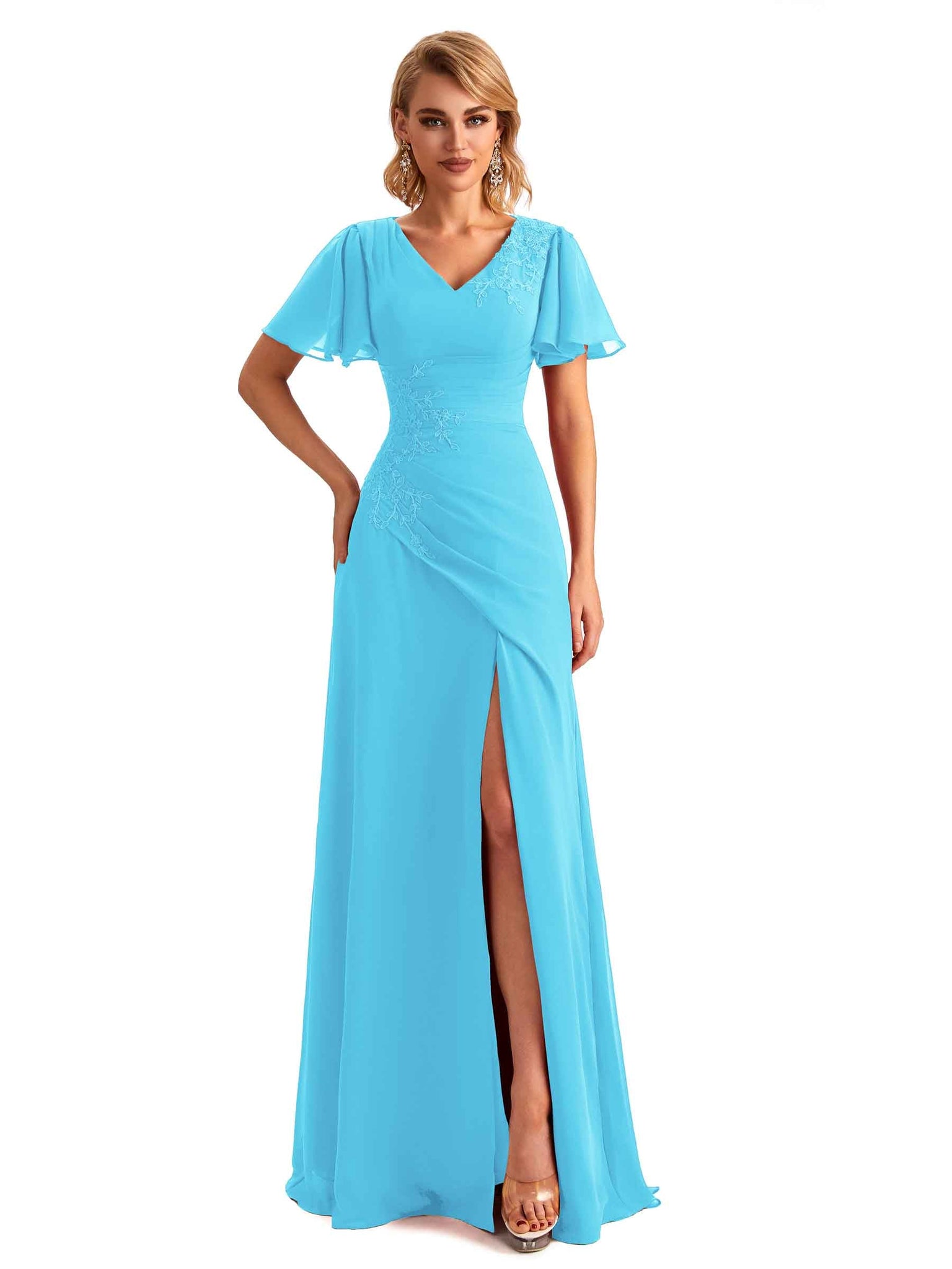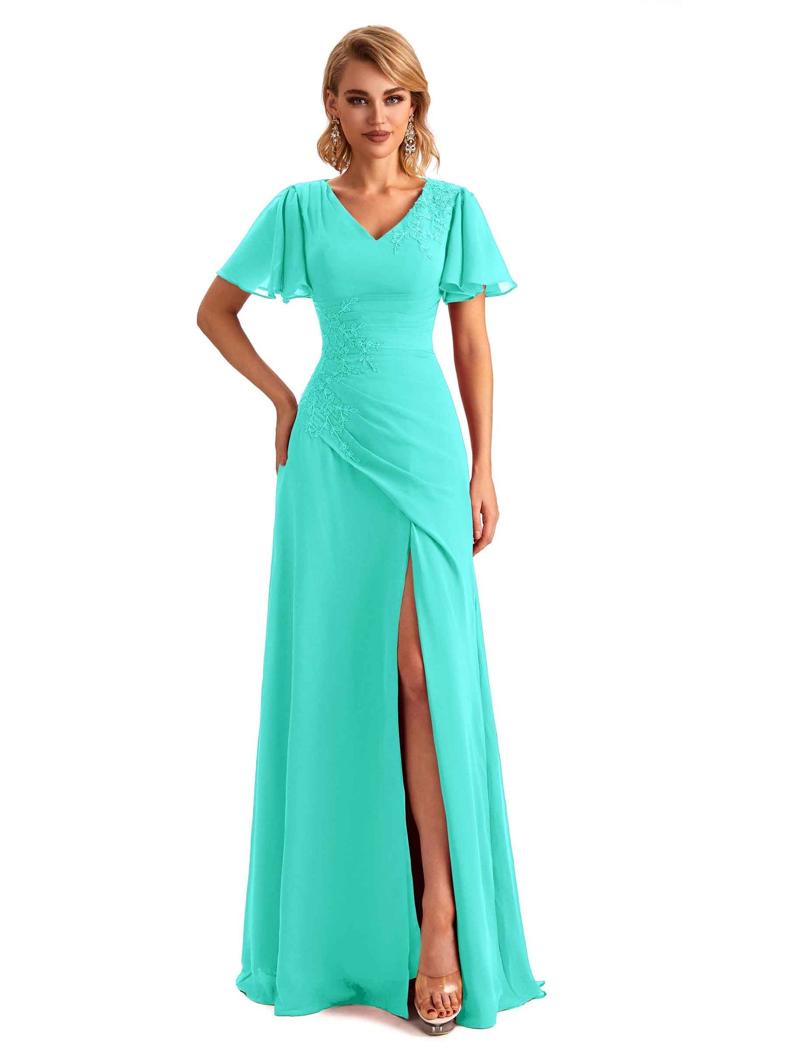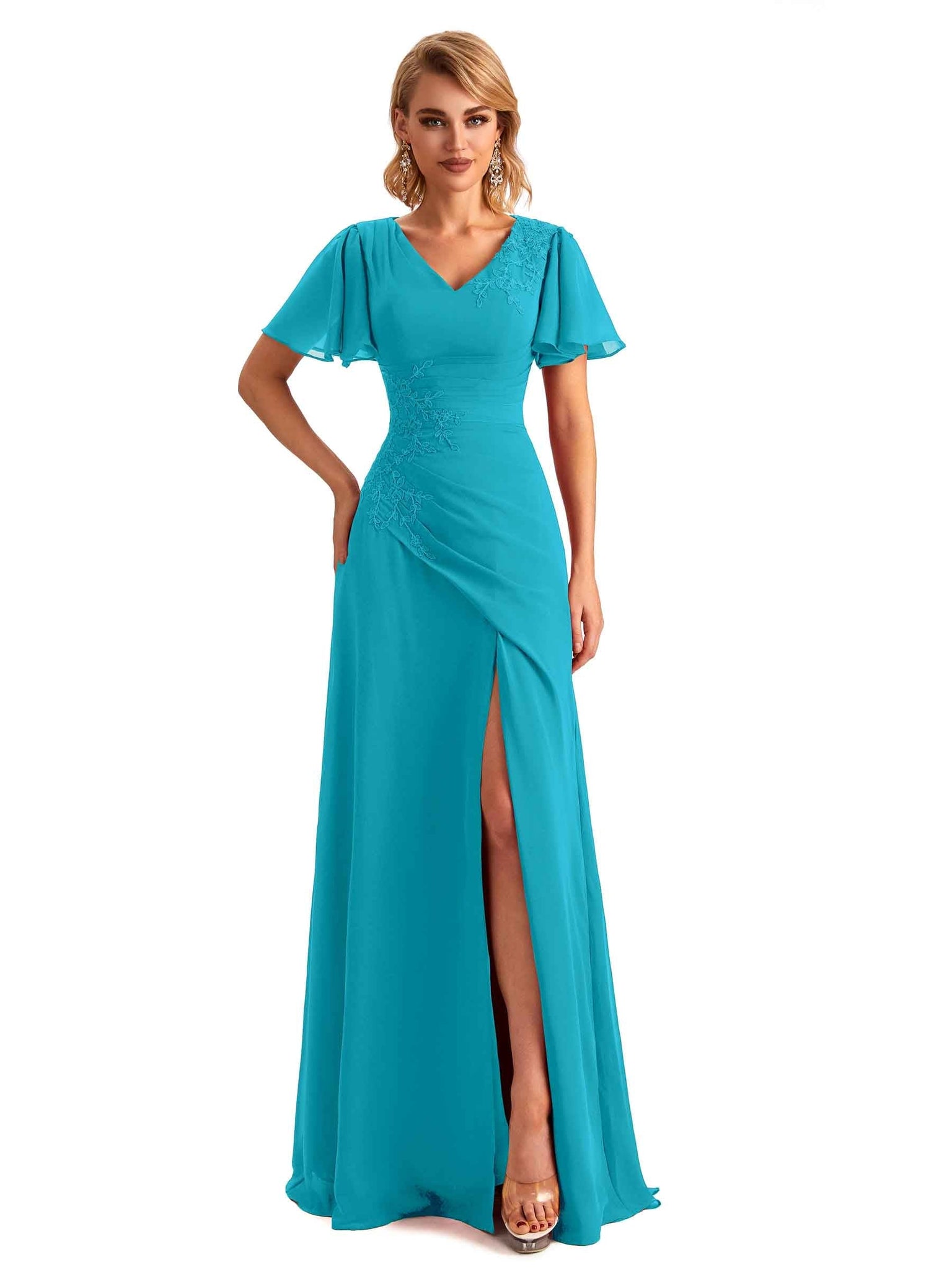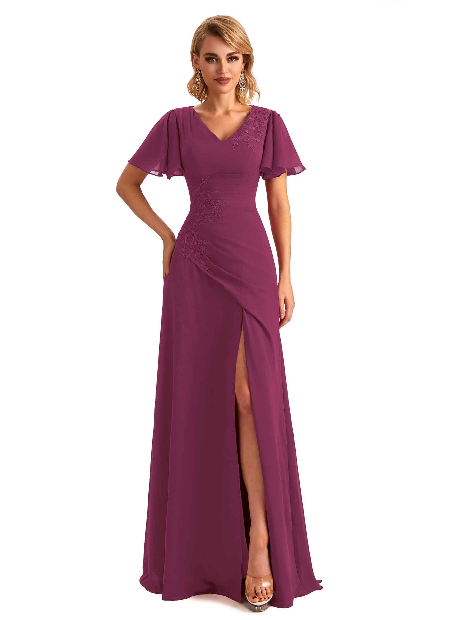 Elegant Chiffon Short Sleeves Side Slit Sheath Applique Long Mother of the Brides Dresses - ChicSew