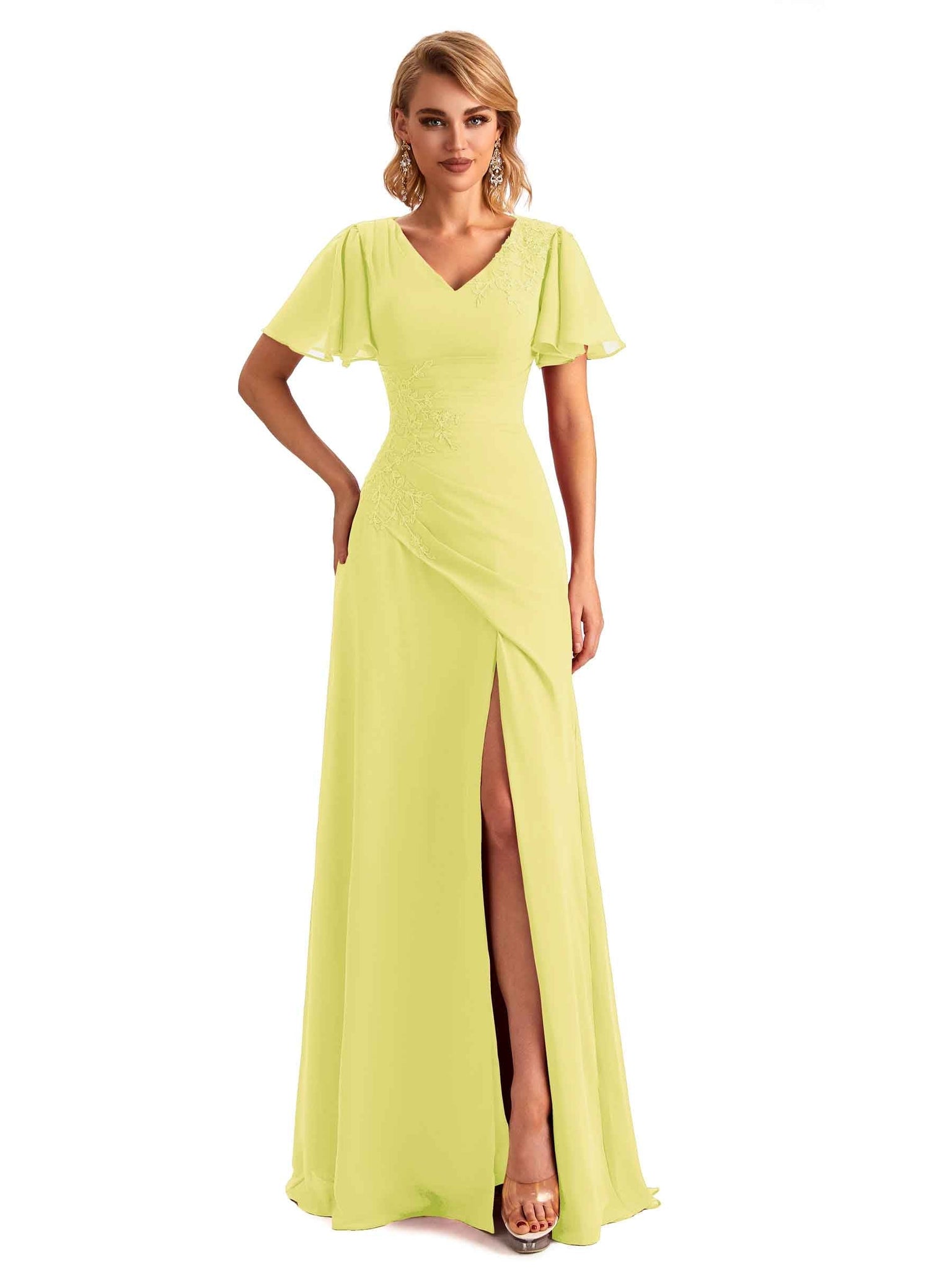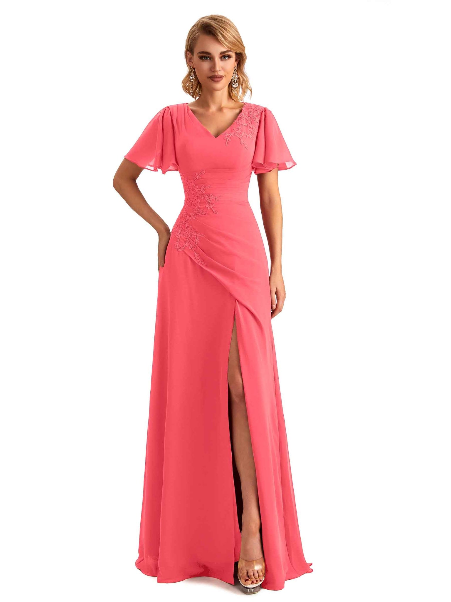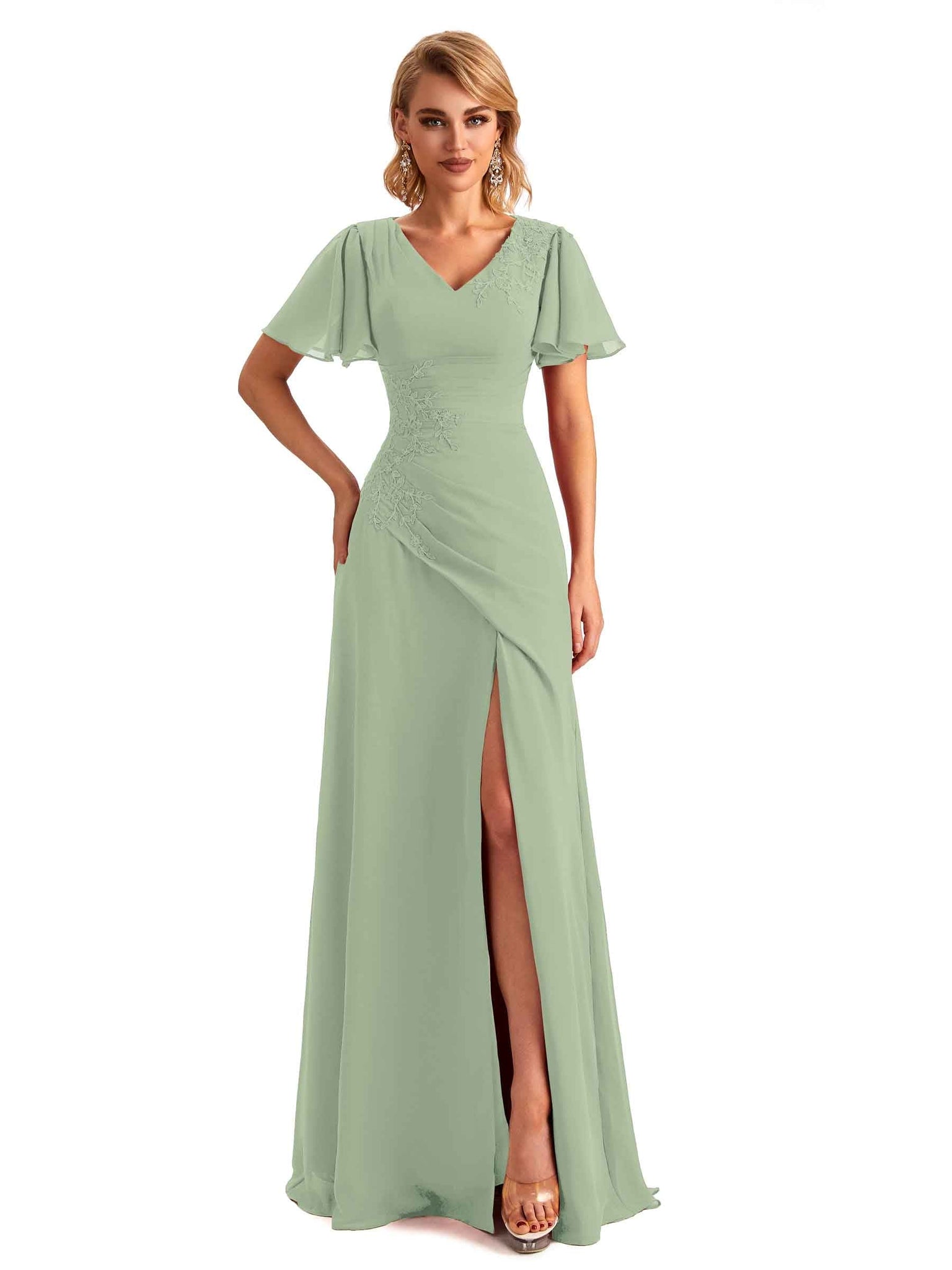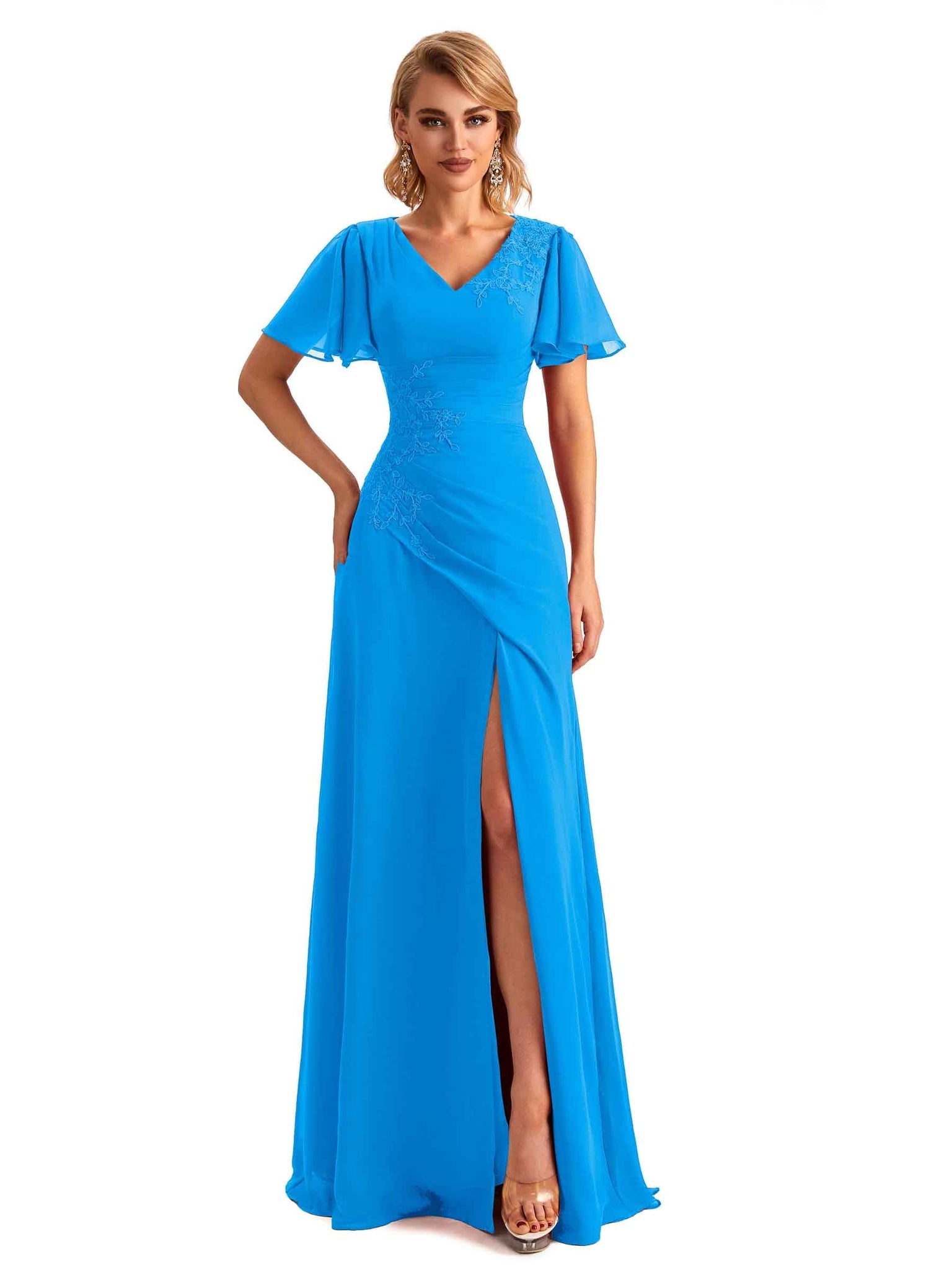 Elegant Chiffon Short Sleeves Side Slit Sheath Applique Long Mother of the Brides Dresses - ChicSew