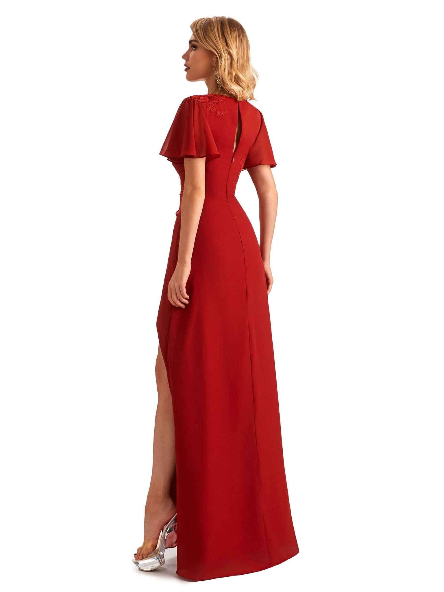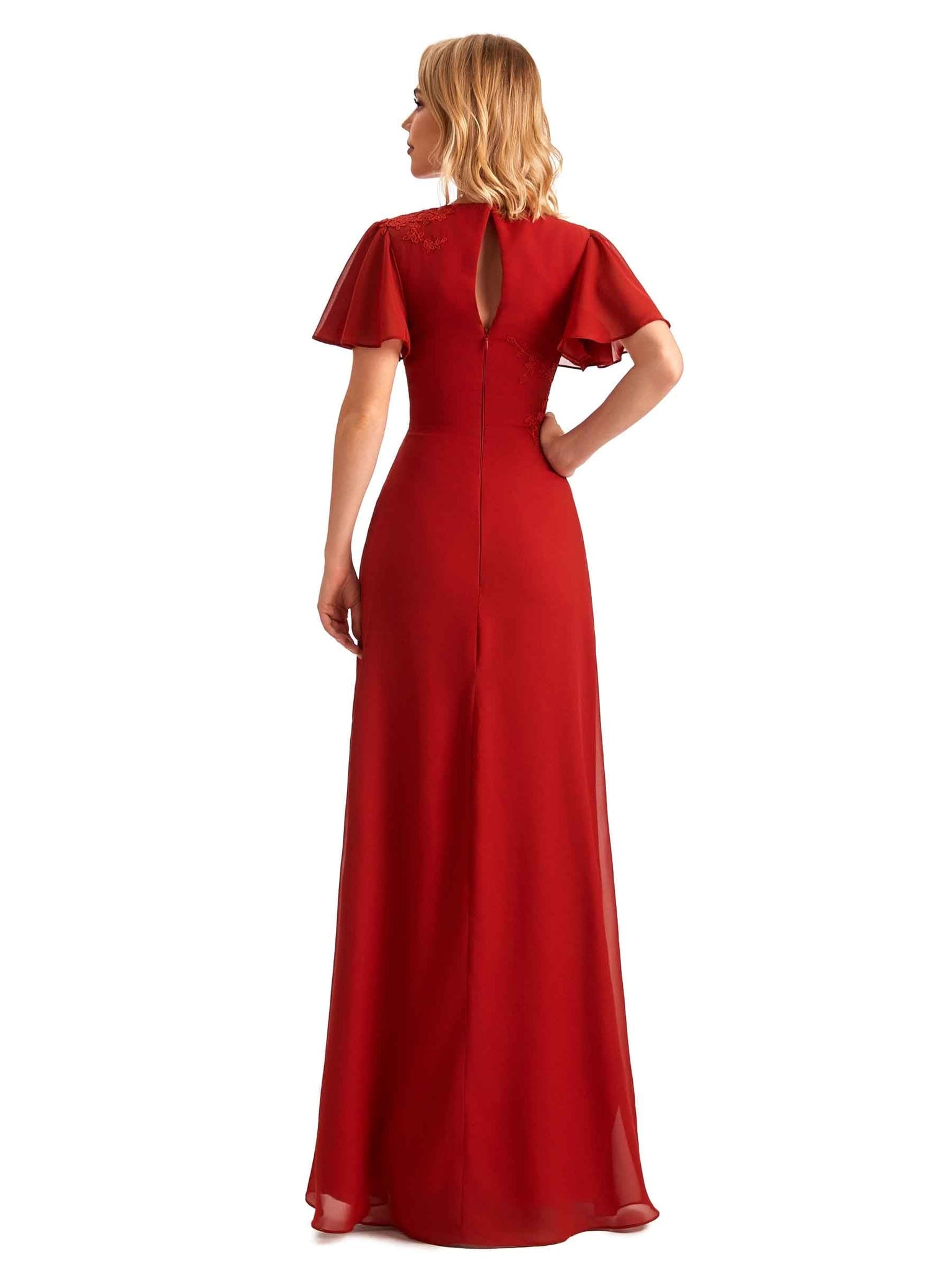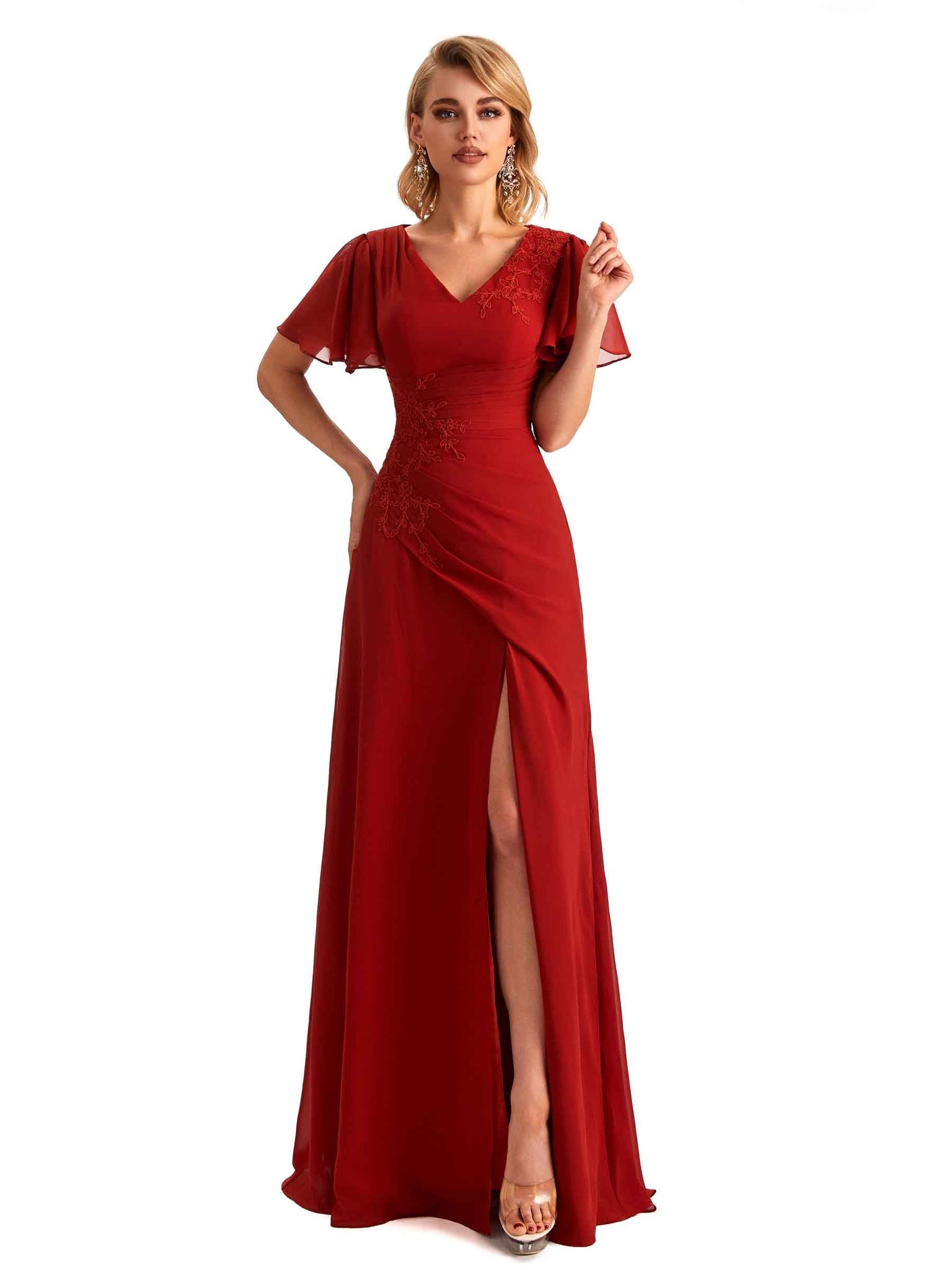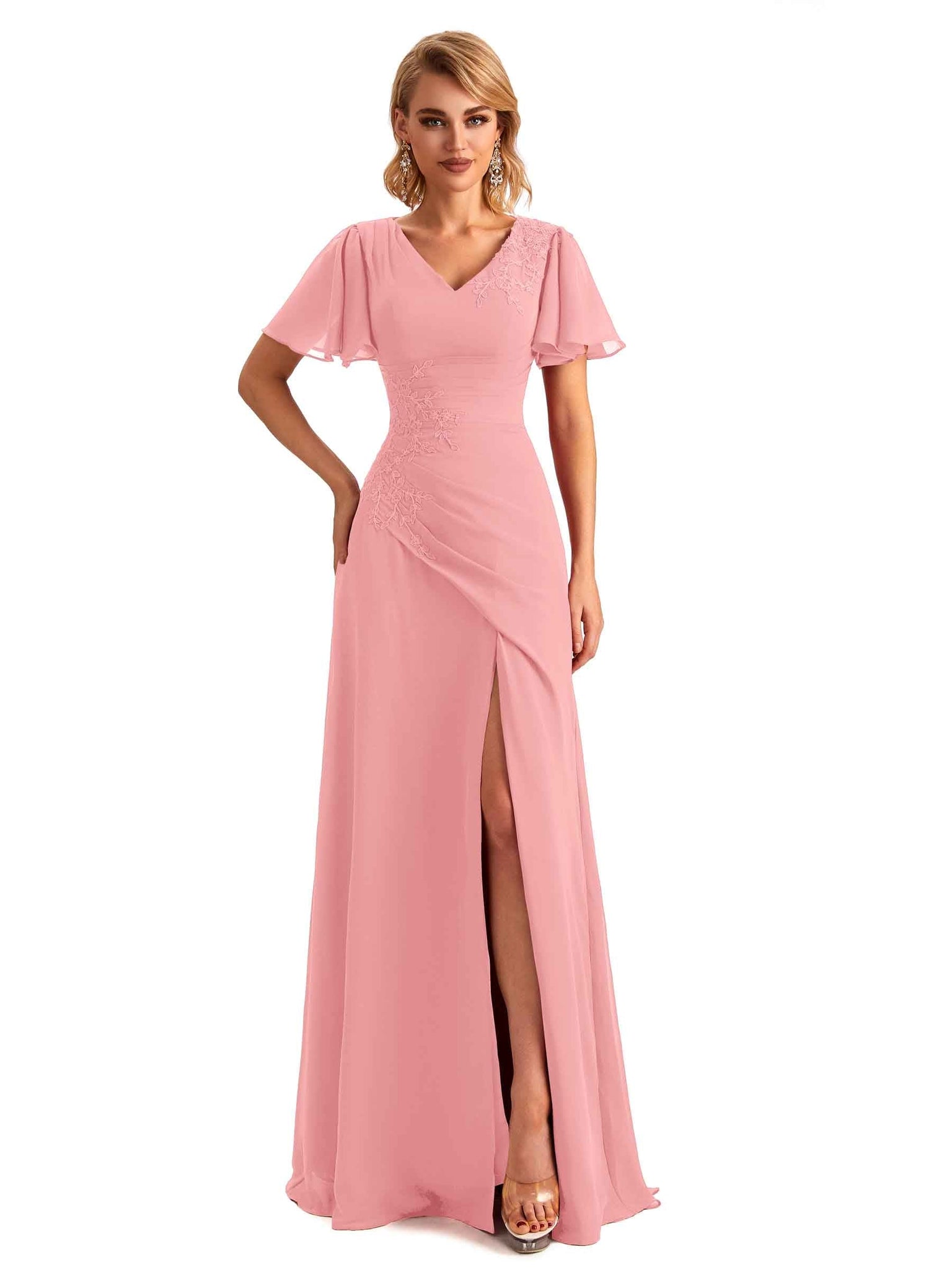 Elegant Chiffon Short Sleeves Side Slit Sheath Applique Long Mother of the Brides Dresses - ChicSew