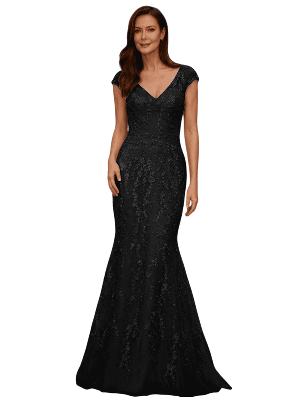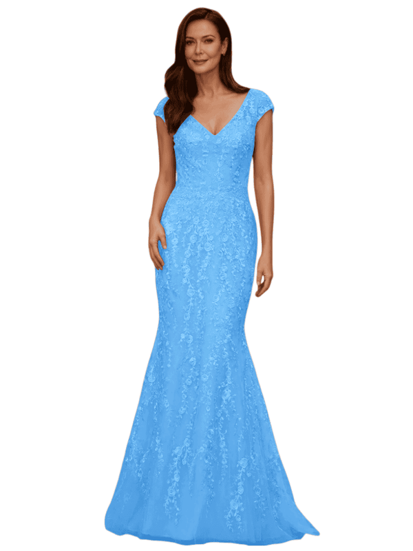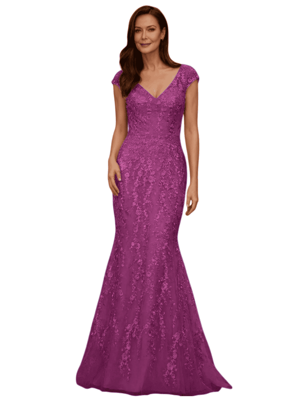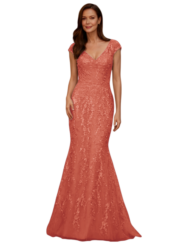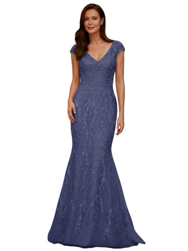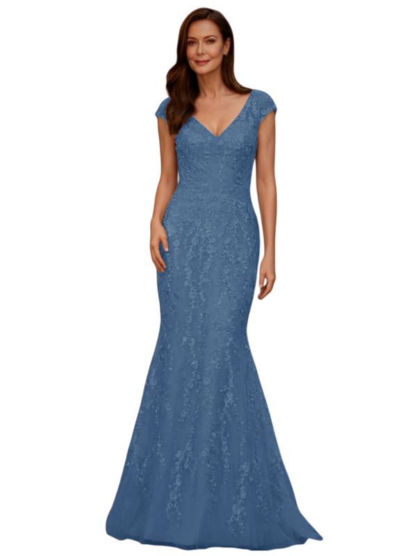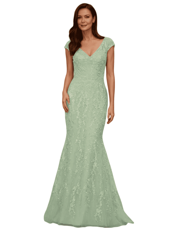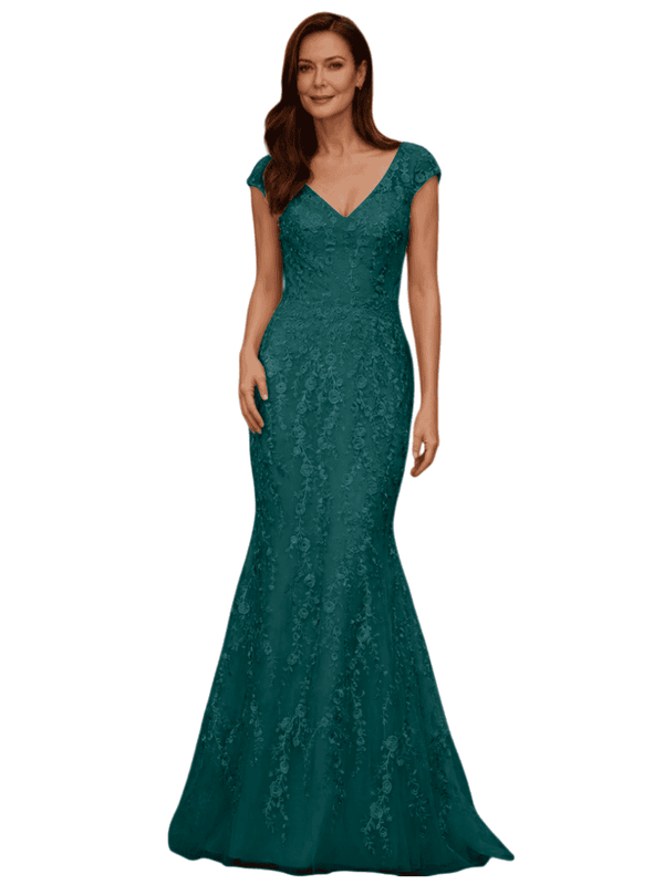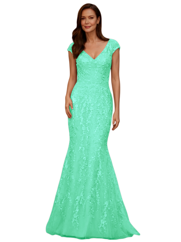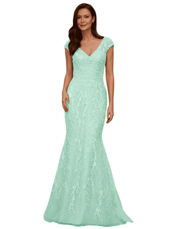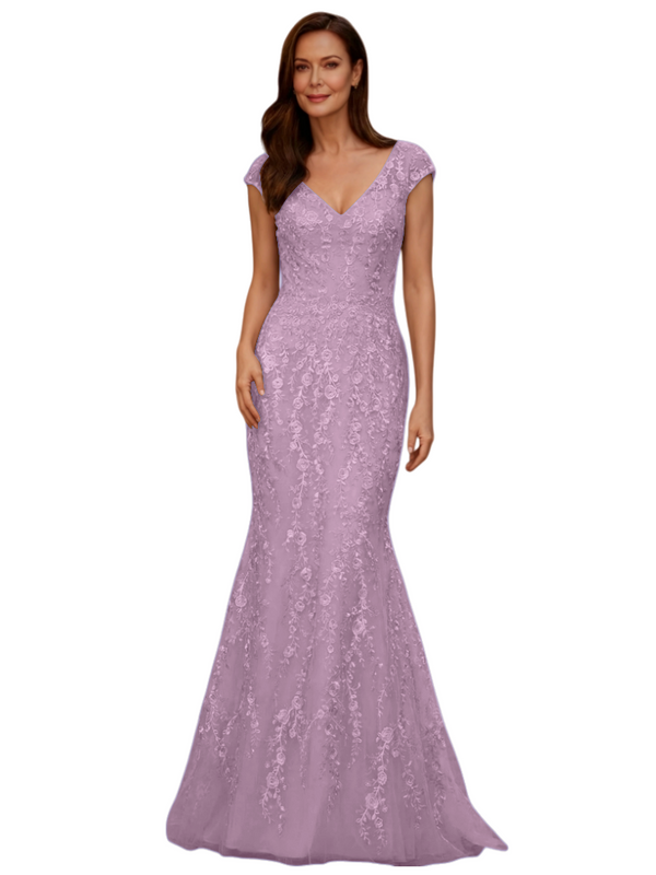 Elegant V-Neck Cap Sleeves Lace And Tulle Mermaid Long Mother of The Bride Dresses - ChicSew