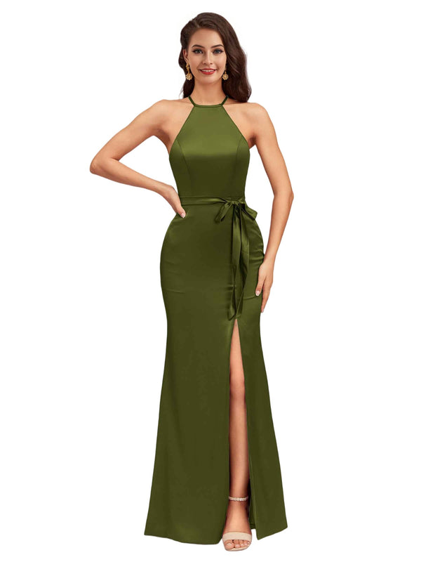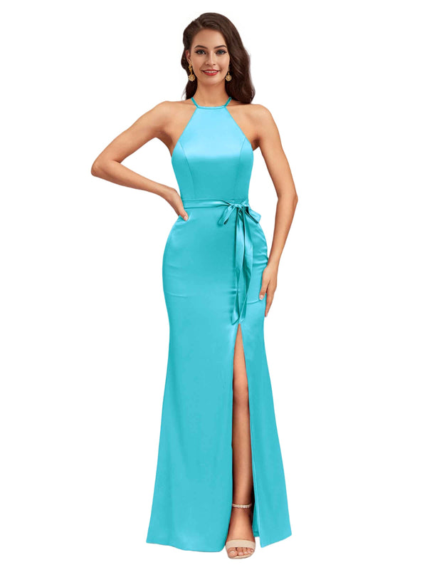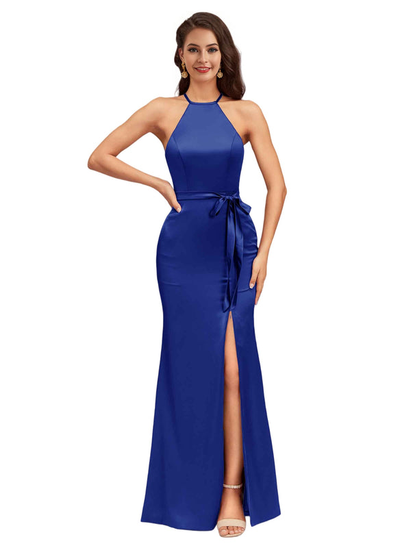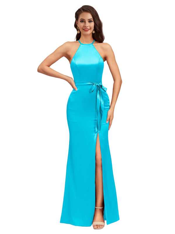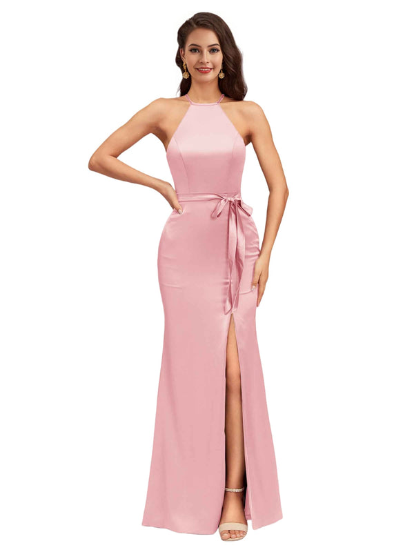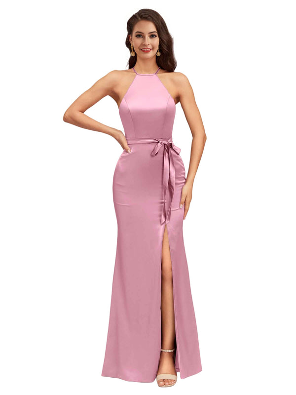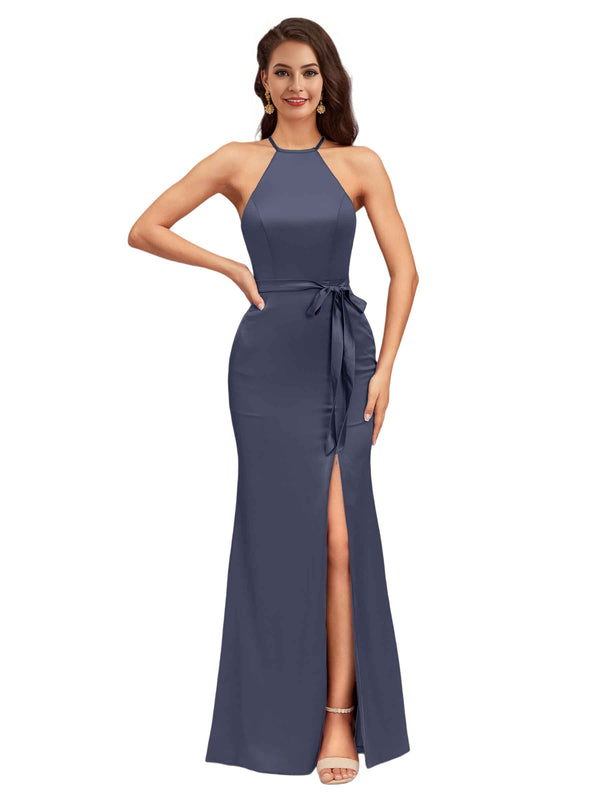 Sexy Halter Soft Satin Mermaid Side Slit Long Bridesmaid Dresses Online £102.99