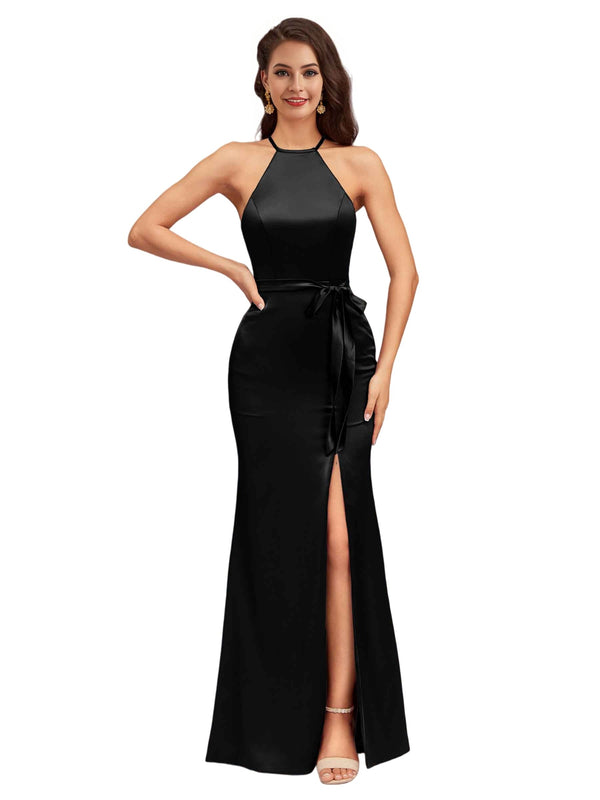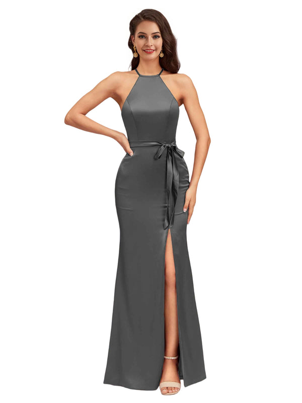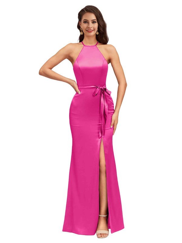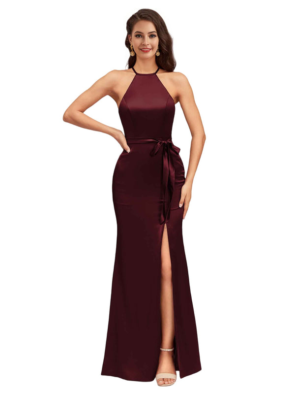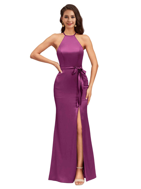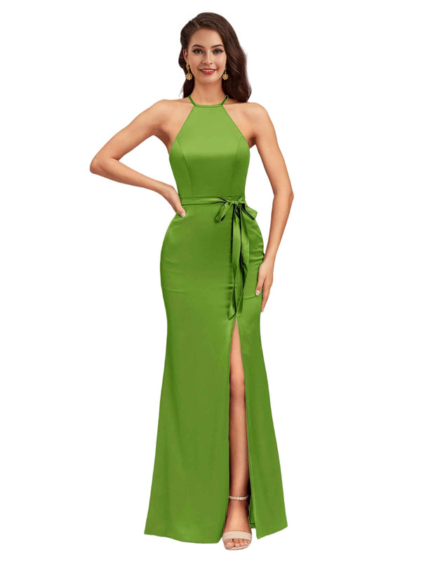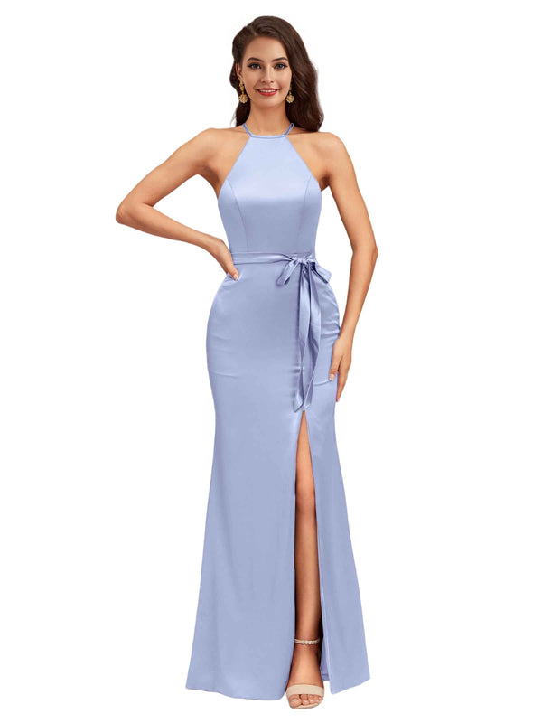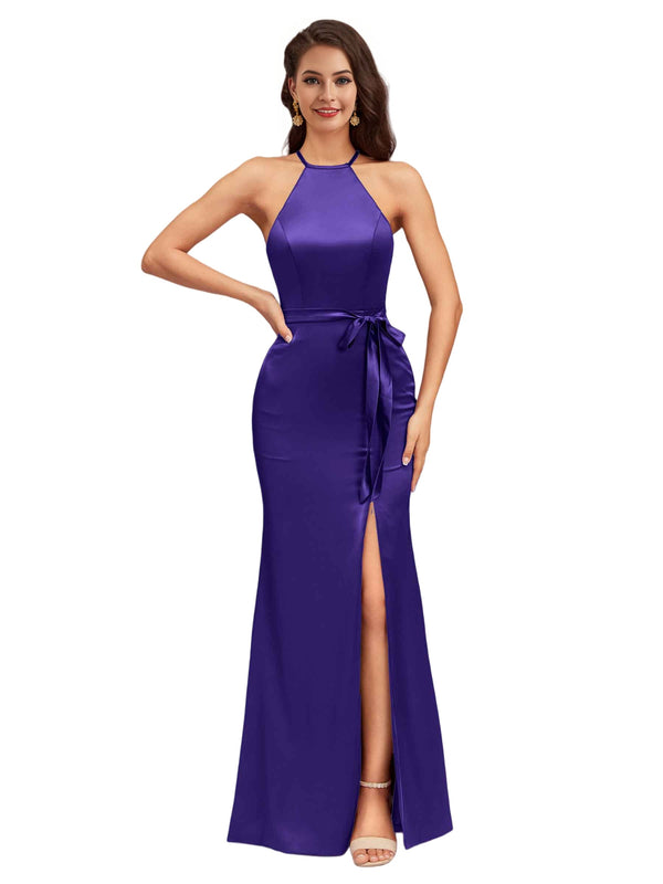 Sexy Halter Soft Satin Mermaid Side Slit Long Bridesmaid Dresses Online £102.99