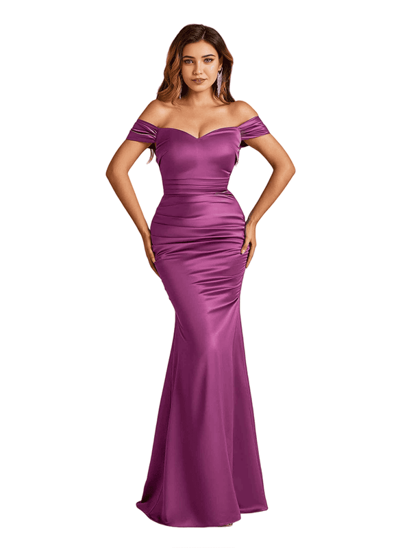 Sexy Off The Shoulder Ruched Mermaid Soft Satin Long Bridesmaid Dresses Online £102.99