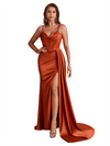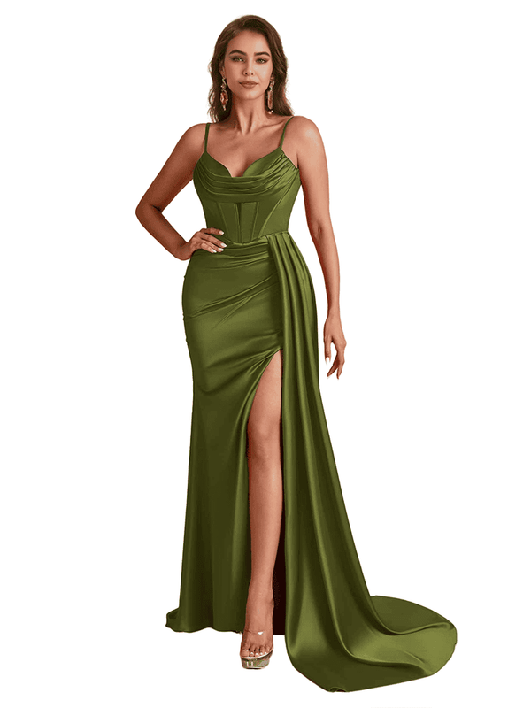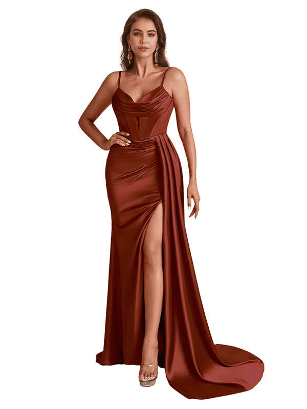 Sexy Satin Spaghetti Straps Boning Mermaid Side Split Long Bridesmaid Dresses - ChicSew