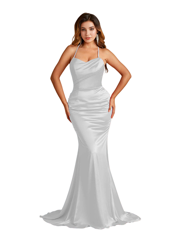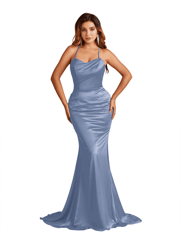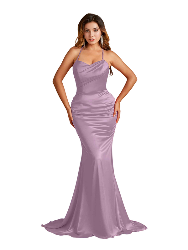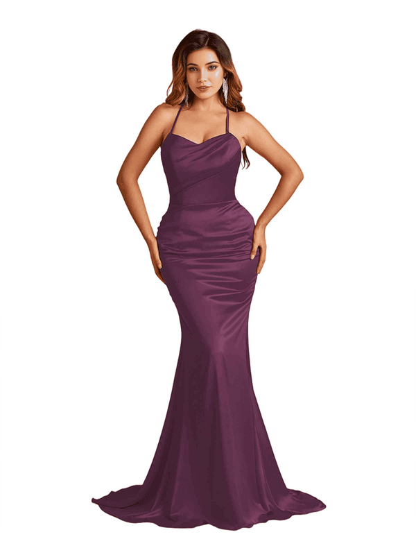 Sexy Spaghetti Straps Criss Cross Mermaid Soft Satin Long Bridesmaid Dresses