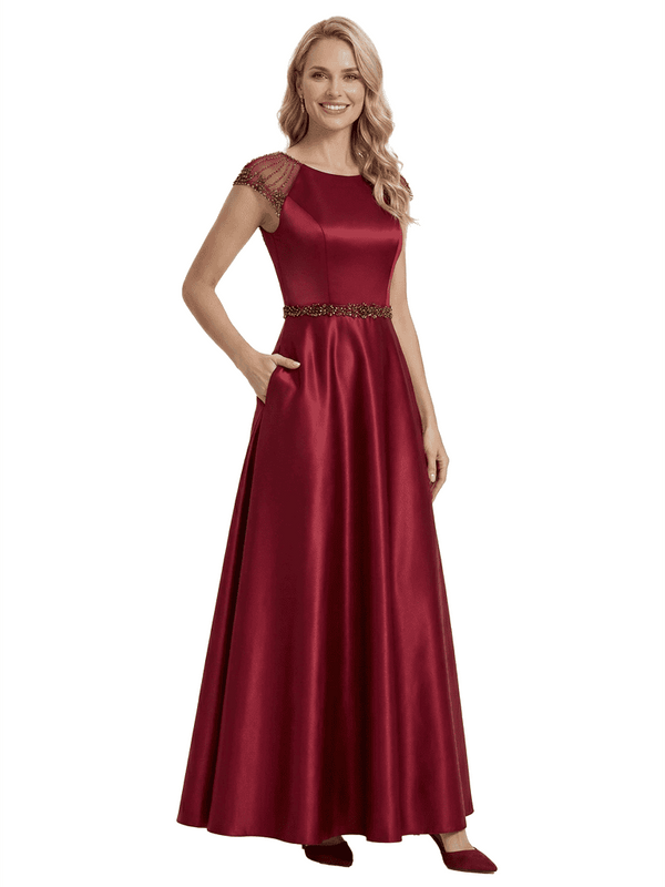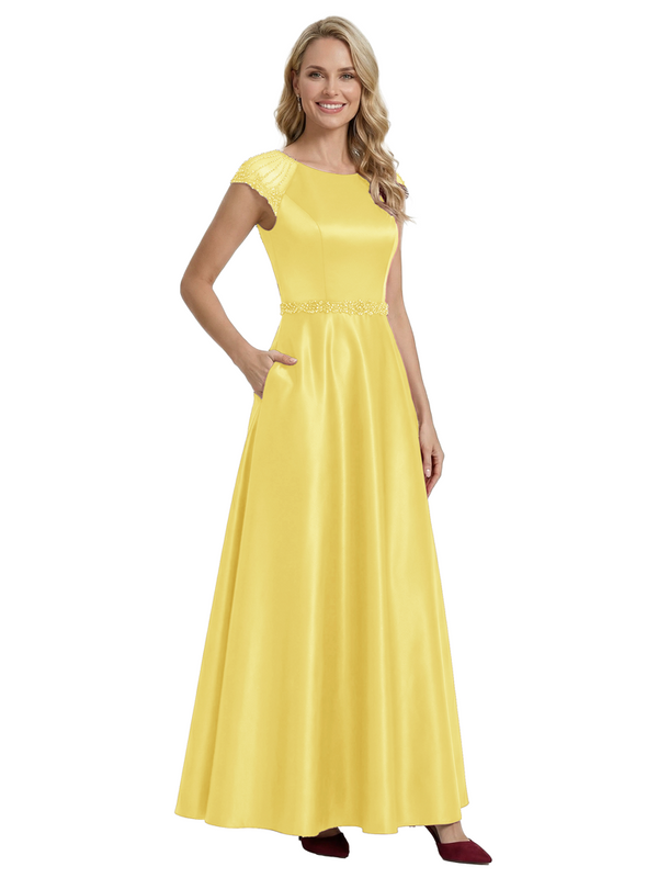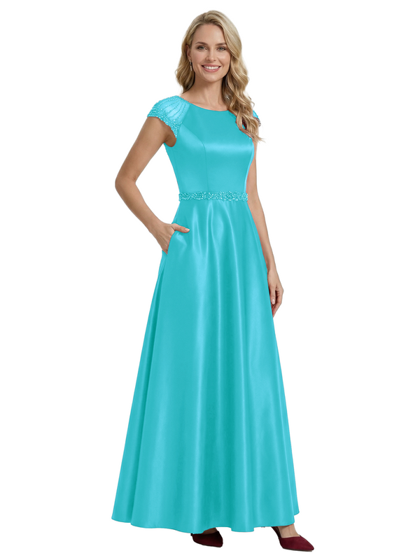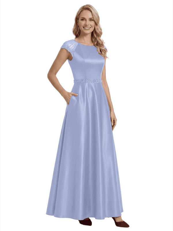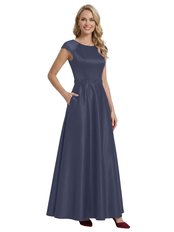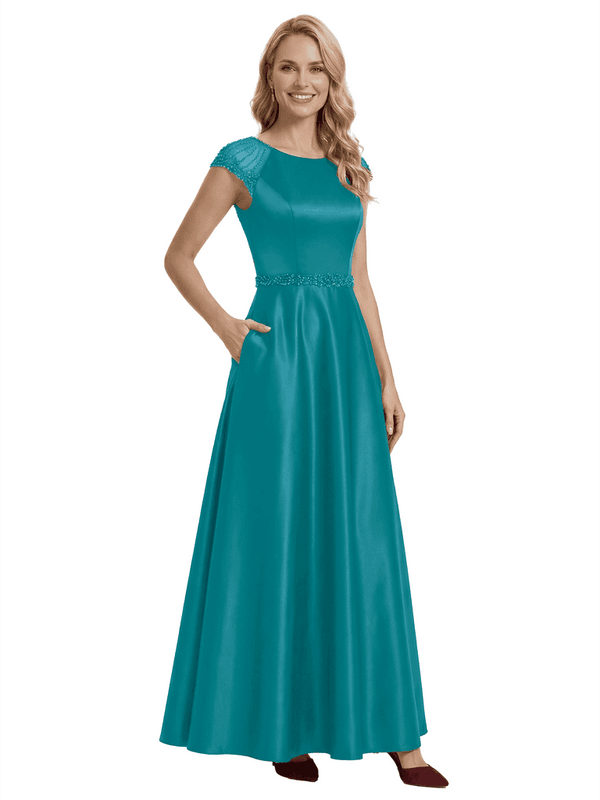 Elegant Scoop Cap Sleeve Satin A-Line Floor-Length For Mother Of The Bride with Pocket