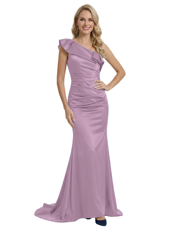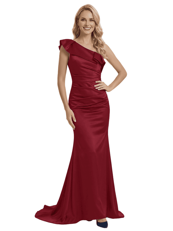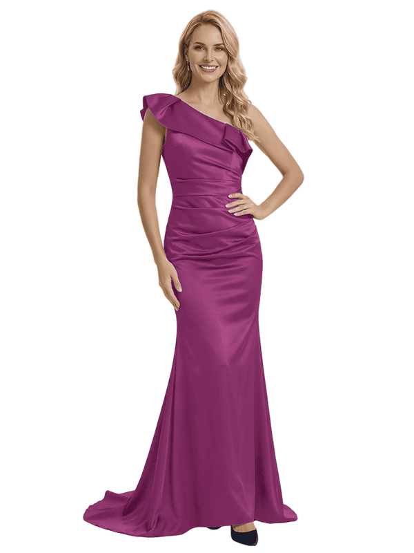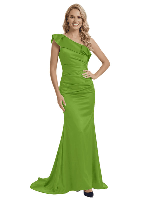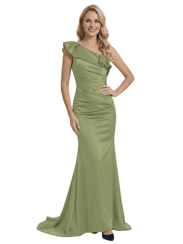 Mother of The Groom Gown One Shoulder Sleeveless Ruffled Satin Mermaid Floor Length Modern Formal Bride Mother Wear - Chicsew