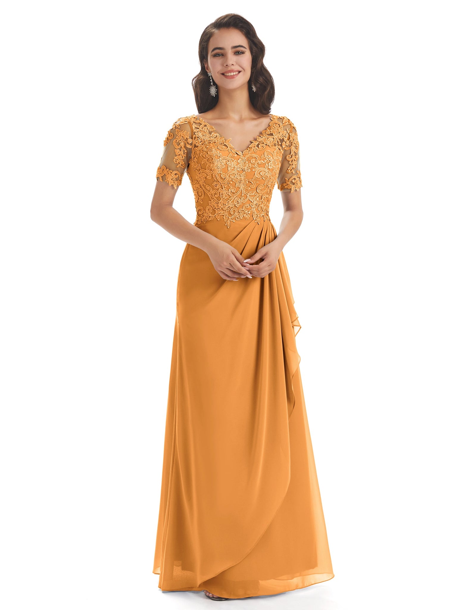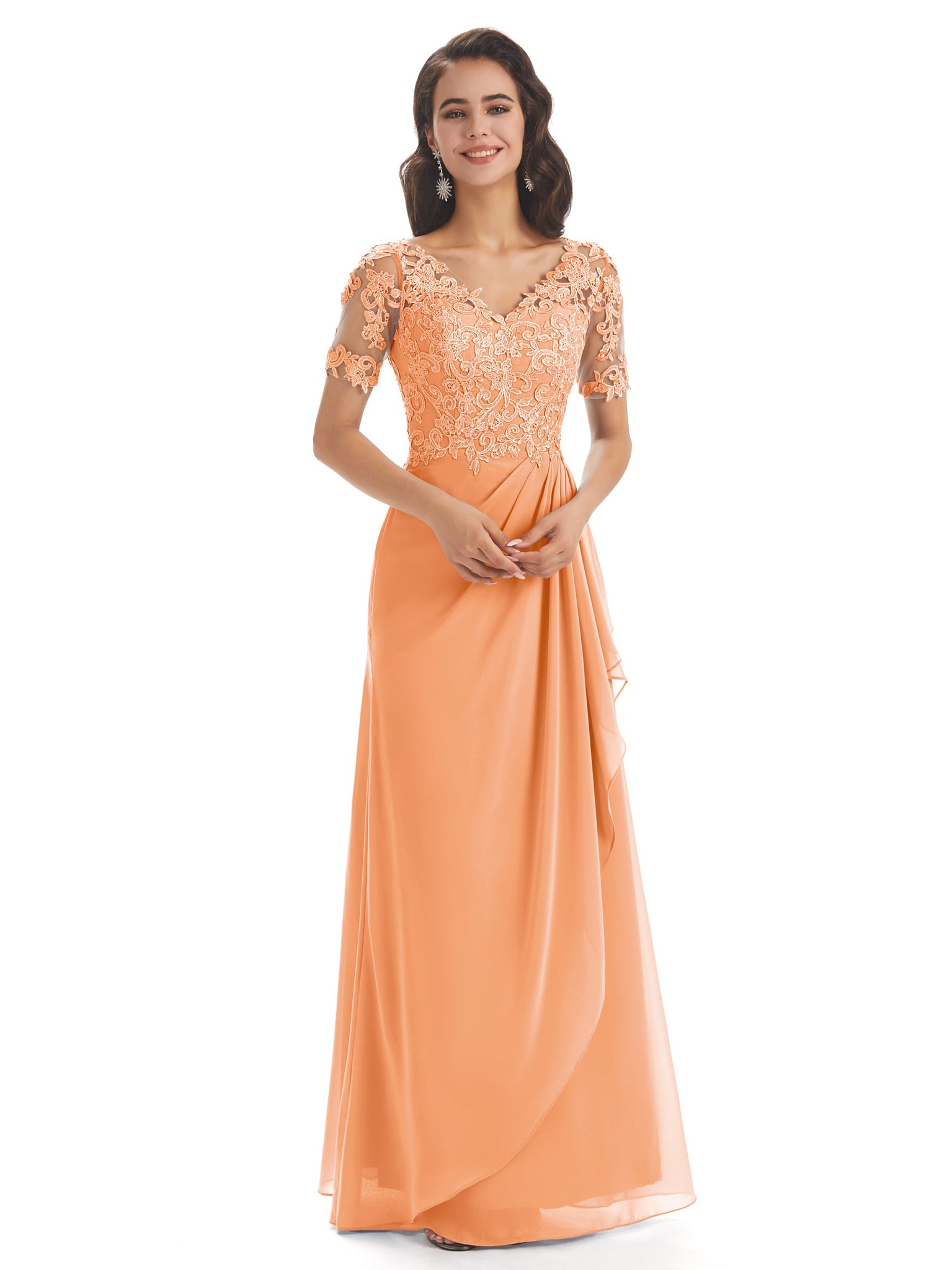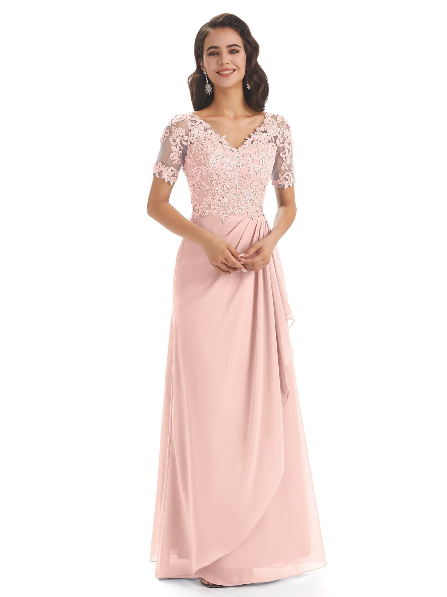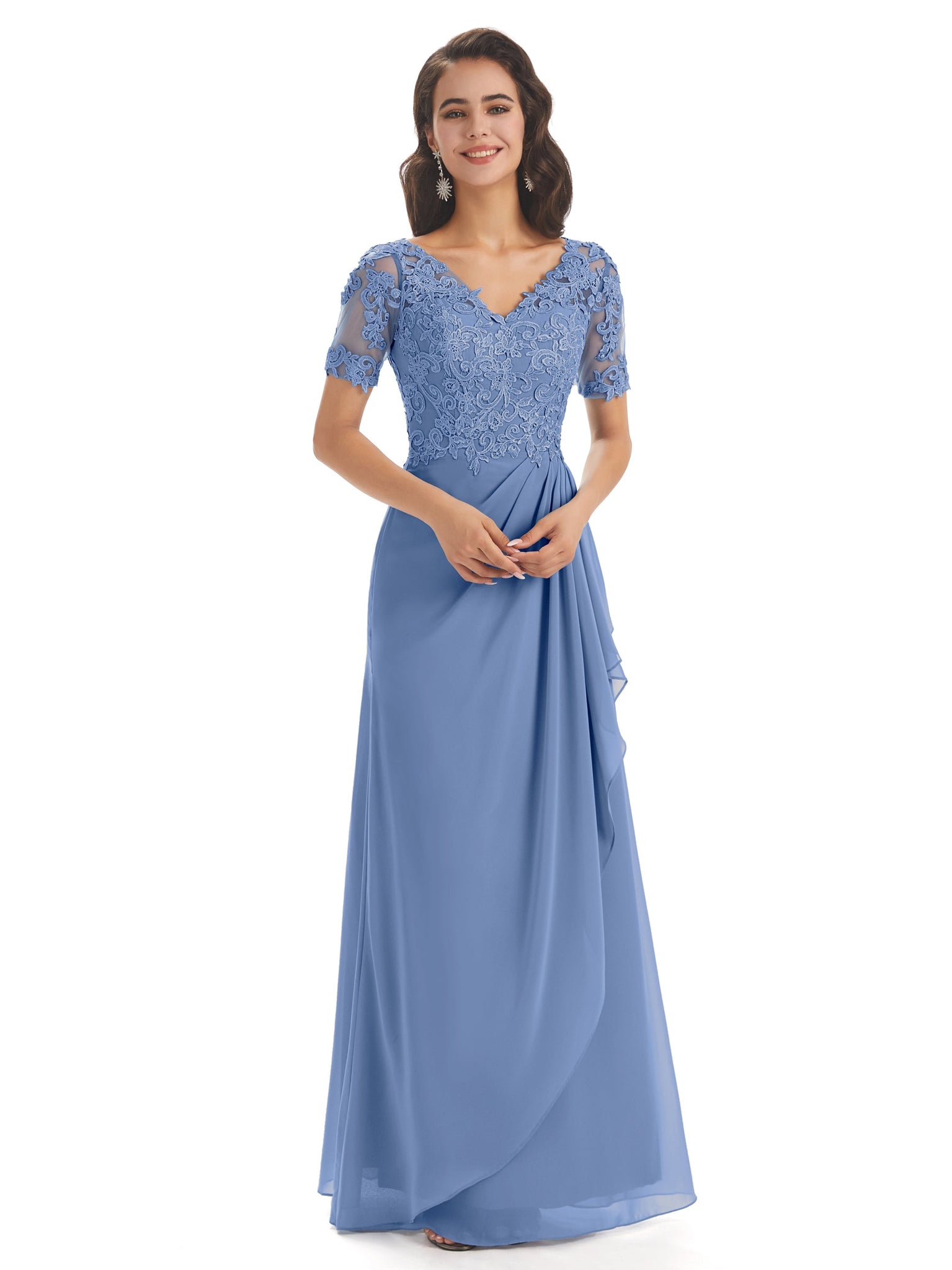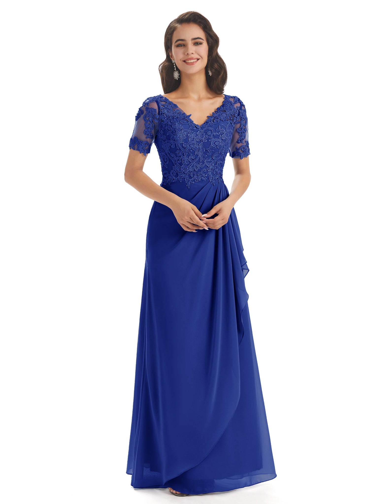 Elegant Lace Short Sleeves Chiffon V-neck Long Mother of The Bride Dresses UK