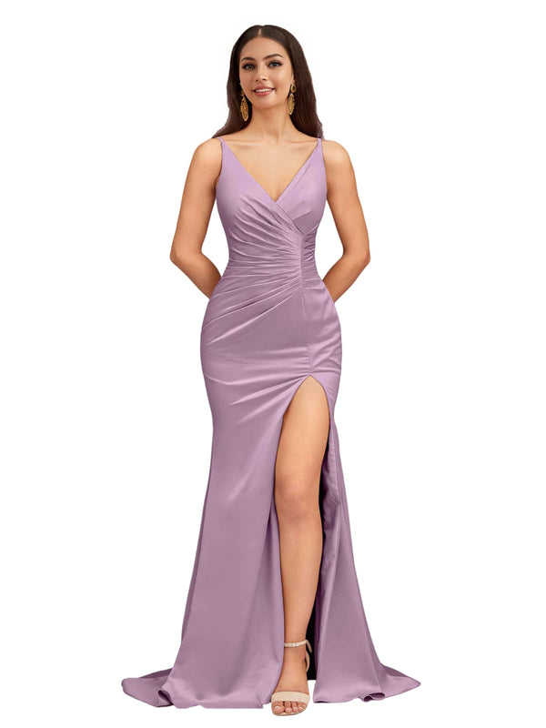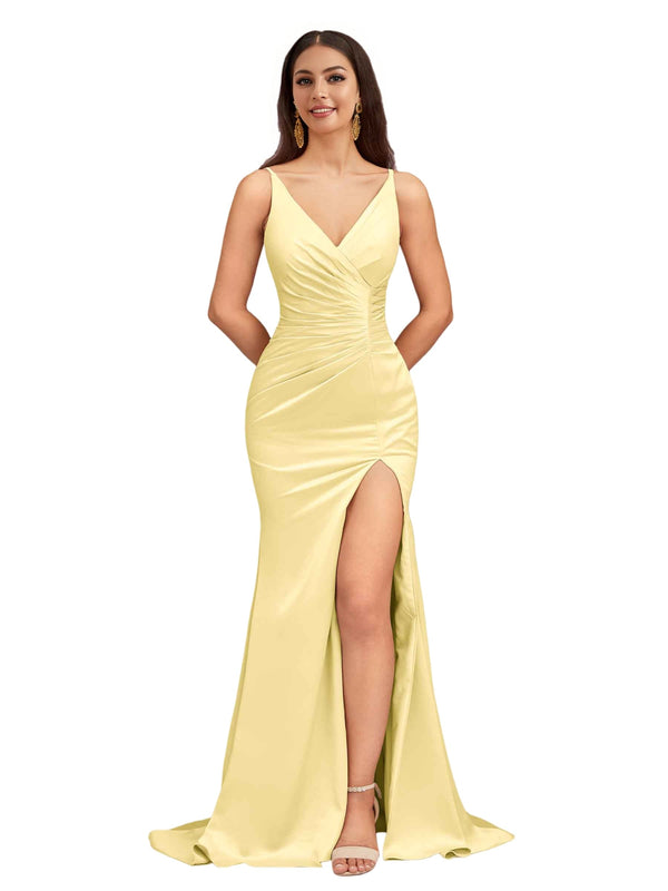 Elegant Spaghetti Straps V-Neck Side Slit Mermaid Stretch Satin Long Bridesmaid Dresses