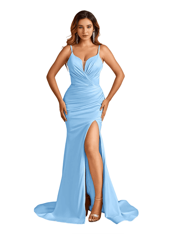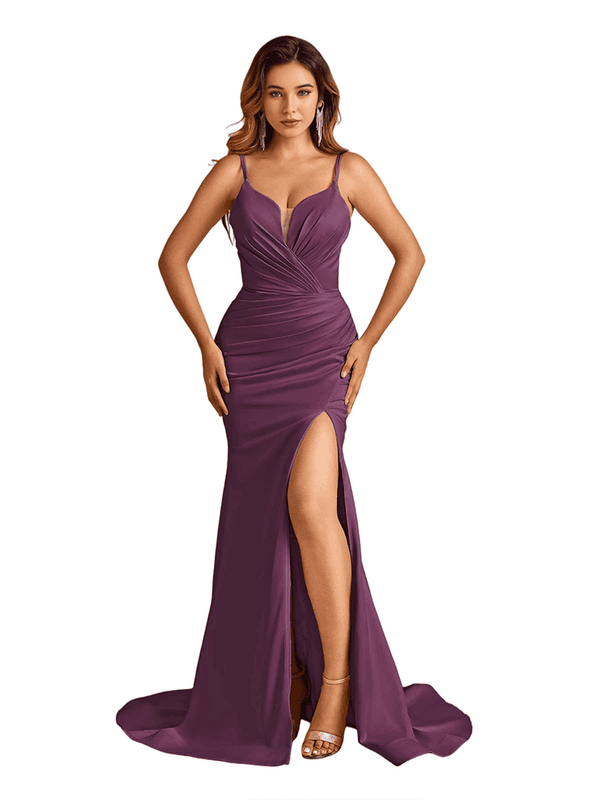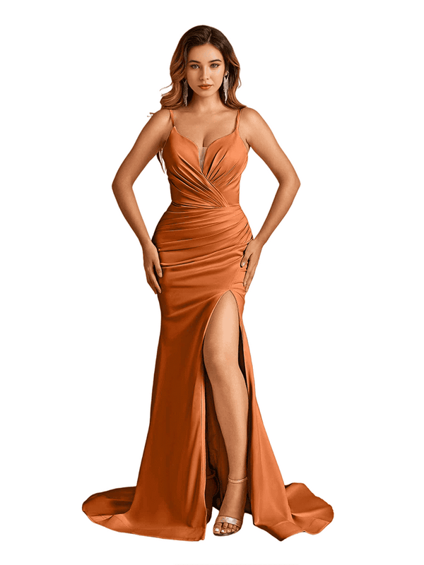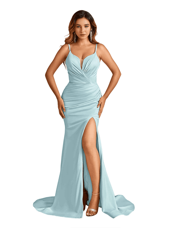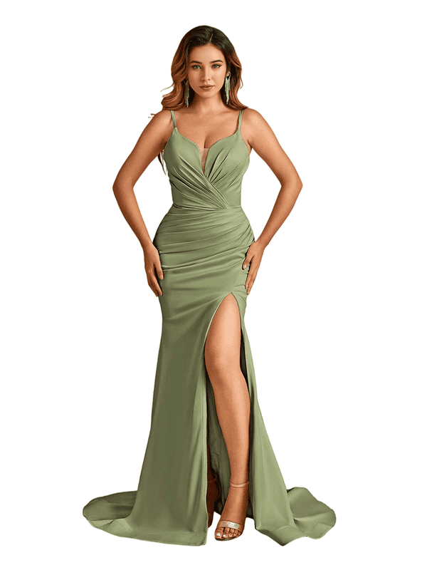 Elegant Spaghetti Straps V-Neck Side Slit Ruched Mermaid Soft Satin Long Bridesmaid Dresses - ChicSew