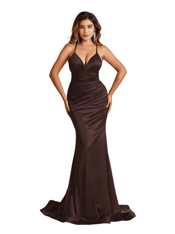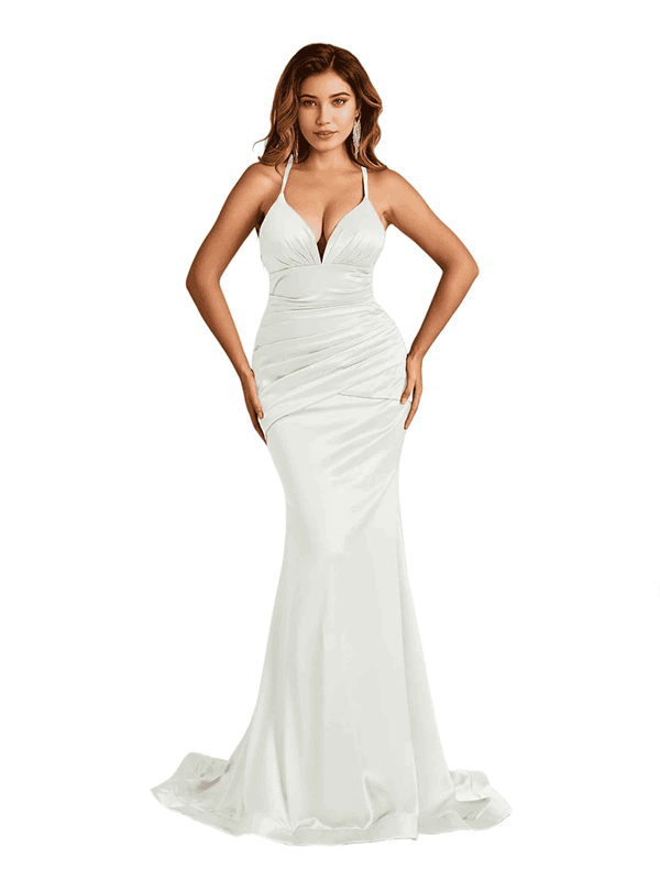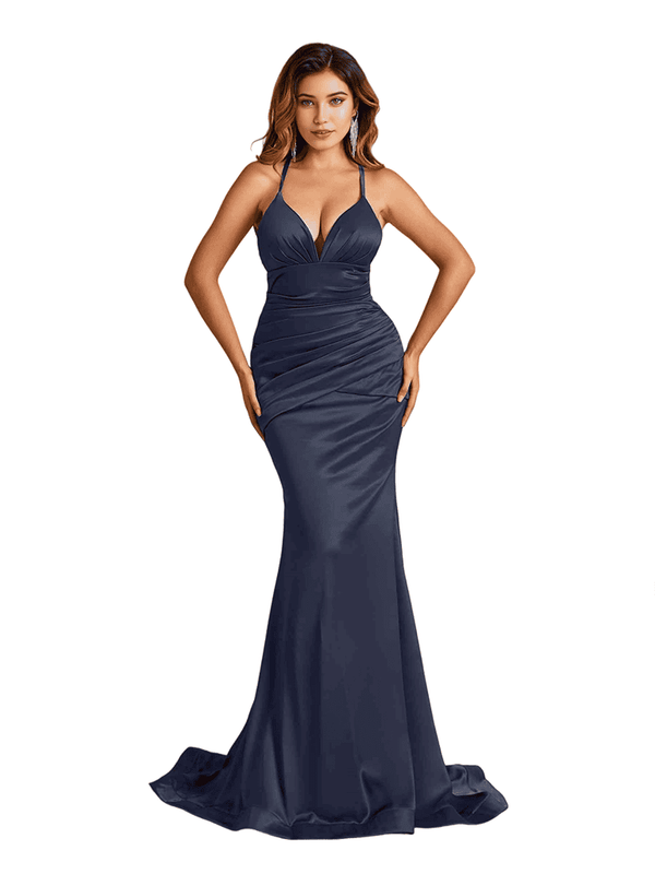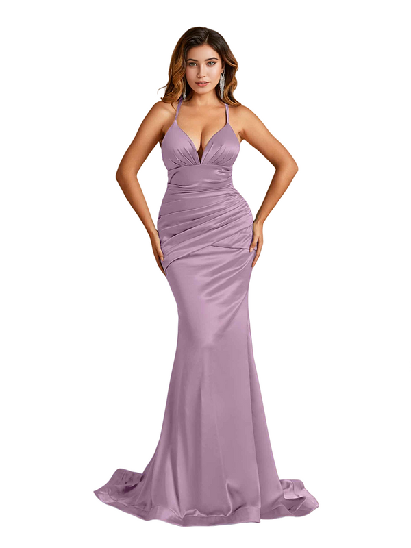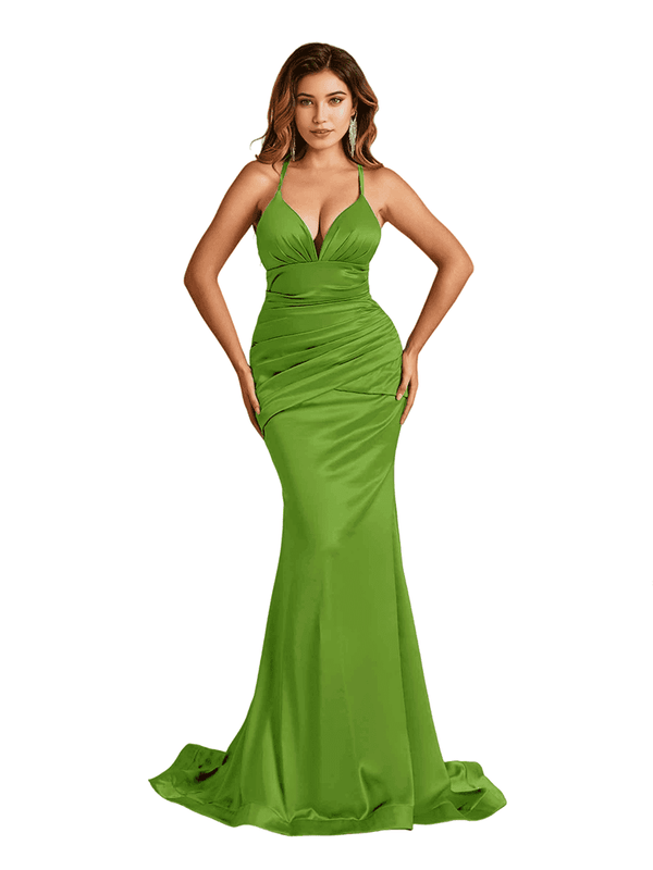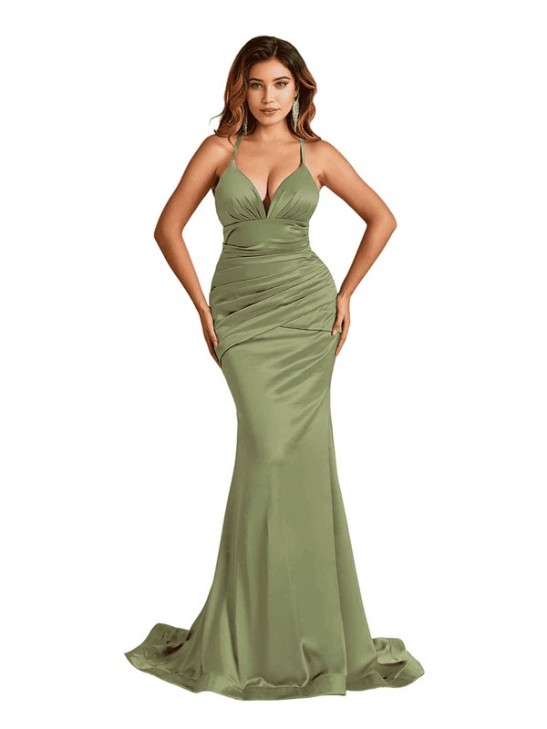 Sexy Criss Cross V-Neck Ruched Mermaid Soft Satin Long Bridesmaid Dresses Online