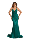Sexy Spaghetti Straps V-Neck Ruched Mermaid Soft Satin Long Bridesmaid Dresses Online - ChicSew