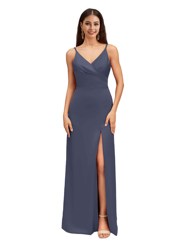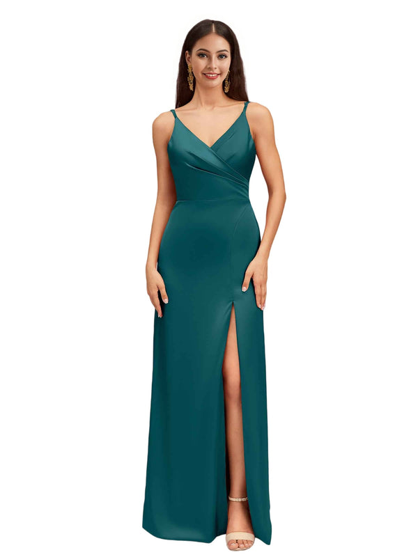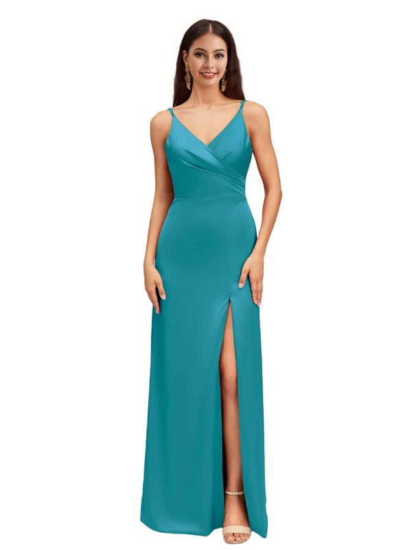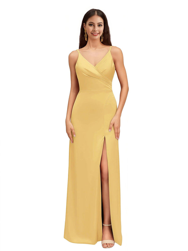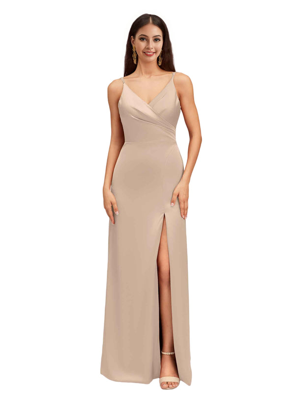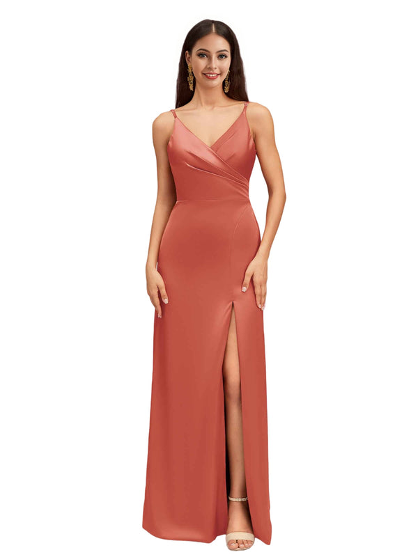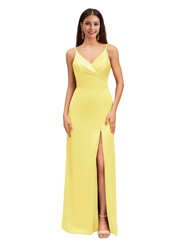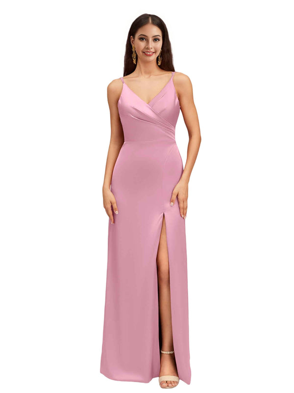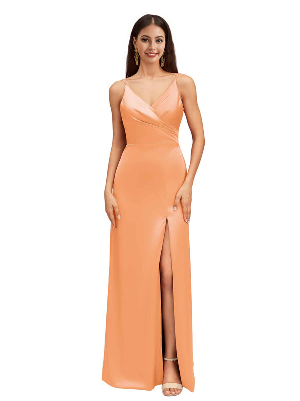 Elegant Spaghetti Straps V-Neck A-Line Soft Satin Simple Floor Length Bridesmaid Dresses