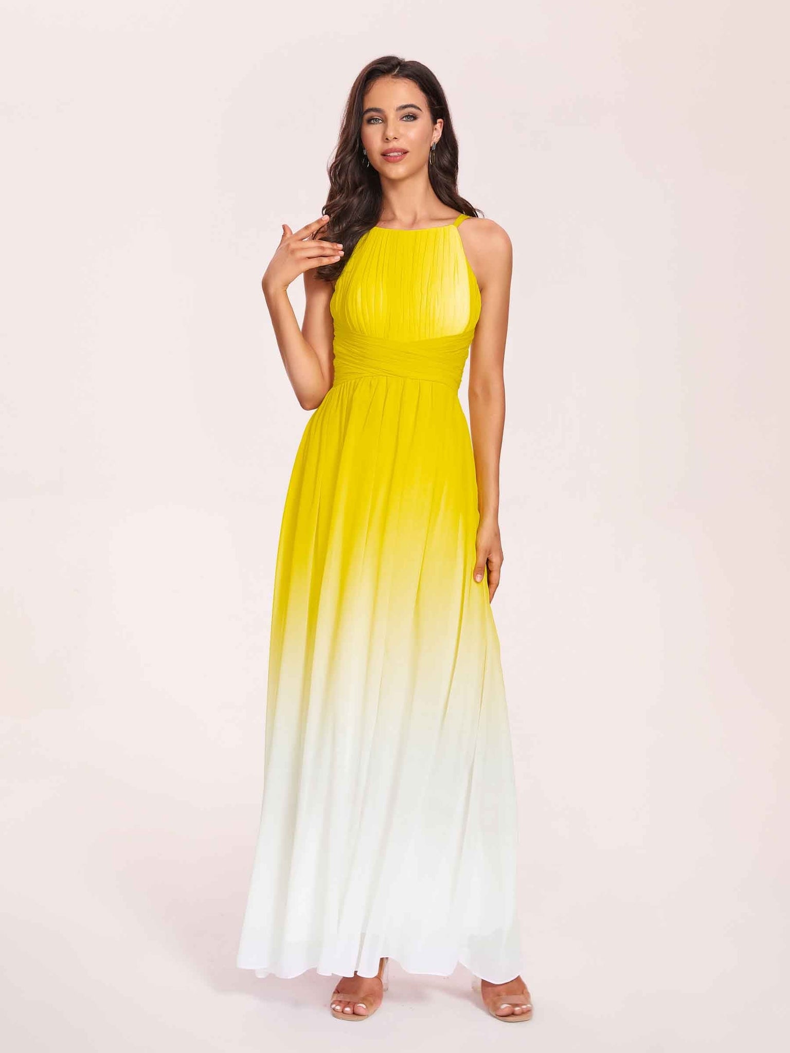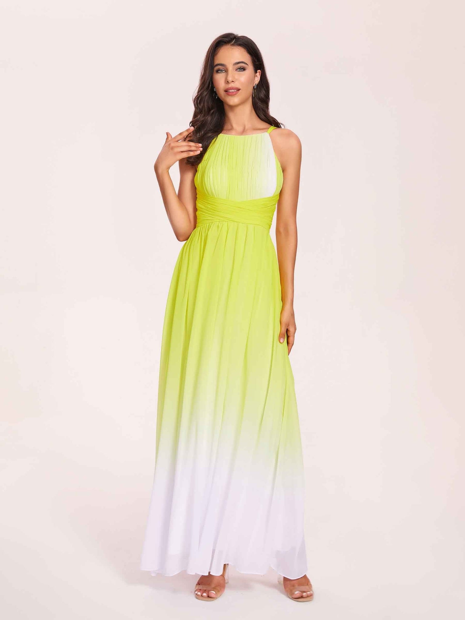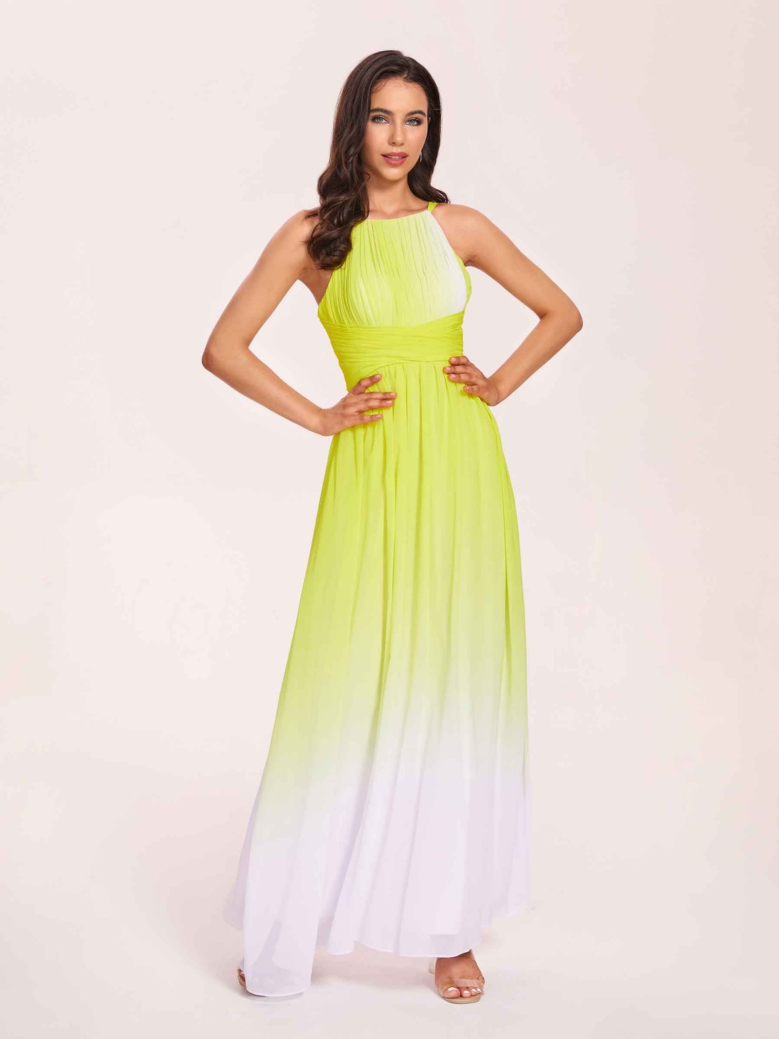 Halter Floral A-line Ombre Chiffon Long Bridesmaid Dresses Online - ChicSew
