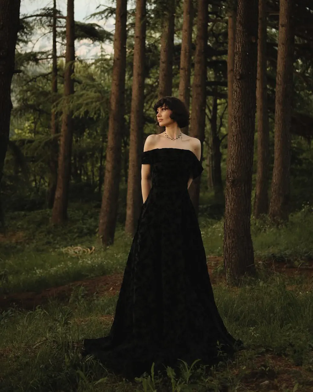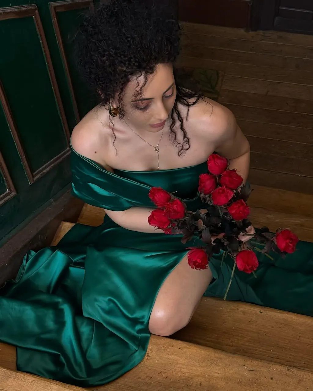 This velvet bridesmaid dresses had everyone staring! The side slit adds just the right amount of drama, while the off-shoulder neckline kept it elegant. The floral embroidery is even more stunning in person . 10/10 would recommend for any formal wedding!