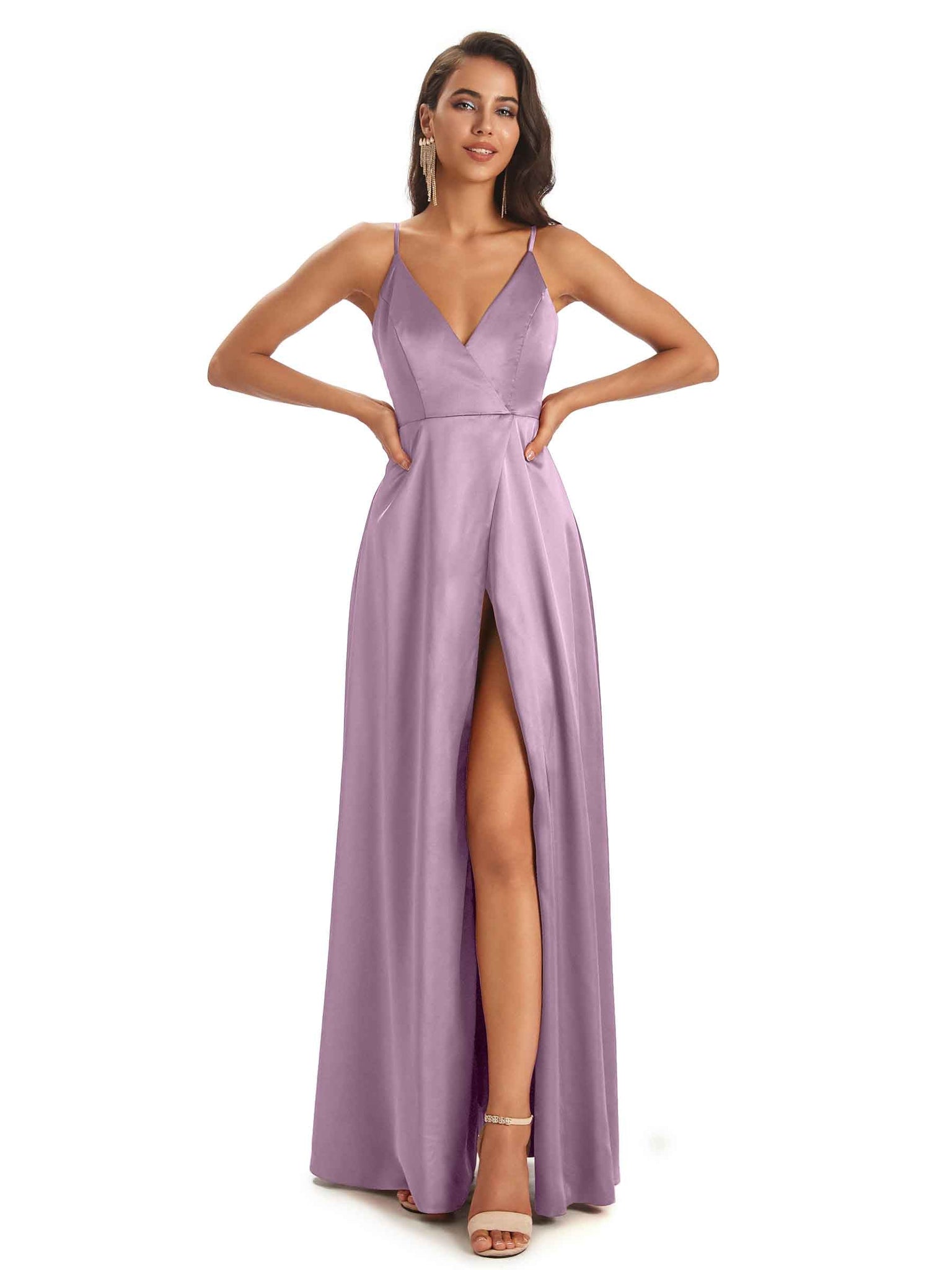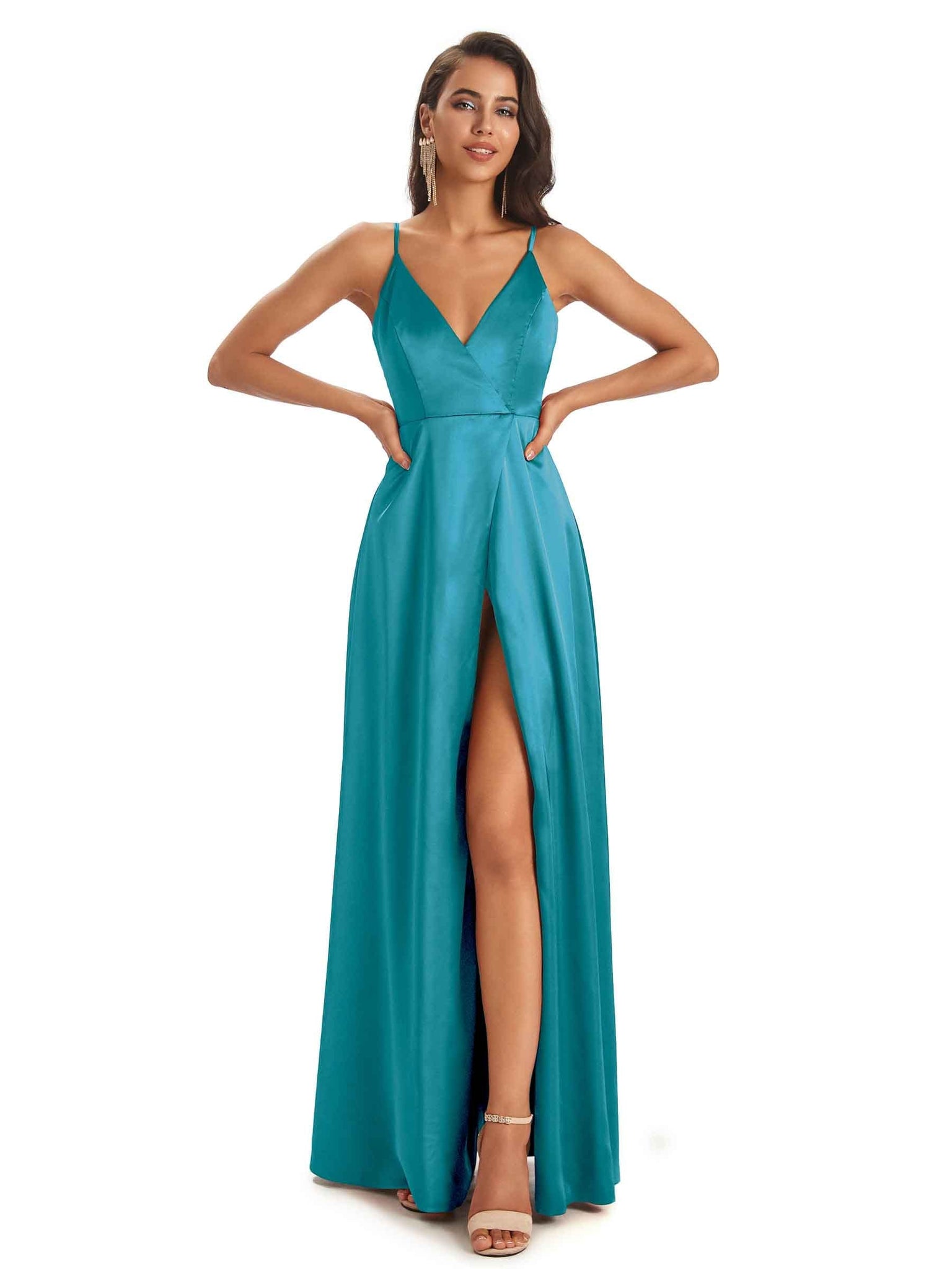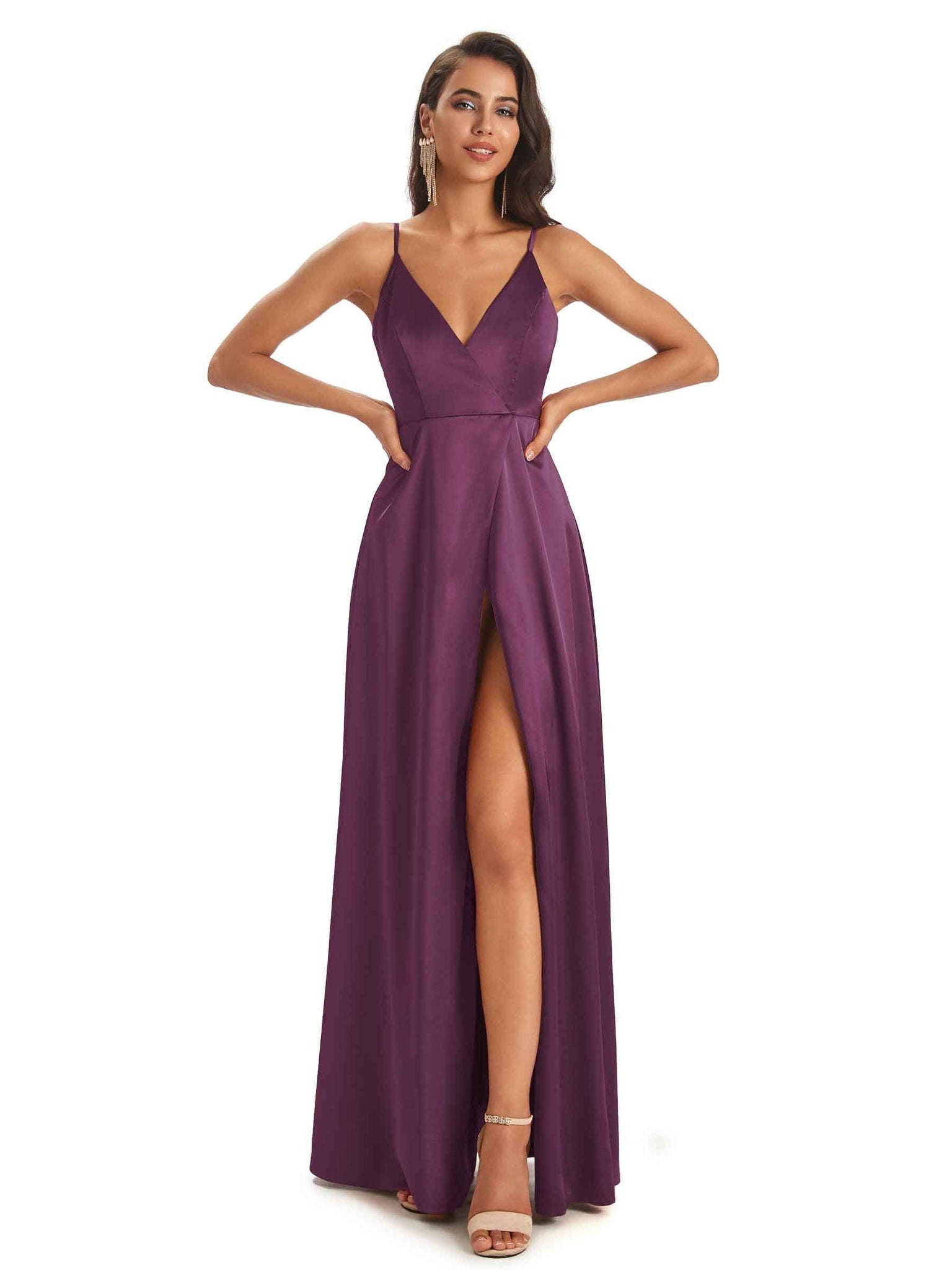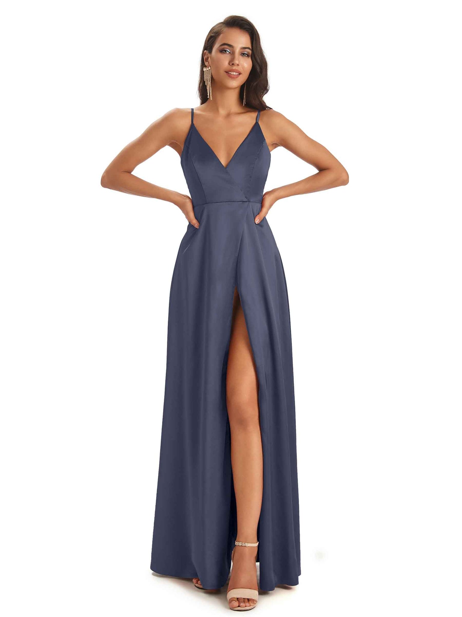A line V-neck Silky Satin Side Slit Long Modern Bridesmaid Dresses UK
