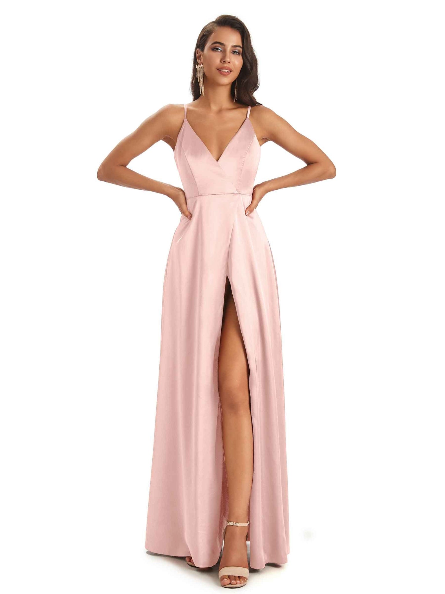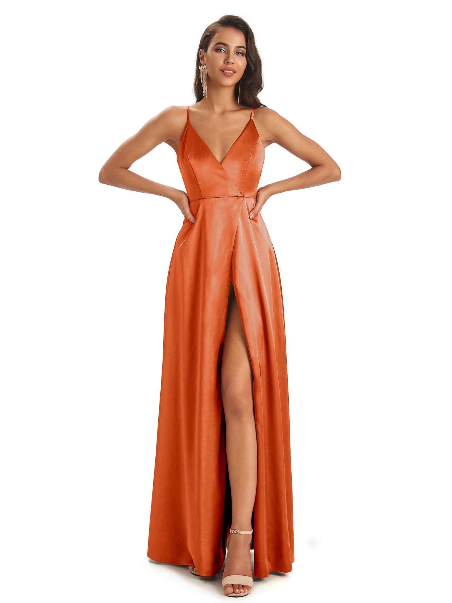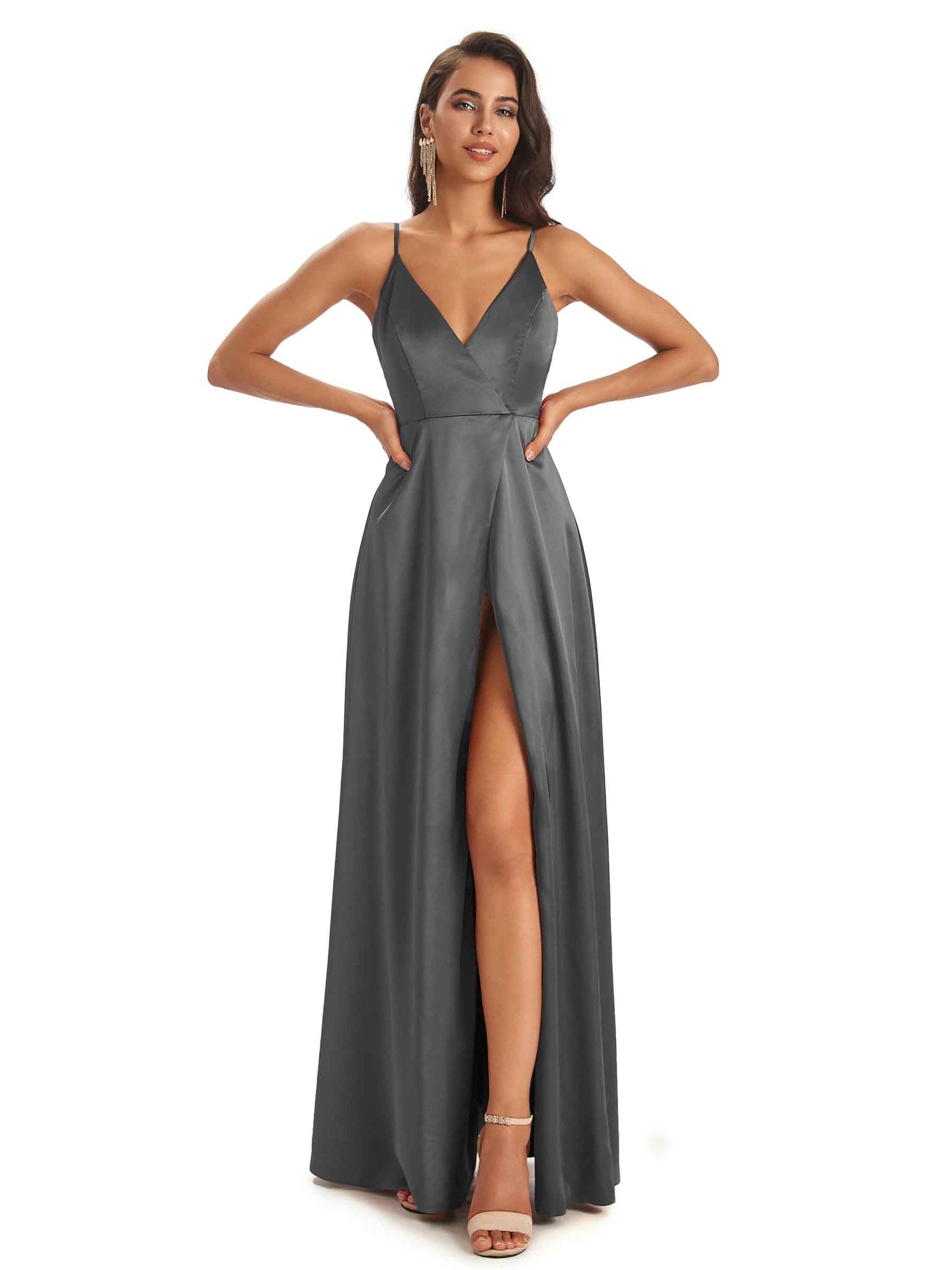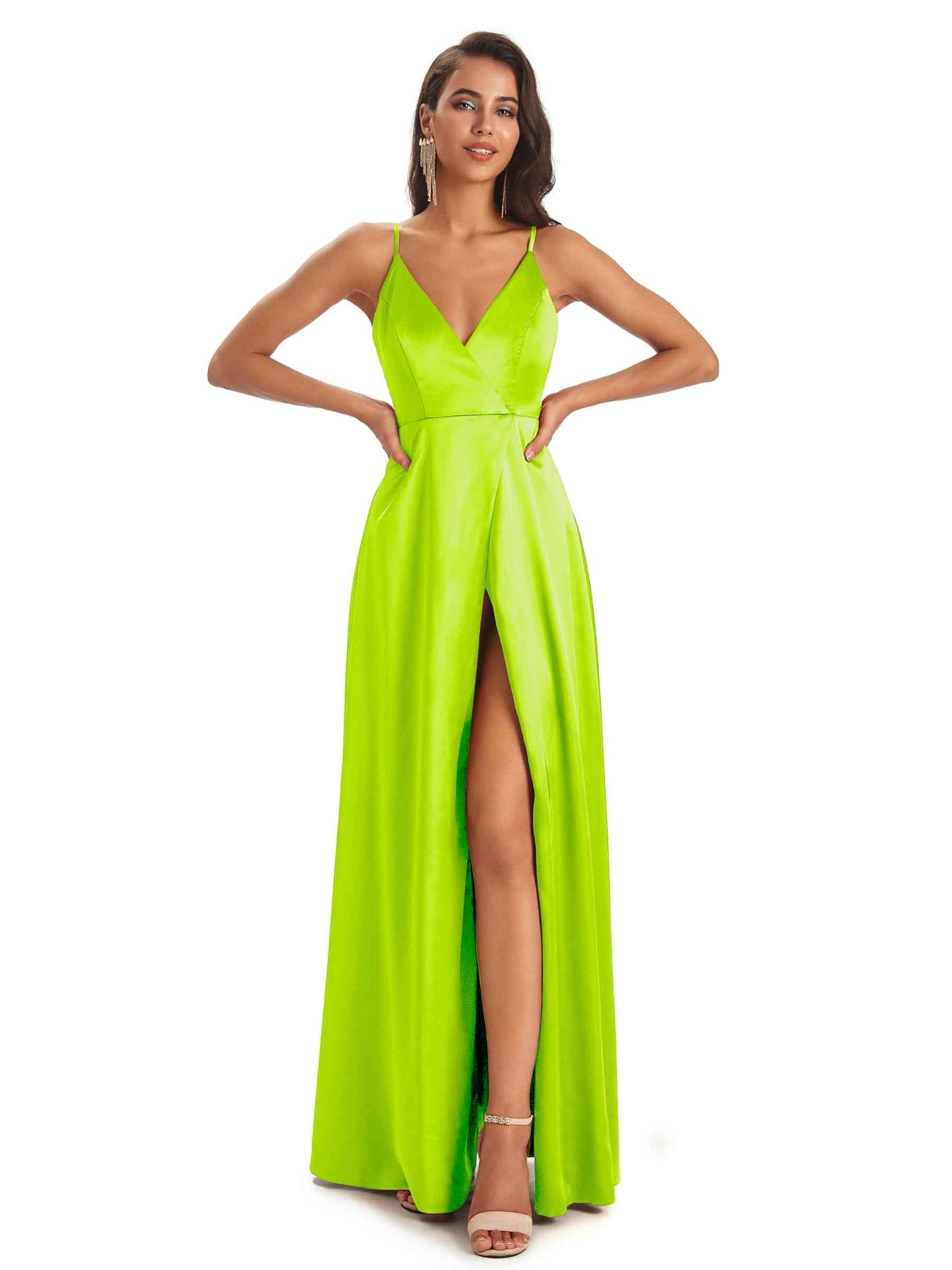 A line V-neck Silky Satin Side Slit Long Modern Bridesmaid Dresses UK