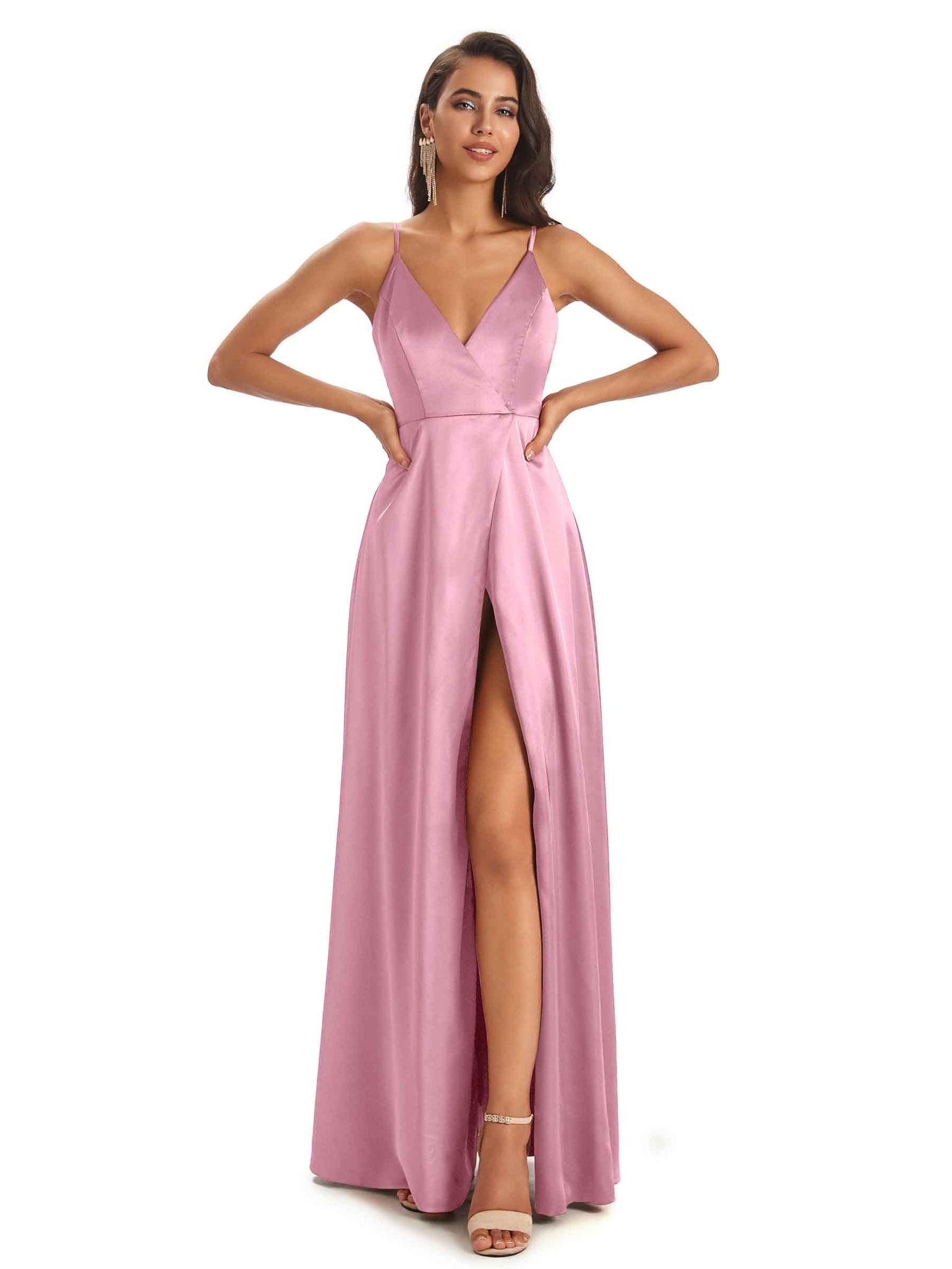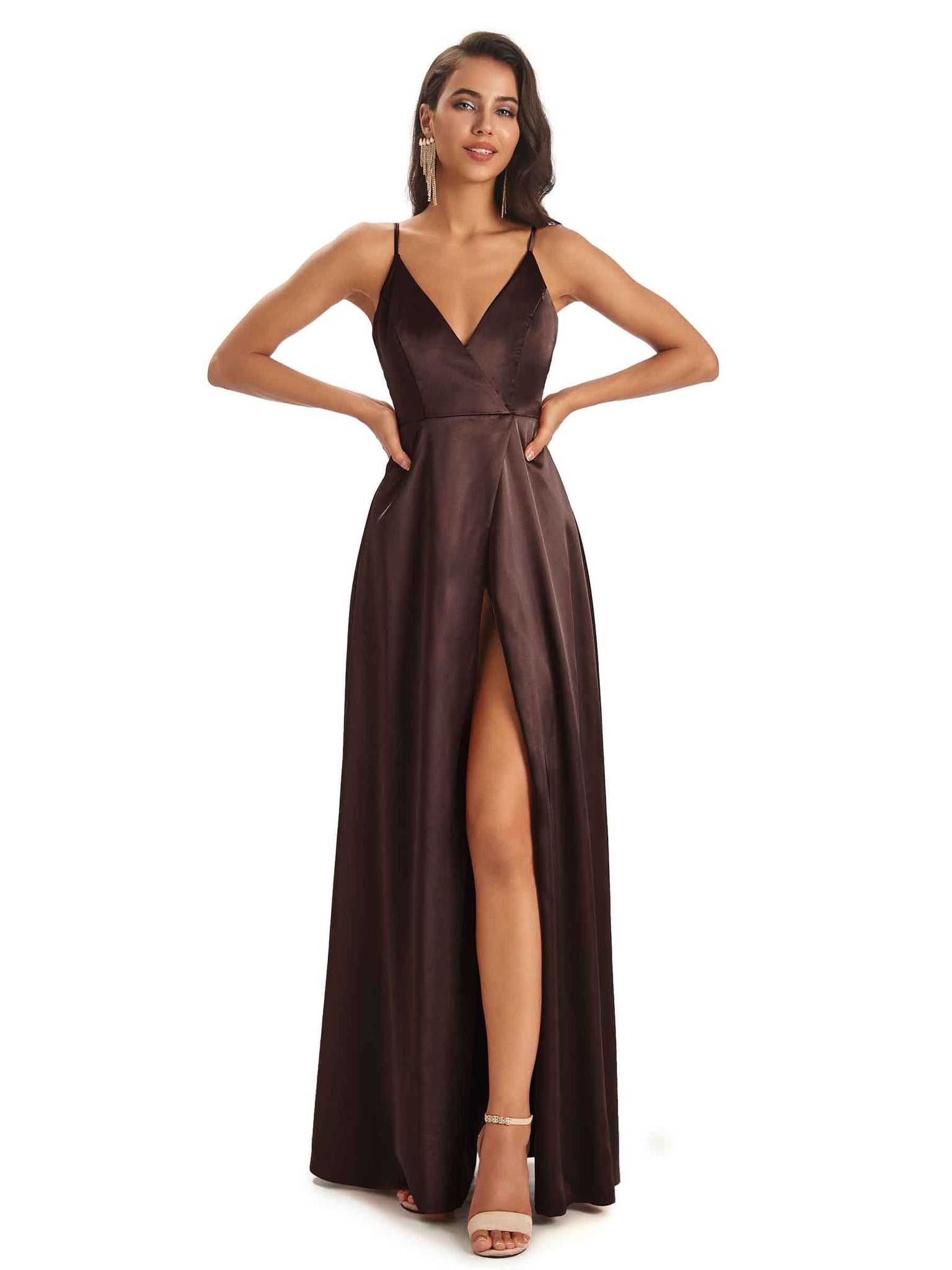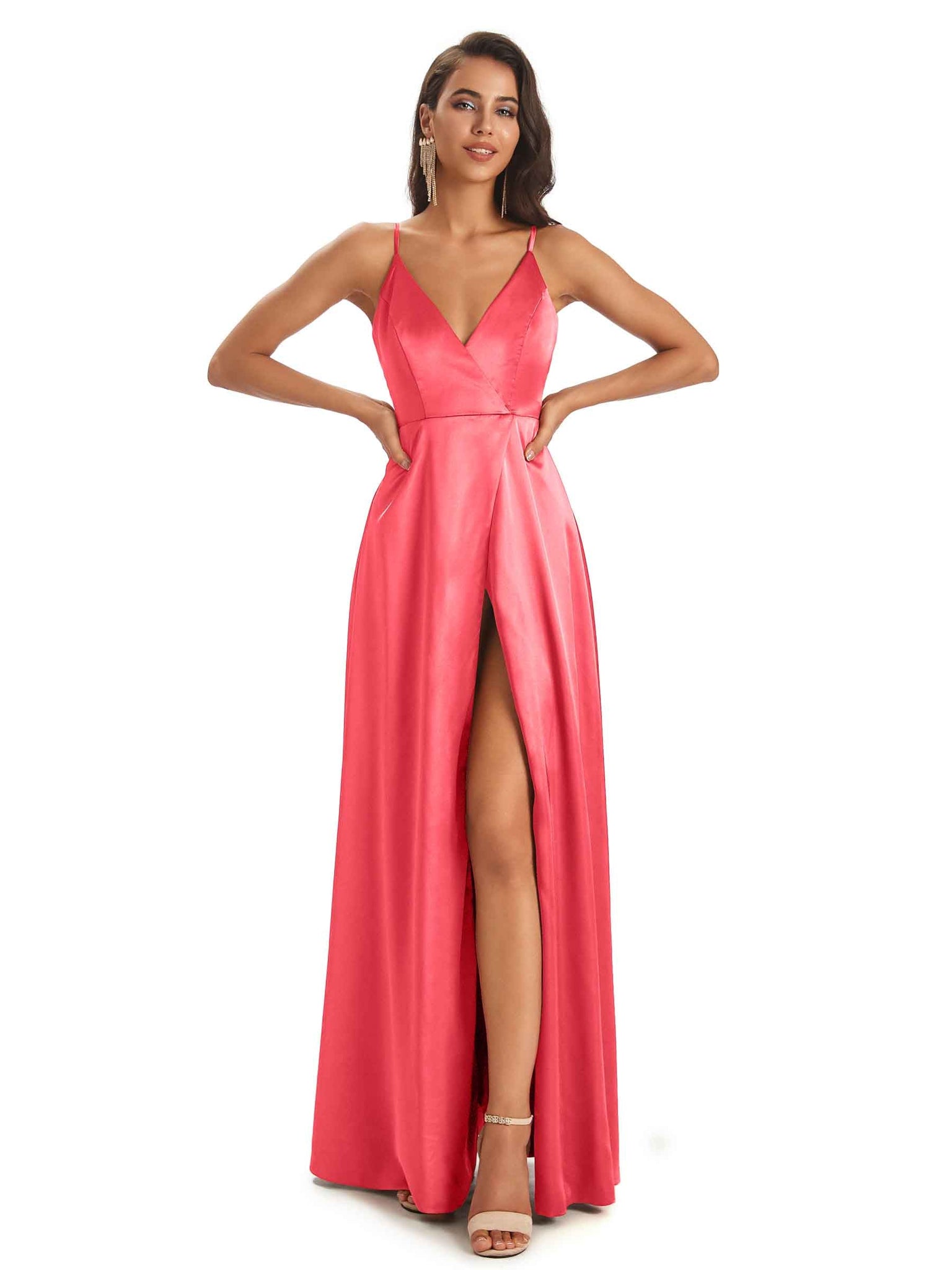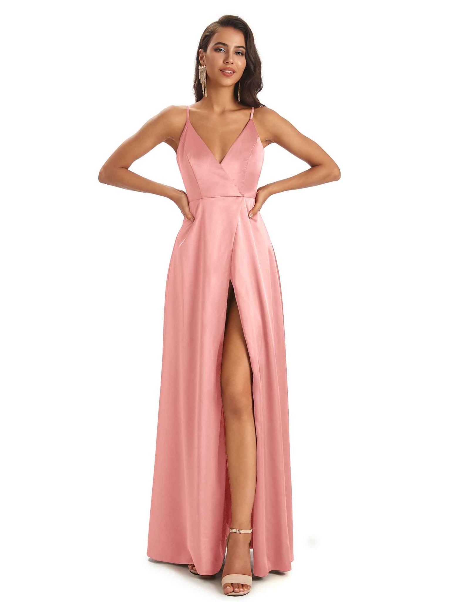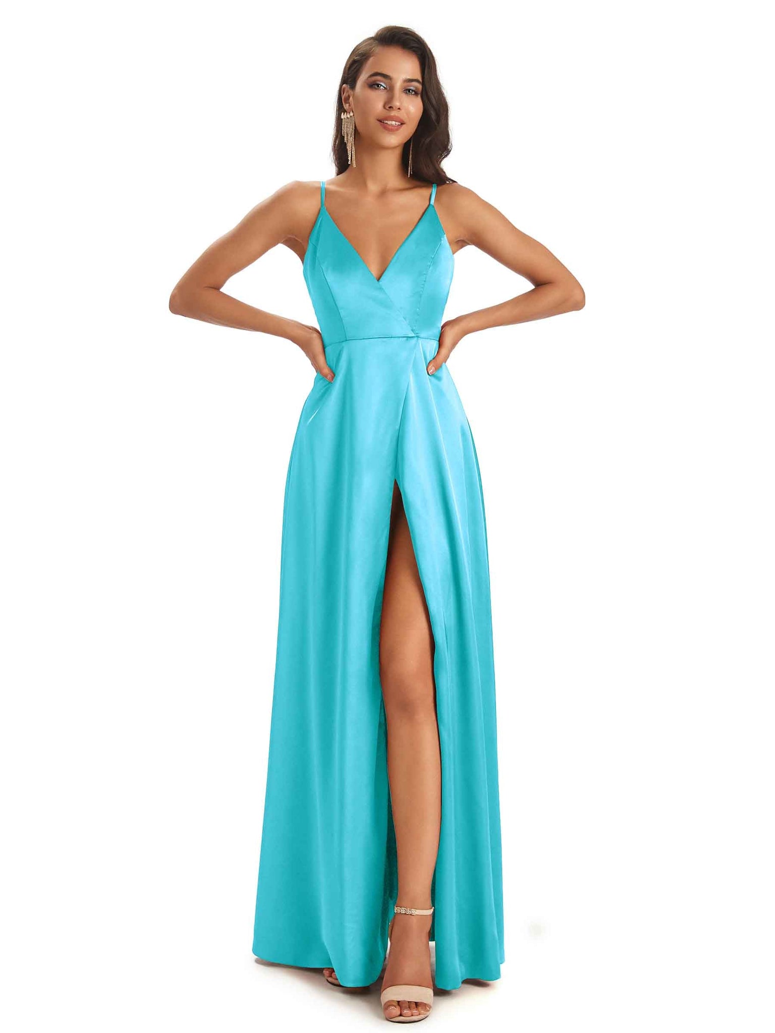 A line V-neck Silky Satin Side Slit Long Modern Bridesmaid Dresses UK