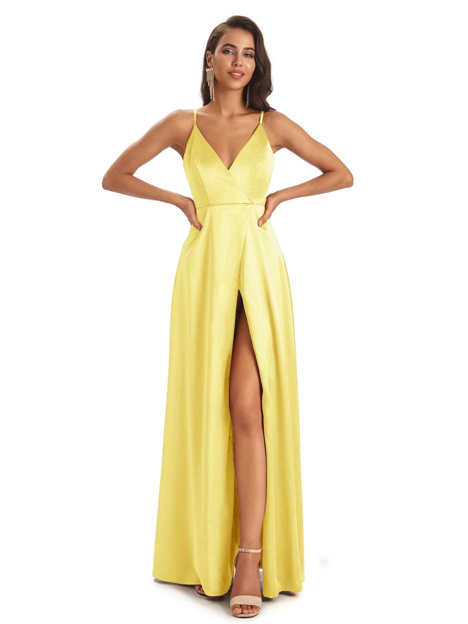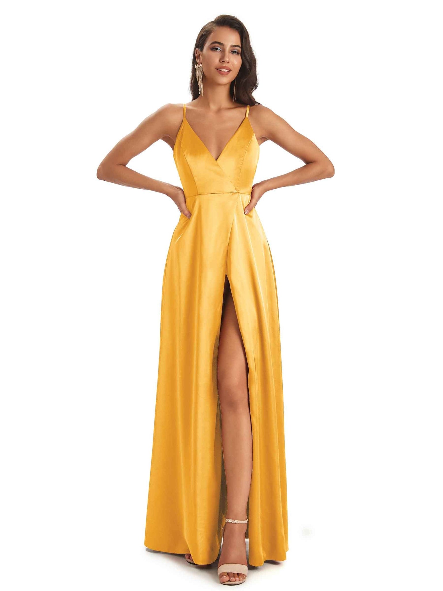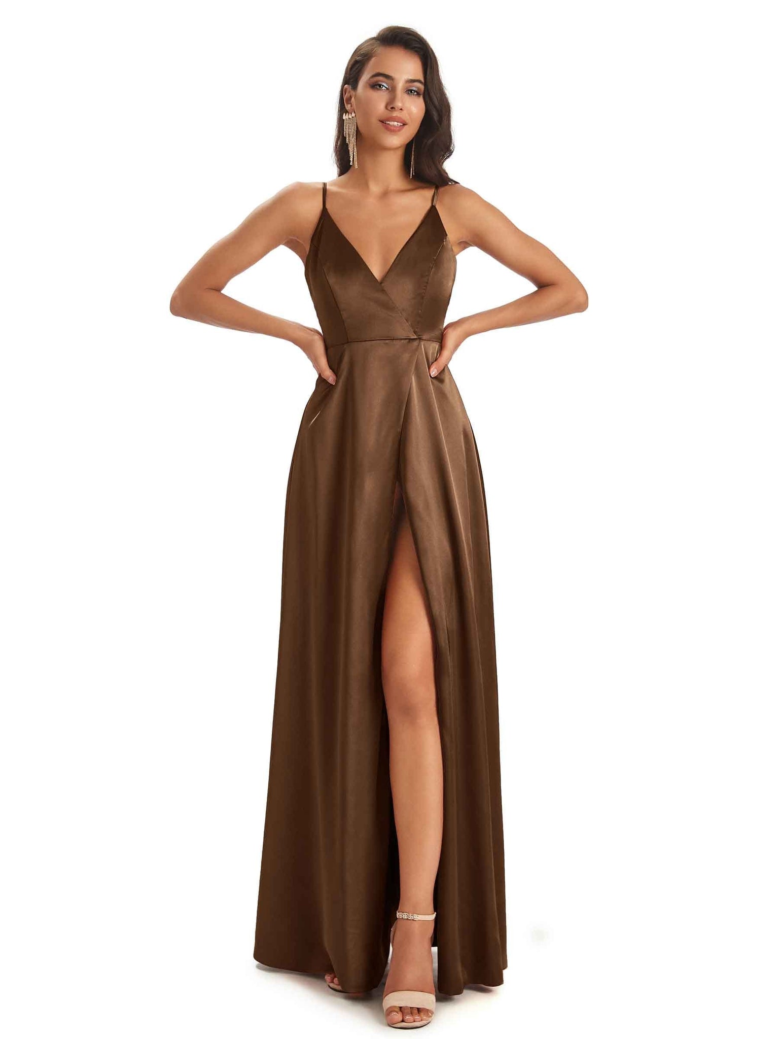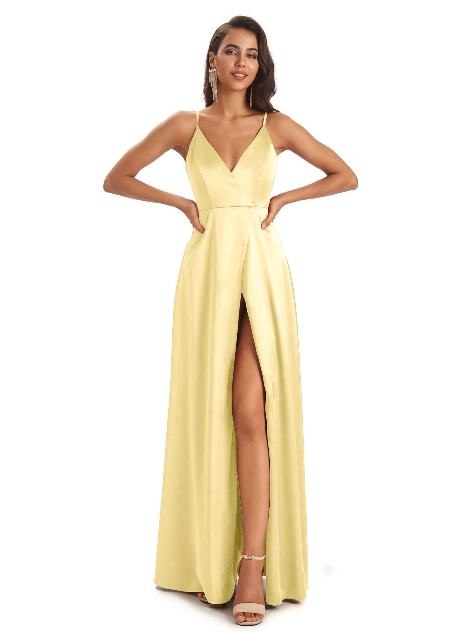 A line V-neck Silky Satin Side Slit Long Modern Bridesmaid Dresses UK