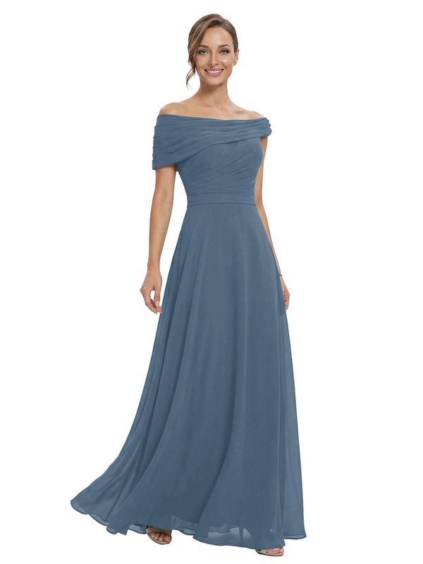 Chicsew Stylish Off Shoulder Chiffon Mother of The Bride Dress Flowy Long Elegant Formal Gown
