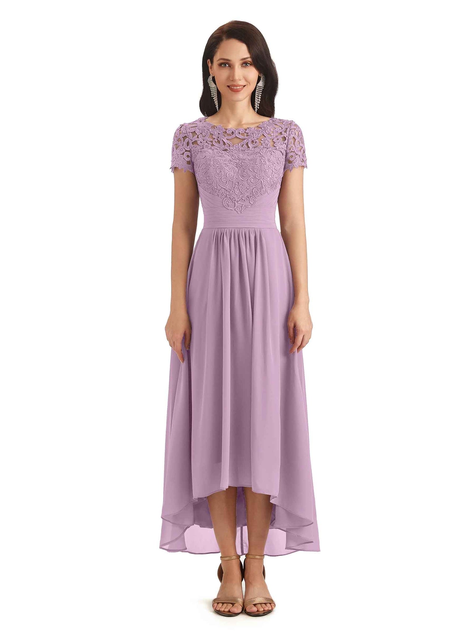 Elegant A-line Chiffon Lace Jewel Short Sleeves High Low Mother Of The Bride Dresses - ChicSew