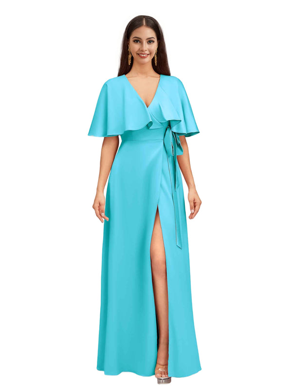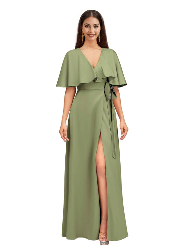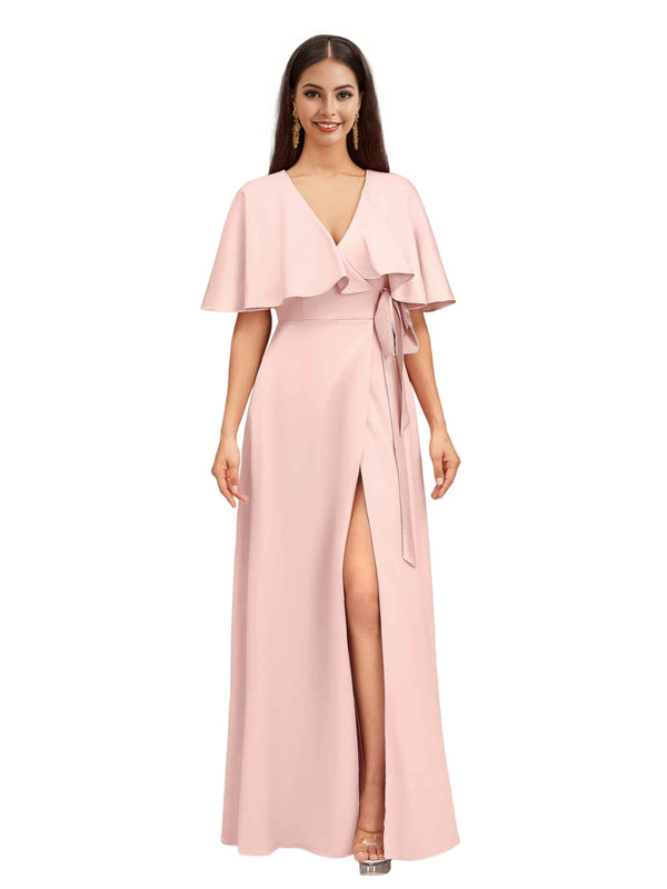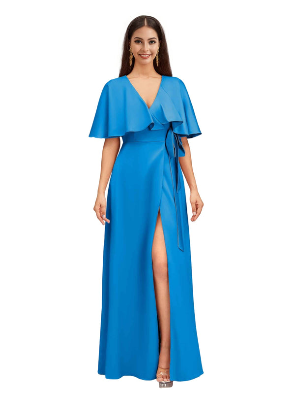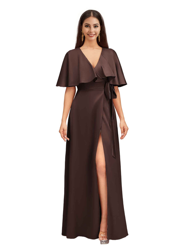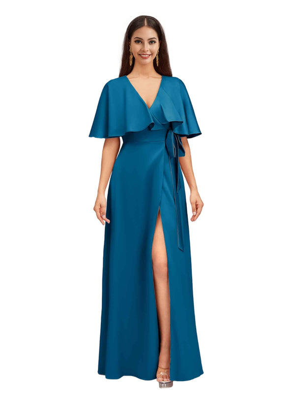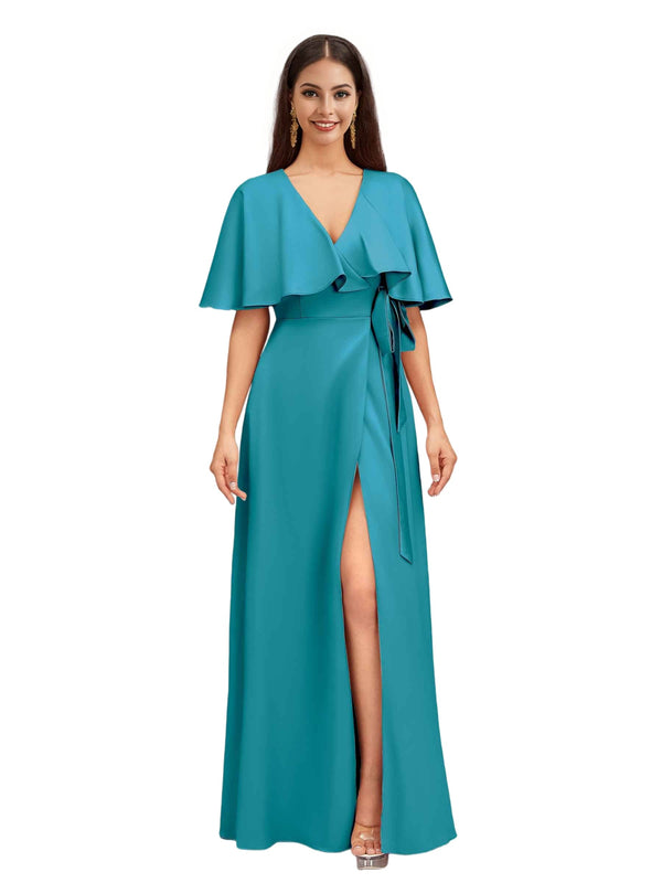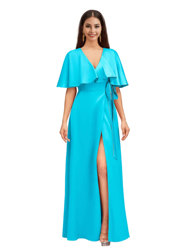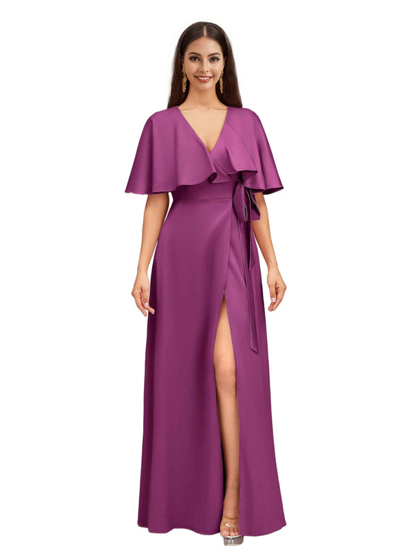 Elegant Bat Sleeves V-neck A-Line Side Slit Long Soft Satin Bridesmaid Dresses