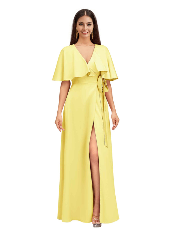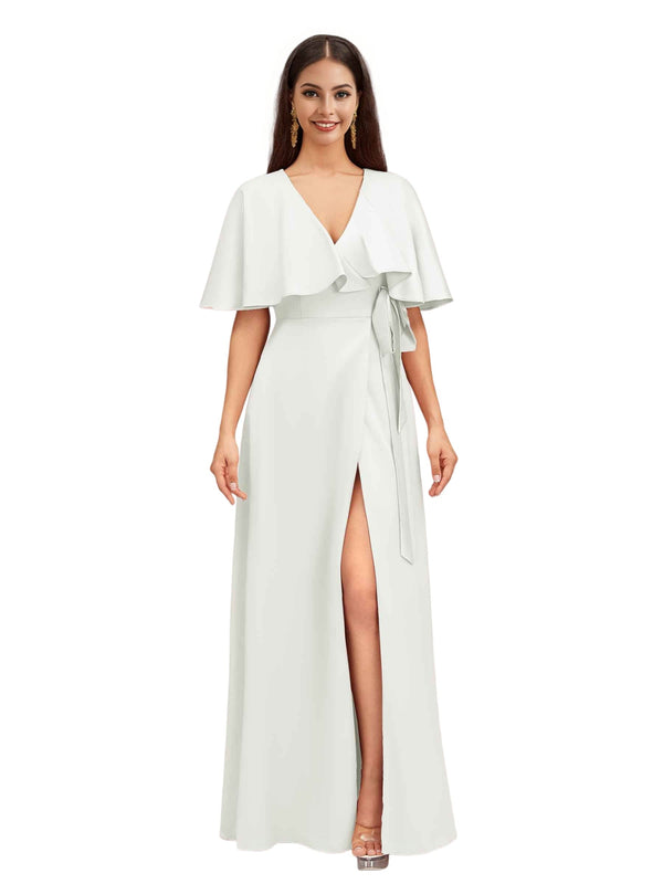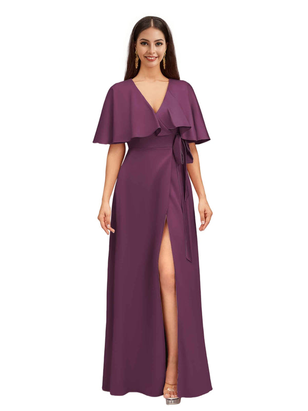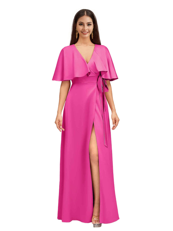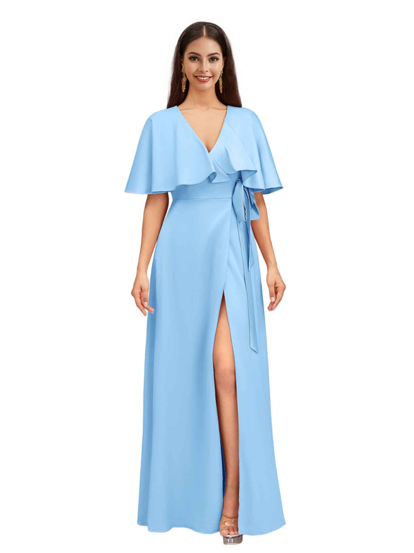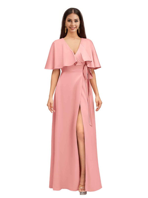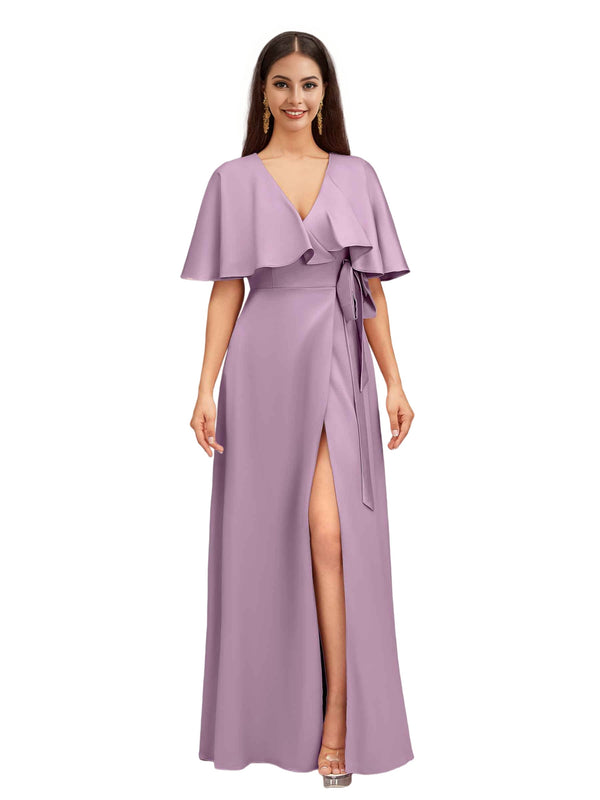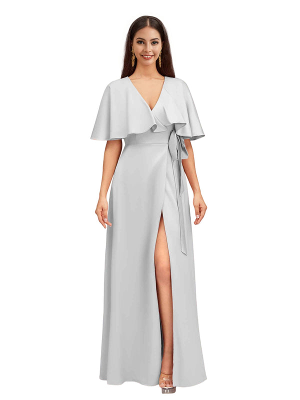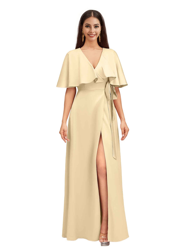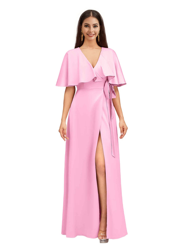 Elegant Bat Sleeves V-neck A-Line Side Slit Long Soft Satin Bridesmaid Dresses