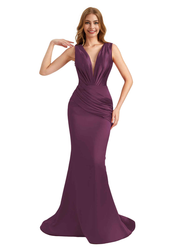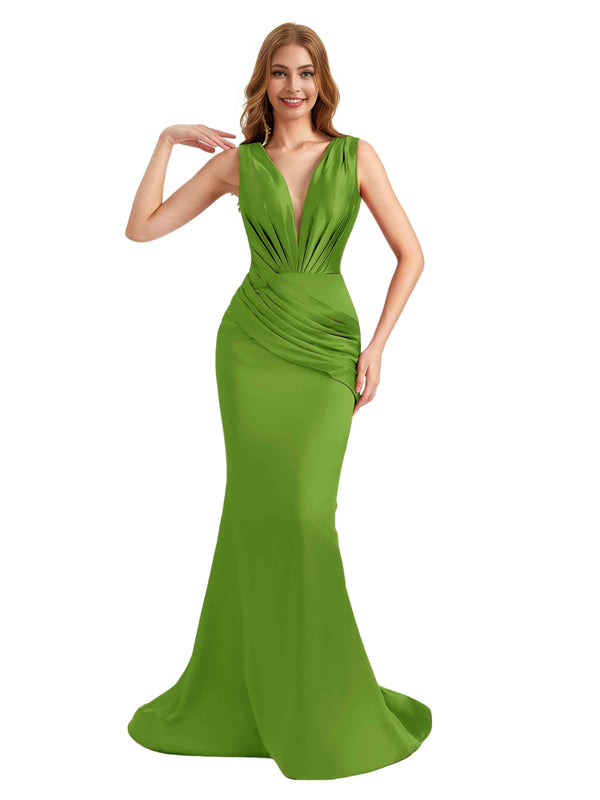 Elegant Deep V-Neck Silky Satin Pleated Mermaid Long Bridesmaid Dresses Online