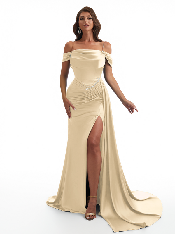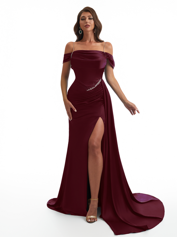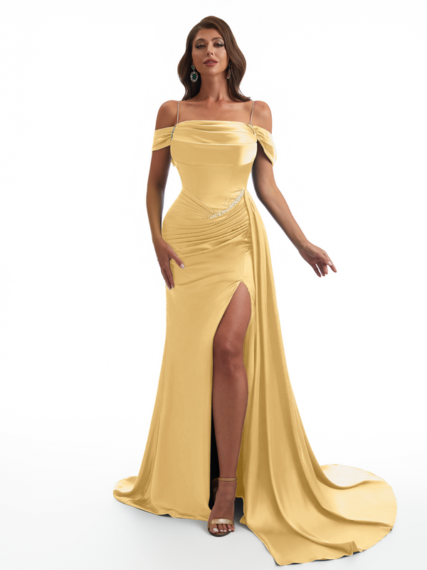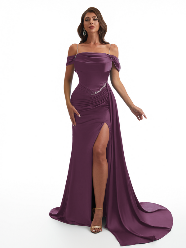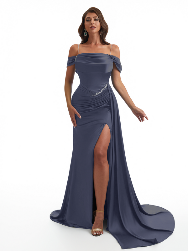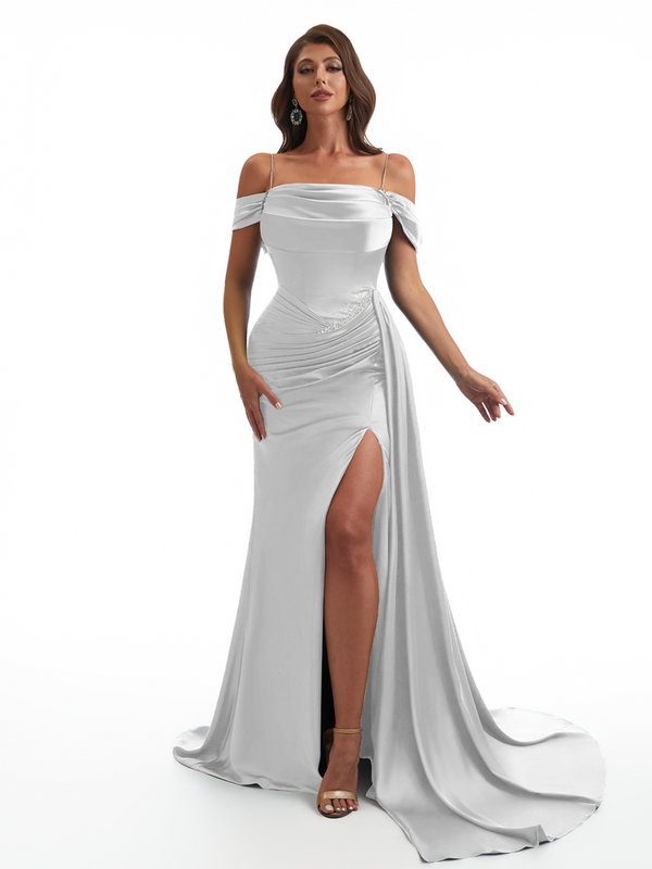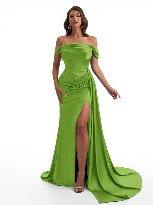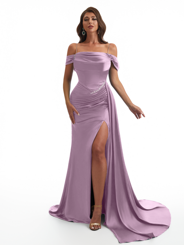 Elegant Off The Shoulder Mermaid Side Slit Soft Satin Unique Long Bridesmaid Dresses Online