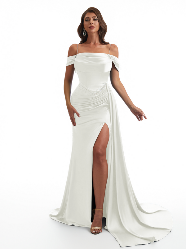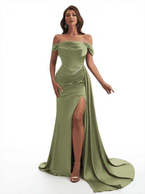 Elegant Off The Shoulder Mermaid Side Slit Soft Satin Unique Long Bridesmaid Dresses Online - ChicSew