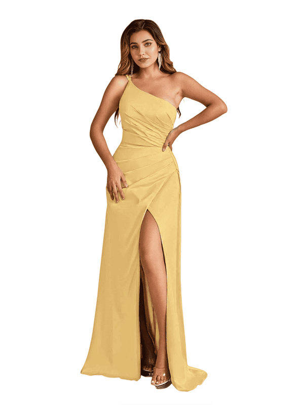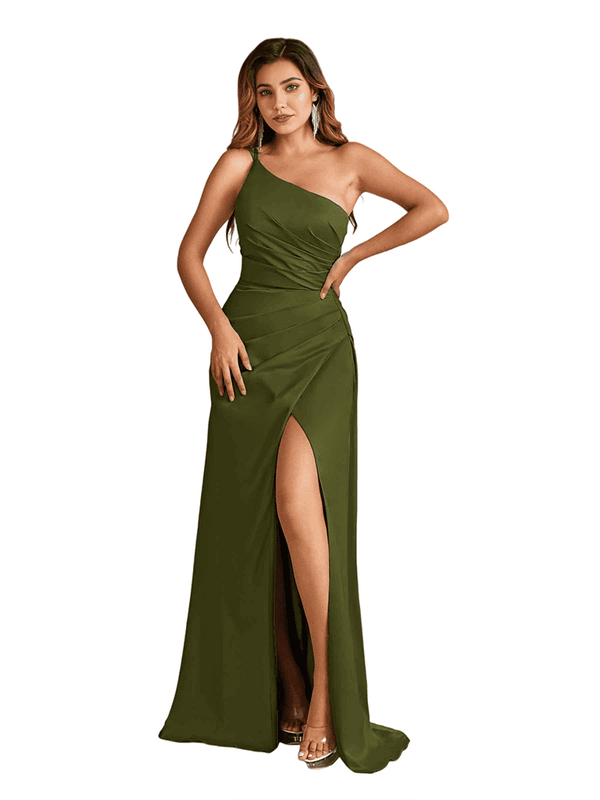 Elegant One Shoulder Mermaid Side Slit Soft Satin Long Wedding Bridesmaid Dresses