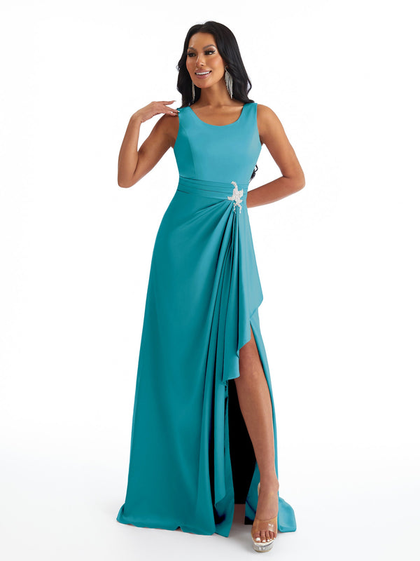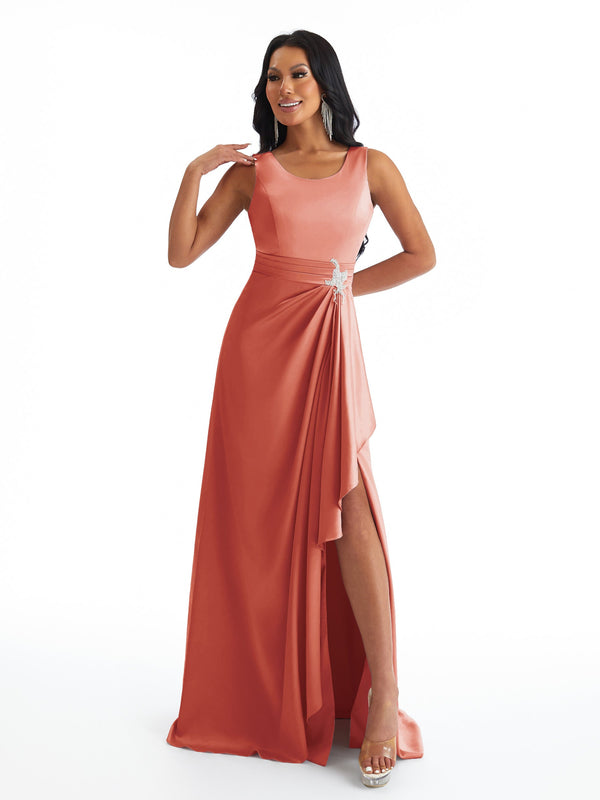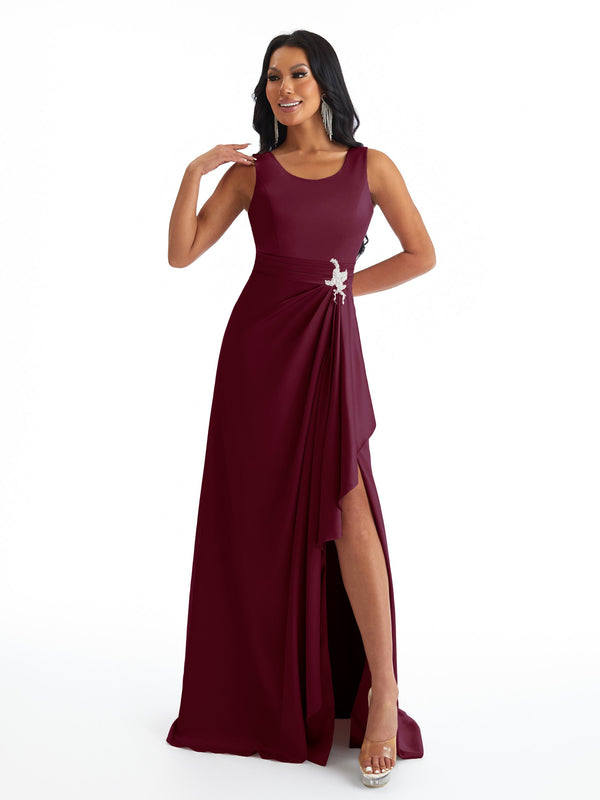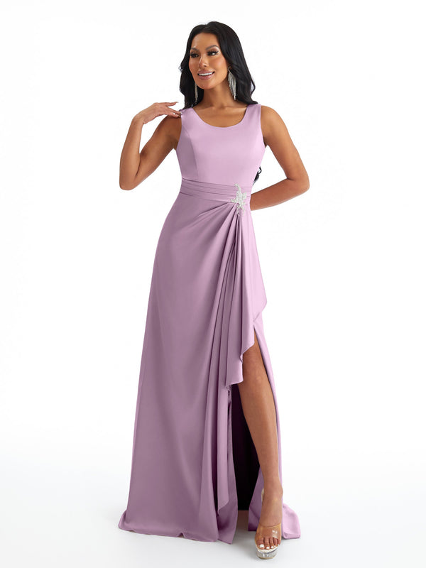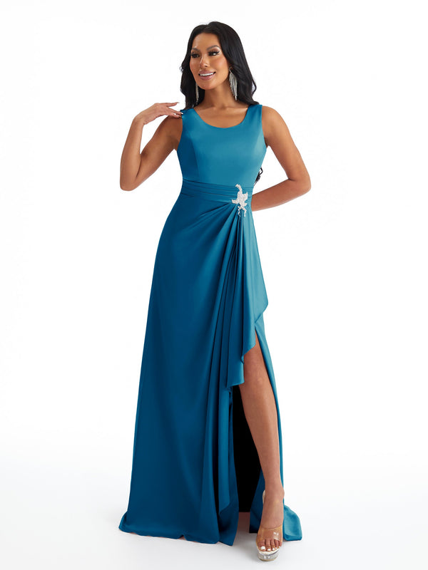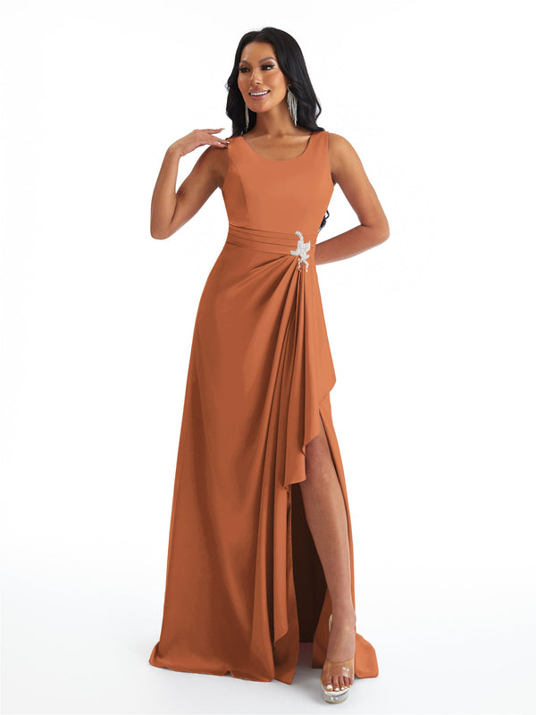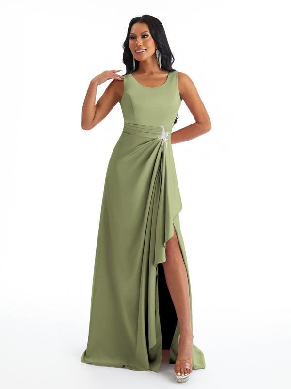 Elegant Scoop Side Slit Lace Applique A-Line Pleated Satin Pretty Long Bridesmaid Dresses