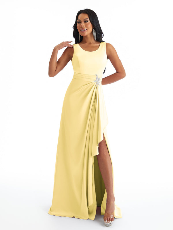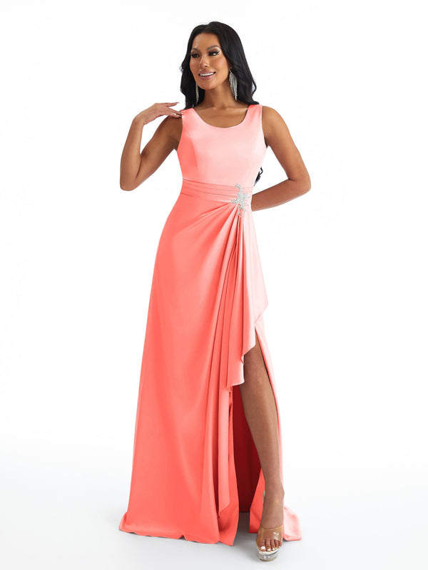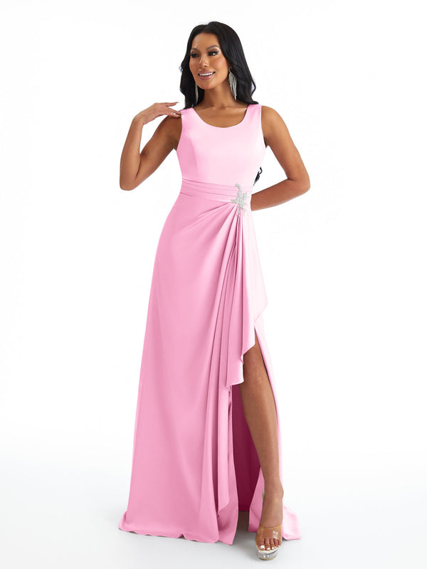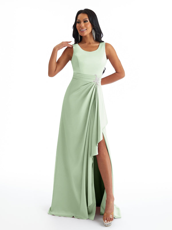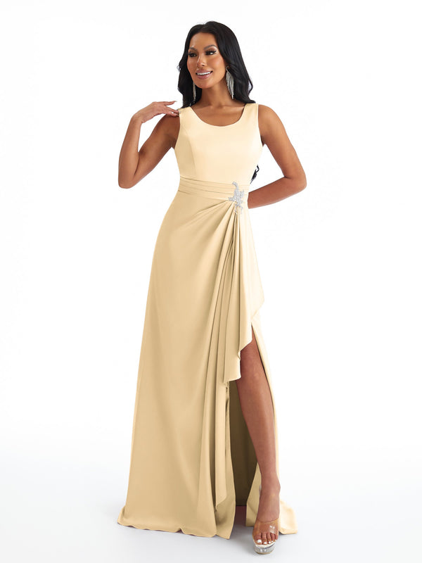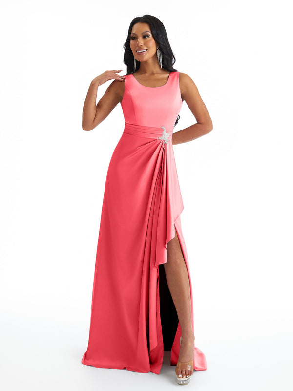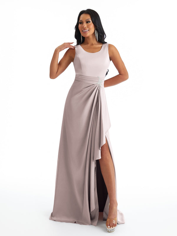 Elegant Scoop Side Slit Lace Applique A-Line Pleated Satin Pretty Long Bridesmaid Dresses